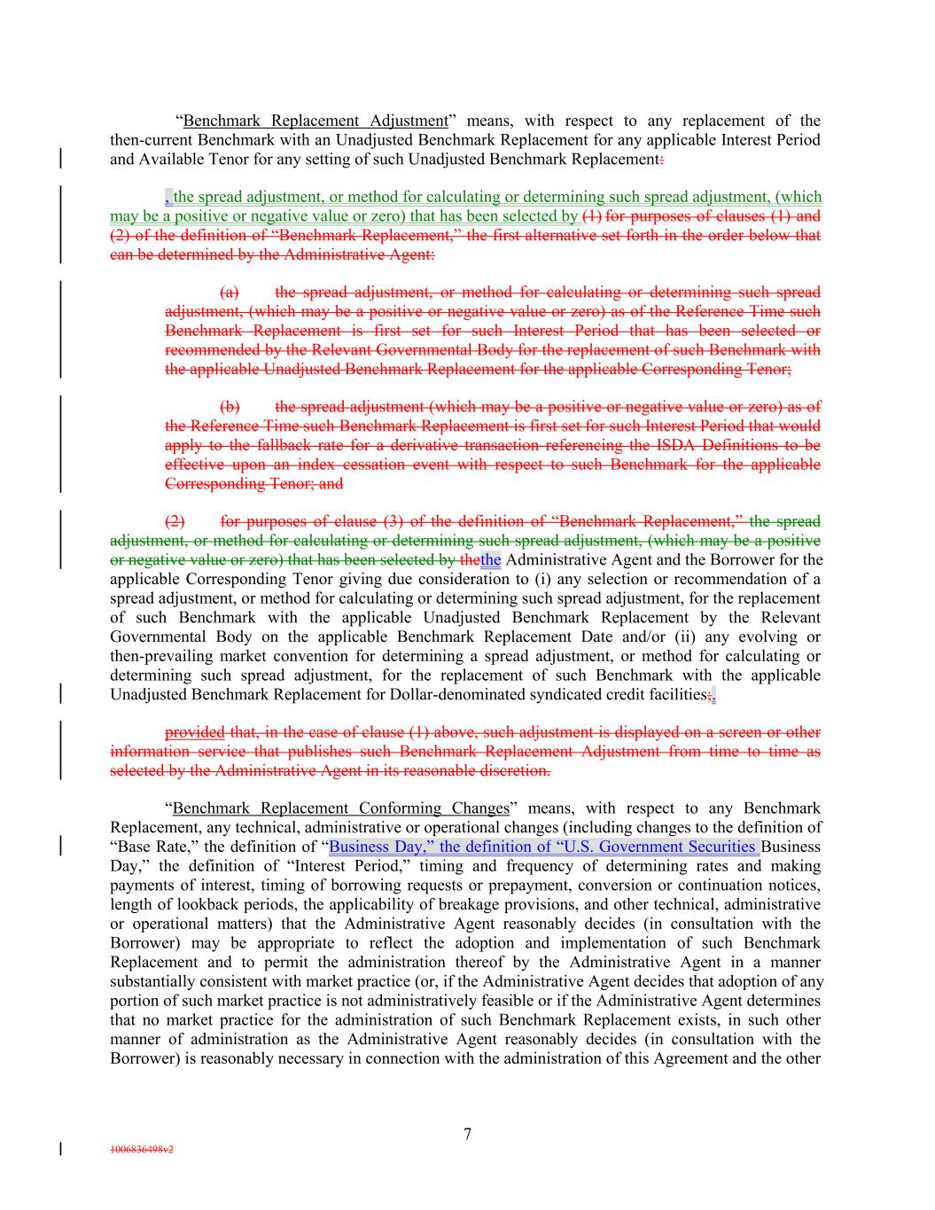 “Benchmark Replacement Adjustment” means, with respect to any replacement of the then-current Benchmark with an Unadjusted Benchmark Replacement for any applicable Interest Period and Available Tenor for any setting of such Unadjusted Benchmark Replacement: , the spread adjustment, or method for calculating or determining such spread adjustment, (which may be a positive or negative value or zero) that has been selected by (1) for purposes of clauses (1) and (2) of the definition of “Benchmark Replacement,” the first alternative set forth in the order below that can be determined by the Administrative Agent: (a) the spread adjustment, or method for calculating or determining such spread adjustment, (which may be a positive or negative value or zero) as of the Reference Time such Benchmark Replacement is first set for such Interest Period that has been selected or recommended by the Relevant Governmental Body for the replacement of such Benchmark with the applicable Unadjusted Benchmark Replacement for the applicable Corresponding Tenor; (b) the spread adjustment (which may be a positive or negative value or zero) as of the Reference Time such Benchmark Replacement is first set for such Interest Period that would apply to the fallback rate for a derivative transaction referencing the ISDA Definitions to be effective upon an index cessation event with respect to such Benchmark for the applicable Corresponding Tenor; and (2) for purposes of clause (3) of the definition of “Benchmark Replacement,” the spread adjustment, or method for calculating or determining such spread adjustment, (which may be a positive or negative value or zero) that has been selected by thethe Administrative Agent and the Borrower for the applicable Corresponding Tenor giving due consideration to (i) any selection or recommendation of a spread adjustment, or method for calculating or determining such spread adjustment, for the replacement of such Benchmark with the applicable Unadjusted Benchmark Replacement by the Relevant Governmental Body on the applicable Benchmark Replacement Date and/or (ii) any evolving or then-prevailing market convention for determining a spread adjustment, or method for calculating or determining such spread adjustment, for the replacement of such Benchmark with the applicable Unadjusted Benchmark Replacement for Dollar-denominated syndicated credit facilities;. provided that, in the case of clause (1) above, such adjustment is displayed on a screen or other information service that publishes such Benchmark Replacement Adjustment from time to time as selected by the Administrative Agent in its reasonable discretion. “Benchmark Replacement Conforming Changes” means, with respect to any Benchmark Replacement, any technical, administrative or operational changes (including changes to the definition of “Base Rate,” the definition of “Business Day,” the definition of “U.S. Government Securities Business Day,” the definition of “Interest Period,” timing and frequency of determining rates and making payments of interest, timing of borrowing requests or prepayment, conversion or continuation notices, length of lookback periods, the applicability of breakage provisions, and other technical, administrative or operational matters) that the Administrative Agent reasonably decides (in consultation with the Borrower) may be appropriate to reflect the adoption and implementation of such Benchmark Replacement and to permit the administration thereof by the Administrative Agent in a manner substantially consistent with market practice (or, if the Administrative Agent decides that adoption of any portion of such market practice is not administratively feasible or if the Administrative Agent determines that no market practice for the administration of such Benchmark Replacement exists, in such other manner of administration as the Administrative Agent reasonably decides (in consultation with the Borrower) is reasonably necessary in connection with the administration of this Agreement and the other 7 1006836498v2