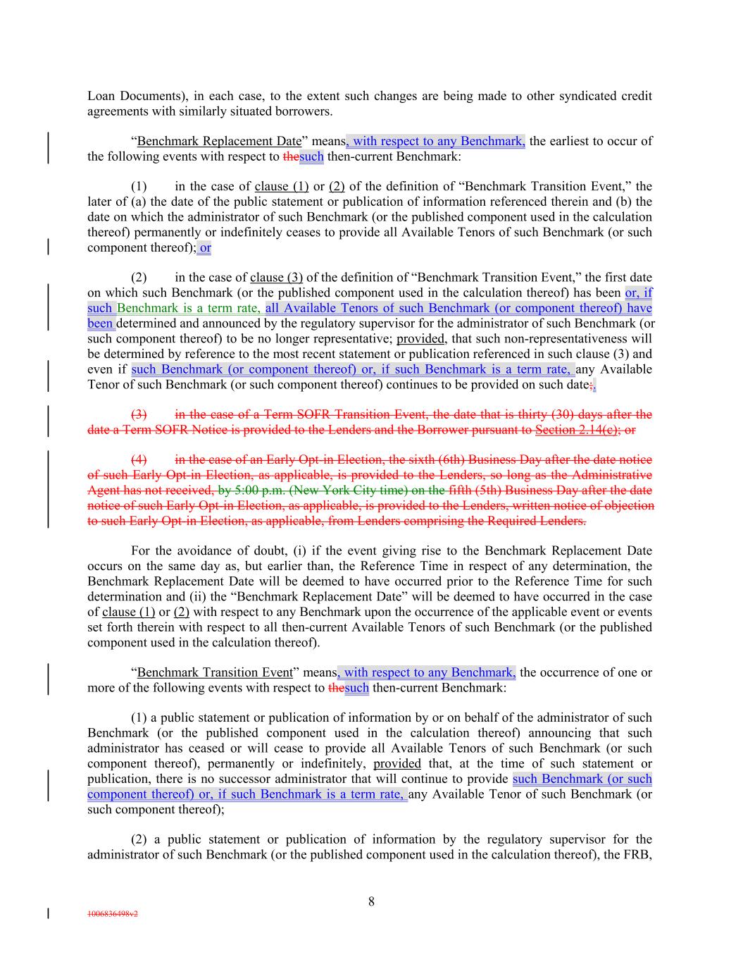 Loan Documents), in each case, to the extent such changes are being made to other syndicated credit agreements with similarly situated borrowers. “Benchmark Replacement Date” means, with respect to any Benchmark, the earliest to occur of the following events with respect to thesuch then-current Benchmark: (1) in the case of clause (1) or (2) of the definition of “Benchmark Transition Event,” the later of (a) the date of the public statement or publication of information referenced therein and (b) the date on which the administrator of such Benchmark (or the published component used in the calculation thereof) permanently or indefinitely ceases to provide all Available Tenors of such Benchmark (or such component thereof); or (2) in the case of clause (3) of the definition of “Benchmark Transition Event,” the first date on which such Benchmark (or the published component used in the calculation thereof) has been or, if such Benchmark is a term rate, all Available Tenors of such Benchmark (or component thereof) have been determined and announced by the regulatory supervisor for the administrator of such Benchmark (or such component thereof) to be no longer representative; provided, that such non-representativeness will be determined by reference to the most recent statement or publication referenced in such clause (3) and even if such Benchmark (or component thereof) or, if such Benchmark is a term rate, any Available Tenor of such Benchmark (or such component thereof) continues to be provided on such date;. (3) in the case of a Term SOFR Transition Event, the date that is thirty (30) days after the date a Term SOFR Notice is provided to the Lenders and the Borrower pursuant to Section 2.14(c); or (4) in the case of an Early Opt-in Election, the sixth (6th) Business Day after the date notice of such Early Opt-in Election, as applicable, is provided to the Lenders, so long as the Administrative Agent has not received, by 5:00 p.m. (New York City time) on the fifth (5th) Business Day after the date notice of such Early Opt-in Election, as applicable, is provided to the Lenders, written notice of objection to such Early Opt-in Election, as applicable, from Lenders comprising the Required Lenders. For the avoidance of doubt, (i) if the event giving rise to the Benchmark Replacement Date occurs on the same day as, but earlier than, the Reference Time in respect of any determination, the Benchmark Replacement Date will be deemed to have occurred prior to the Reference Time for such determination and (ii) the “Benchmark Replacement Date” will be deemed to have occurred in the case of clause (1) or (2) with respect to any Benchmark upon the occurrence of the applicable event or events set forth therein with respect to all then-current Available Tenors of such Benchmark (or the published component used in the calculation thereof). “Benchmark Transition Event” means, with respect to any Benchmark, the occurrence of one or more of the following events with respect to thesuch then-current Benchmark: (1) a public statement or publication of information by or on behalf of the administrator of such Benchmark (or the published component used in the calculation thereof) announcing that such administrator has ceased or will cease to provide all Available Tenors of such Benchmark (or such component thereof), permanently or indefinitely, provided that, at the time of such statement or publication, there is no successor administrator that will continue to provide such Benchmark (or such component thereof) or, if such Benchmark is a term rate, any Available Tenor of such Benchmark (or such component thereof); (2) a public statement or publication of information by the regulatory supervisor for the administrator of such Benchmark (or the published component used in the calculation thereof), the FRB, 8 1006836498v2
