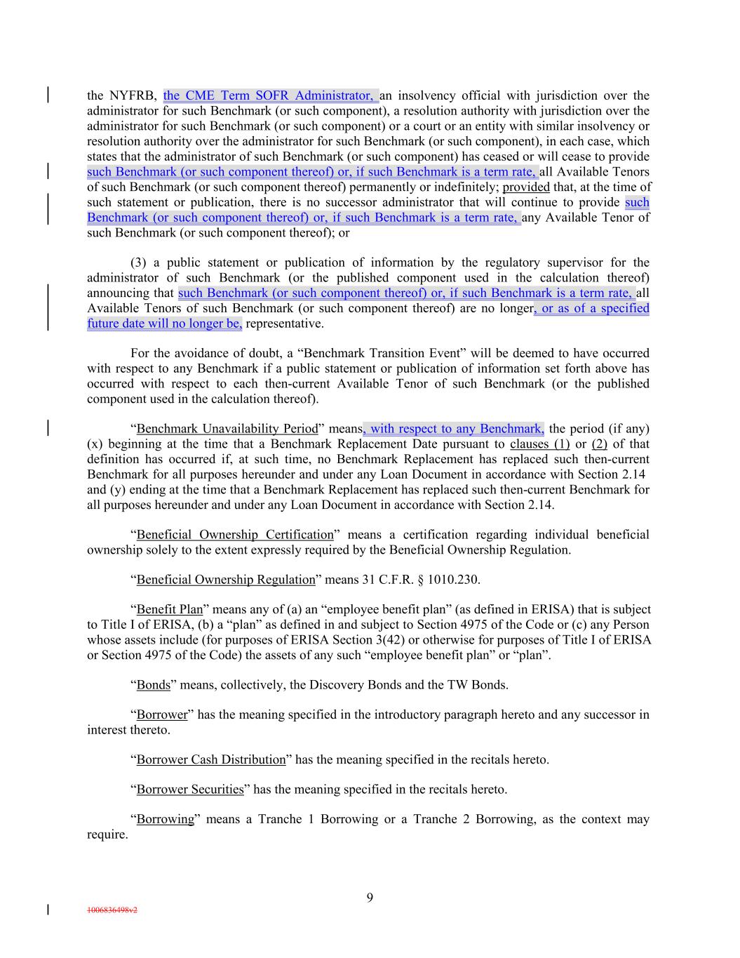 the NYFRB, the CME Term SOFR Administrator, an insolvency official with jurisdiction over the administrator for such Benchmark (or such component), a resolution authority with jurisdiction over the administrator for such Benchmark (or such component) or a court or an entity with similar insolvency or resolution authority over the administrator for such Benchmark (or such component), in each case, which states that the administrator of such Benchmark (or such component) has ceased or will cease to provide such Benchmark (or such component thereof) or, if such Benchmark is a term rate, all Available Tenors of such Benchmark (or such component thereof) permanently or indefinitely; provided that, at the time of such statement or publication, there is no successor administrator that will continue to provide such Benchmark (or such component thereof) or, if such Benchmark is a term rate, any Available Tenor of such Benchmark (or such component thereof); or (3) a public statement or publication of information by the regulatory supervisor for the administrator of such Benchmark (or the published component used in the calculation thereof) announcing that such Benchmark (or such component thereof) or, if such Benchmark is a term rate, all Available Tenors of such Benchmark (or such component thereof) are no longer, or as of a specified future date will no longer be, representative. For the avoidance of doubt, a “Benchmark Transition Event” will be deemed to have occurred with respect to any Benchmark if a public statement or publication of information set forth above has occurred with respect to each then-current Available Tenor of such Benchmark (or the published component used in the calculation thereof). “Benchmark Unavailability Period” means, with respect to any Benchmark, the period (if any) (x) beginning at the time that a Benchmark Replacement Date pursuant to clauses (1) or (2) of that definition has occurred if, at such time, no Benchmark Replacement has replaced such then-current Benchmark for all purposes hereunder and under any Loan Document in accordance with Section 2.14 and (y) ending at the time that a Benchmark Replacement has replaced such then-current Benchmark for all purposes hereunder and under any Loan Document in accordance with Section 2.14. “Beneficial Ownership Certification” means a certification regarding individual beneficial ownership solely to the extent expressly required by the Beneficial Ownership Regulation. “Beneficial Ownership Regulation” means 31 C.F.R. § 1010.230. “Benefit Plan” means any of (a) an “employee benefit plan” (as defined in ERISA) that is subject to Title I of ERISA, (b) a “plan” as defined in and subject to Section 4975 of the Code or (c) any Person whose assets include (for purposes of ERISA Section 3(42) or otherwise for purposes of Title I of ERISA or Section 4975 of the Code) the assets of any such “employee benefit plan” or “plan”. “Bonds” means, collectively, the Discovery Bonds and the TW Bonds. “Borrower” has the meaning specified in the introductory paragraph hereto and any successor in interest thereto. “Borrower Cash Distribution” has the meaning specified in the recitals hereto. “Borrower Securities” has the meaning specified in the recitals hereto. “Borrowing” means a Tranche 1 Borrowing or a Tranche 2 Borrowing, as the context may require. 9 1006836498v2