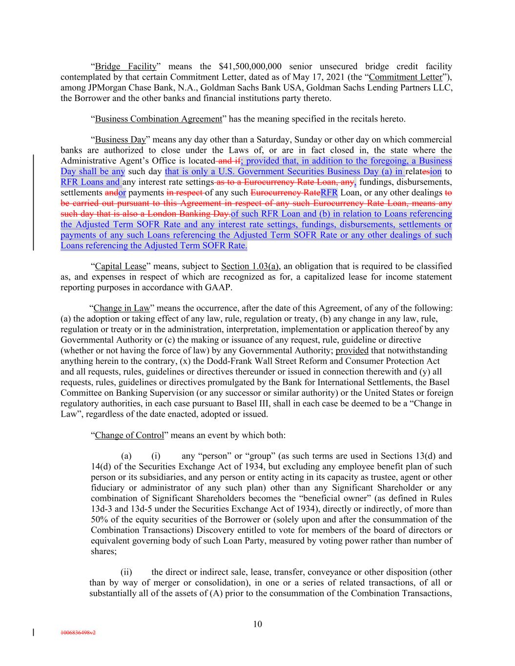 “Bridge Facility” means the $41,500,000,000 senior unsecured bridge credit facility contemplated by that certain Commitment Letter, dated as of May 17, 2021 (the “Commitment Letter”), among JPMorgan Chase Bank, N.A., Goldman Sachs Bank USA, Goldman Sachs Lending Partners LLC, the Borrower and the other banks and financial institutions party thereto. “Business Combination Agreement” has the meaning specified in the recitals hereto. “Business Day” means any day other than a Saturday, Sunday or other day on which commercial banks are authorized to close under the Laws of, or are in fact closed in, the state where the Administrative Agent’s Office is located and if; provided that, in addition to the foregoing, a Business Day shall be any such day that is only a U.S. Government Securities Business Day (a) in relatesion to RFR Loans and any interest rate settings as to a Eurocurrency Rate Loan, any, fundings, disbursements, settlements andor payments in respect of any such Eurocurrency RateRFR Loan, or any other dealings to be carried out pursuant to this Agreement in respect of any such Eurocurrency Rate Loan, means any such day that is also a London Banking Day.of such RFR Loan and (b) in relation to Loans referencing the Adjusted Term SOFR Rate and any interest rate settings, fundings, disbursements, settlements or payments of any such Loans referencing the Adjusted Term SOFR Rate or any other dealings of such Loans referencing the Adjusted Term SOFR Rate. “Capital Lease” means, subject to Section 1.03(a), an obligation that is required to be classified as, and expenses in respect of which are recognized as for, a capitalized lease for income statement reporting purposes in accordance with GAAP. “Change in Law” means the occurrence, after the date of this Agreement, of any of the following: (a) the adoption or taking effect of any law, rule, regulation or treaty, (b) any change in any law, rule, regulation or treaty or in the administration, interpretation, implementation or application thereof by any Governmental Authority or (c) the making or issuance of any request, rule, guideline or directive (whether or not having the force of law) by any Governmental Authority; provided that notwithstanding anything herein to the contrary, (x) the Dodd-Frank Wall Street Reform and Consumer Protection Act and all requests, rules, guidelines or directives thereunder or issued in connection therewith and (y) all requests, rules, guidelines or directives promulgated by the Bank for International Settlements, the Basel Committee on Banking Supervision (or any successor or similar authority) or the United States or foreign regulatory authorities, in each case pursuant to Basel III, shall in each case be deemed to be a “Change in Law”, regardless of the date enacted, adopted or issued. “Change of Control” means an event by which both: (a) (i) any “person” or “group” (as such terms are used in Sections 13(d) and 14(d) of the Securities Exchange Act of 1934, but excluding any employee benefit plan of such person or its subsidiaries, and any person or entity acting in its capacity as trustee, agent or other fiduciary or administrator of any such plan) other than any Significant Shareholder or any combination of Significant Shareholders becomes the “beneficial owner” (as defined in Rules 13d-3 and 13d-5 under the Securities Exchange Act of 1934), directly or indirectly, of more than 50% of the equity securities of the Borrower or (solely upon and after the consummation of the Combination Transactions) Discovery entitled to vote for members of the board of directors or equivalent governing body of such Loan Party, measured by voting power rather than number of shares; (ii) the direct or indirect sale, lease, transfer, conveyance or other disposition (other than by way of merger or consolidation), in one or a series of related transactions, of all or substantially all of the assets of (A) prior to the consummation of the Combination Transactions, 10 1006836498v2