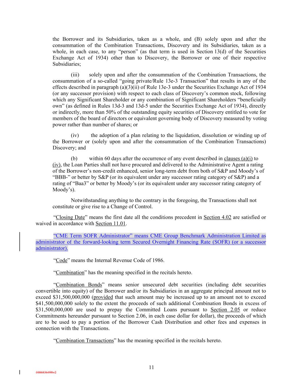 the Borrower and its Subsidiaries, taken as a whole, and (B) solely upon and after the consummation of the Combination Transactions, Discovery and its Subsidiaries, taken as a whole, in each case, to any “person” (as that term is used in Section 13(d) of the Securities Exchange Act of 1934) other than to Discovery, the Borrower or one of their respective Subsidiaries; (iii) solely upon and after the consummation of the Combination Transactions, the consummation of a so-called “going private/Rule 13e-3 Transaction” that results in any of the effects described in paragraph (a)(3)(ii) of Rule 13e-3 under the Securities Exchange Act of 1934 (or any successor provision) with respect to each class of Discovery’s common stock, following which any Significant Shareholder or any combination of Significant Shareholders “beneficially own” (as defined in Rules 13d-3 and 13d-5 under the Securities Exchange Act of 1934), directly or indirectly, more than 50% of the outstanding equity securities of Discovery entitled to vote for members of the board of directors or equivalent governing body of Discovery measured by voting power rather than number of shares; or (iv) the adoption of a plan relating to the liquidation, dissolution or winding up of the Borrower or (solely upon and after the consummation of the Combination Transactions) Discovery; and (b) within 60 days after the occurrence of any event described in clauses (a)(i) to (iv), the Loan Parties shall not have procured and delivered to the Administrative Agent a rating of the Borrower’s non-credit enhanced, senior long-term debt from both of S&P and Moody’s of “BBB-” or better by S&P (or its equivalent under any successor rating category of S&P) and a rating of “Baa3” or better by Moody’s (or its equivalent under any successor rating category of Moody’s). Notwithstanding anything to the contrary in the foregoing, the Transactions shall not constitute or give rise to a Change of Control. “Closing Date” means the first date all the conditions precedent in Section 4.02 are satisfied or waived in accordance with Section 11.01. “CME Term SOFR Administrator” means CME Group Benchmark Administration Limited as administrator of the forward-looking term Secured Overnight Financing Rate (SOFR) (or a successor administrator). “Code” means the Internal Revenue Code of 1986. “Combination” has the meaning specified in the recitals hereto. “Combination Bonds” means senior unsecured debt securities (including debt securities convertible into equity) of the Borrower and/or its Subsidiaries in an aggregate principal amount not to exceed $31,500,000,000 (provided that such amount may be increased up to an amount not to exceed $41,500,000,000 solely to the extent the proceeds of such additional Combination Bonds in excess of $31,500,000,000 are used to prepay the Committed Loans pursuant to Section 2.05 or reduce Commitments hereunder pursuant to Section 2.06, in each case dollar for dollar), the proceeds of which are to be used to pay a portion of the Borrower Cash Distribution and other fees and expenses in connection with the Transactions. “Combination Transactions” has the meaning specified in the recitals hereto. 11 1006836498v2