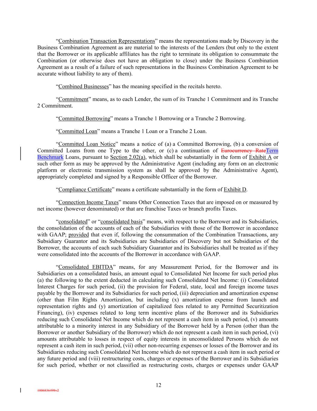 “Combination Transaction Representations” means the representations made by Discovery in the Business Combination Agreement as are material to the interests of the Lenders (but only to the extent that the Borrower or its applicable affiliates has the right to terminate its obligation to consummate the Combination (or otherwise does not have an obligation to close) under the Business Combination Agreement as a result of a failure of such representations in the Business Combination Agreement to be accurate without liability to any of them). “Combined Businesses” has the meaning specified in the recitals hereto. “Commitment” means, as to each Lender, the sum of its Tranche 1 Commitment and its Tranche 2 Commitment. “Committed Borrowing” means a Tranche 1 Borrowing or a Tranche 2 Borrowing. “Committed Loan” means a Tranche 1 Loan or a Tranche 2 Loan. “Committed Loan Notice” means a notice of (a) a Committed Borrowing, (b) a conversion of Committed Loans from one Type to the other, or (c) a continuation of Eurocurrency RateTerm Benchmark Loans, pursuant to Section 2.02(a), which shall be substantially in the form of Exhibit A or such other form as may be approved by the Administrative Agent (including any form on an electronic platform or electronic transmission system as shall be approved by the Administrative Agent), appropriately completed and signed by a Responsible Officer of the Borrower. “Compliance Certificate” means a certificate substantially in the form of Exhibit D. “Connection Income Taxes” means Other Connection Taxes that are imposed on or measured by net income (however denominated) or that are franchise Taxes or branch profits Taxes. “consolidated” or “consolidated basis” means, with respect to the Borrower and its Subsidiaries, the consolidation of the accounts of each of the Subsidiaries with those of the Borrower in accordance with GAAP; provided that even if, following the consummation of the Combination Transactions, any Subsidiary Guarantor and its Subsidiaries are Subsidiaries of Discovery but not Subsidiaries of the Borrower, the accounts of each such Subsidiary Guarantor and its Subsidiaries shall be treated as if they were consolidated into the accounts of the Borrower in accordance with GAAP. “Consolidated EBITDA” means, for any Measurement Period, for the Borrower and its Subsidiaries on a consolidated basis, an amount equal to Consolidated Net Income for such period plus (a) the following to the extent deducted in calculating such Consolidated Net Income: (i) Consolidated Interest Charges for such period, (ii) the provision for Federal, state, local and foreign income taxes payable by the Borrower and its Subsidiaries for such period, (iii) depreciation and amortization expense (other than Film Rights Amortization, but including (x) amortization expense from launch and representation rights and (y) amortization of capitalized fees related to any Permitted Securitization Financing), (iv) expenses related to long term incentive plans of the Borrower and its Subsidiaries reducing such Consolidated Net Income which do not represent a cash item in such period, (v) amounts attributable to a minority interest in any Subsidiary of the Borrower held by a Person (other than the Borrower or another Subsidiary of the Borrower) which do not represent a cash item in such period, (vi) amounts attributable to losses in respect of equity interests in unconsolidated Persons which do not represent a cash item in such period, (vii) other non-recurring expenses or losses of the Borrower and its Subsidiaries reducing such Consolidated Net Income which do not represent a cash item in such period or any future period and (viii) restructuring costs, charges or expenses of the Borrower and its Subsidiaries for such period, whether or not classified as restructuring costs, charges or expenses under GAAP 12 1006836498v2