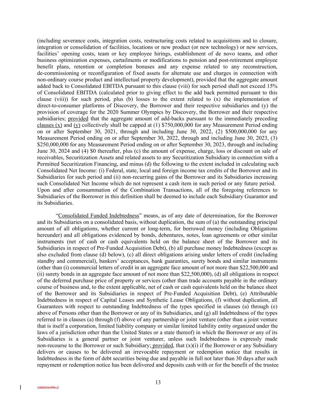 (including severance costs, integration costs, restructuring costs related to acquisitions and to closure, integration or consolidation of facilities, locations or new product (or new technology) or new services, facilities’ opening costs, team or key employee hirings, establishment of de novo teams, and other business optimization expenses, curtailments or modifications to pension and post-retirement employee benefit plans, retention or completion bonuses and any expense related to any reconstruction, de-commissioning or reconfiguration of fixed assets for alternate use and charges in connection with non-ordinary course product and intellectual property development), provided that the aggregate amount added back to Consolidated EBITDA pursuant to this clause (viii) for such period shall not exceed 15% of Consolidated EBITDA (calculated prior to giving effect to the add back permitted pursuant to this clause (viii)) for such period, plus (b) losses to the extent related to (x) the implementation of direct-to-consumer platforms of Discovery, the Borrower and their respective subsidiaries and (y) the provision of coverage for the 2020 Summer Olympics by Discovery, the Borrower and their respective subsidiaries; provided that the aggregate amount of add-backs pursuant to the immediately preceding clauses (x) and (y) collectively shall be capped at (1) $750,000,000 for any Measurement Period ending on or after September 30, 2021, through and including June 30, 2022, (2) $500,000,000 for any Measurement Period ending on or after September 30, 2022, through and including June 30, 2023, (3) $250,000,000 for any Measurement Period ending on or after September 30, 2023, through and including June 30, 2024 and (4) $0 thereafter, plus (c) the amount of expense, charge, loss or discount on sale of receivables, Securitization Assets and related assets to any Securitization Subsidiary in connection with a Permitted Securitization Financing, and minus (d) the following to the extent included in calculating such Consolidated Net Income: (i) Federal, state, local and foreign income tax credits of the Borrower and its Subsidiaries for such period and (ii) non-recurring gains of the Borrower and its Subsidiaries increasing such Consolidated Net Income which do not represent a cash item in such period or any future period. Upon and after consummation of the Combination Transactions, all of the foregoing references to Subsidiaries of the Borrower in this definition shall be deemed to include each Subsidiary Guarantor and its Subsidiaries. “Consolidated Funded Indebtedness” means, as of any date of determination, for the Borrower and its Subsidiaries on a consolidated basis, without duplication, the sum of (a) the outstanding principal amount of all obligations, whether current or long-term, for borrowed money (including Obligations hereunder) and all obligations evidenced by bonds, debentures, notes, loan agreements or other similar instruments (net of cash or cash equivalents held on the balance sheet of the Borrower and its Subsidiaries in respect of Pre-Funded Acquisition Debt), (b) all purchase money Indebtedness (except as also excluded from clause (d) below), (c) all direct obligations arising under letters of credit (including standby and commercial), bankers’ acceptances, bank guaranties, surety bonds and similar instruments (other than (i) commercial letters of credit in an aggregate face amount of not more than $22,500,000 and (ii) surety bonds in an aggregate face amount of not more than $22,500,000), (d) all obligations in respect of the deferred purchase price of property or services (other than trade accounts payable in the ordinary course of business and, to the extent applicable, net of cash or cash equivalents held on the balance sheet of the Borrower and its Subsidiaries in respect of Pre-Funded Acquisition Debt), (e) Attributable Indebtedness in respect of Capital Leases and Synthetic Lease Obligations, (f) without duplication, all Guarantees with respect to outstanding Indebtedness of the types specified in clauses (a) through (e) above of Persons other than the Borrower or any of its Subsidiaries, and (g) all Indebtedness of the types referred to in clauses (a) through (f) above of any partnership or joint venture (other than a joint venture that is itself a corporation, limited liability company or similar limited liability entity organized under the laws of a jurisdiction other than the United States or a state thereof) in which the Borrower or any of its Subsidiaries is a general partner or joint venturer, unless such Indebtedness is expressly made non-recourse to the Borrower or such Subsidiary; provided, that (x)(i) if the Borrower or any Subsidiary delivers or causes to be delivered an irrevocable repayment or redemption notice that results in Indebtedness in the form of debt securities being due and payable in full not later than 30 days after such repayment or redemption notice has been delivered and deposits cash with or for the benefit of the trustee 13 1006836498v2