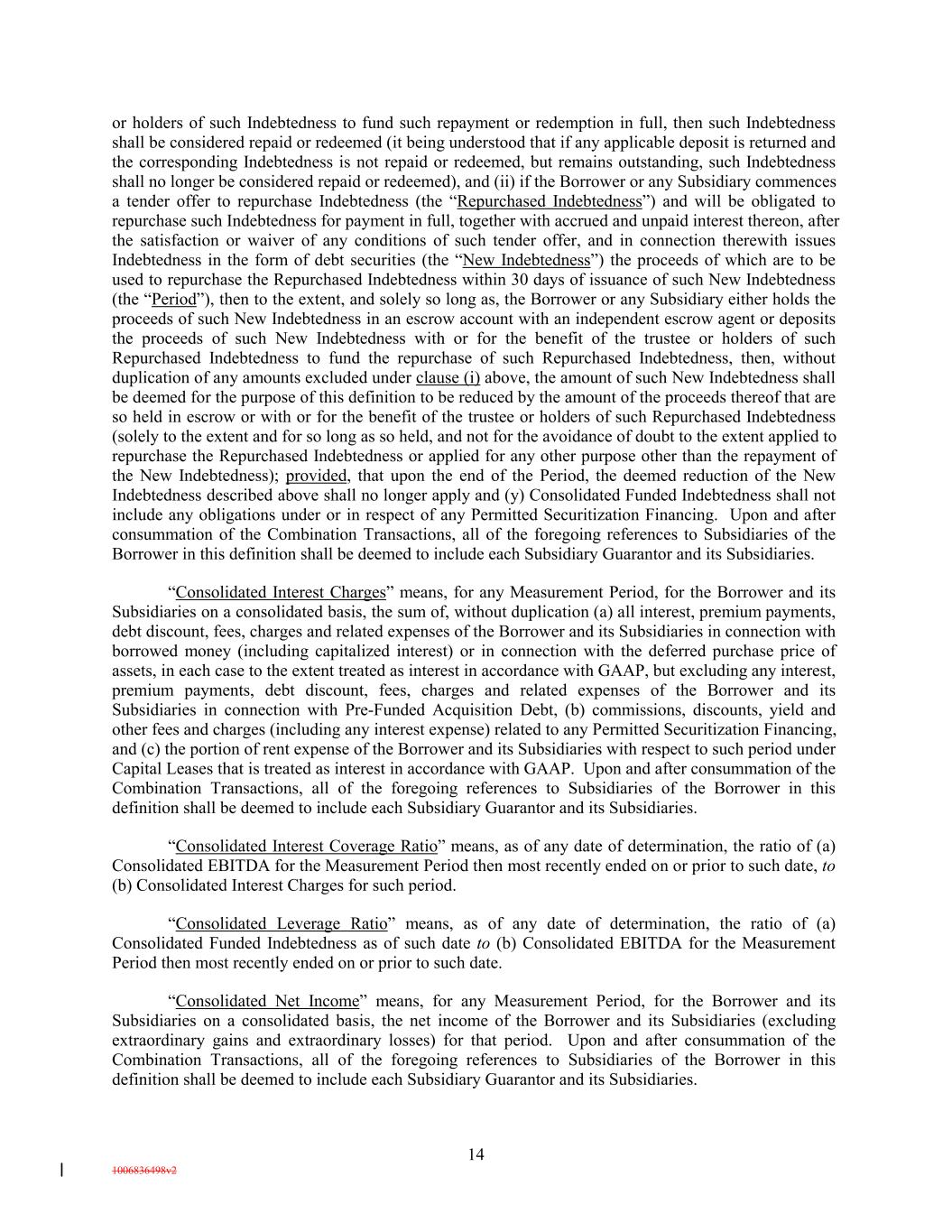 or holders of such Indebtedness to fund such repayment or redemption in full, then such Indebtedness shall be considered repaid or redeemed (it being understood that if any applicable deposit is returned and the corresponding Indebtedness is not repaid or redeemed, but remains outstanding, such Indebtedness shall no longer be considered repaid or redeemed), and (ii) if the Borrower or any Subsidiary commences a tender offer to repurchase Indebtedness (the “Repurchased Indebtedness”) and will be obligated to repurchase such Indebtedness for payment in full, together with accrued and unpaid interest thereon, after the satisfaction or waiver of any conditions of such tender offer, and in connection therewith issues Indebtedness in the form of debt securities (the “New Indebtedness”) the proceeds of which are to be used to repurchase the Repurchased Indebtedness within 30 days of issuance of such New Indebtedness (the “Period”), then to the extent, and solely so long as, the Borrower or any Subsidiary either holds the proceeds of such New Indebtedness in an escrow account with an independent escrow agent or deposits the proceeds of such New Indebtedness with or for the benefit of the trustee or holders of such Repurchased Indebtedness to fund the repurchase of such Repurchased Indebtedness, then, without duplication of any amounts excluded under clause (i) above, the amount of such New Indebtedness shall be deemed for the purpose of this definition to be reduced by the amount of the proceeds thereof that are so held in escrow or with or for the benefit of the trustee or holders of such Repurchased Indebtedness (solely to the extent and for so long as so held, and not for the avoidance of doubt to the extent applied to repurchase the Repurchased Indebtedness or applied for any other purpose other than the repayment of the New Indebtedness); provided, that upon the end of the Period, the deemed reduction of the New Indebtedness described above shall no longer apply and (y) Consolidated Funded Indebtedness shall not include any obligations under or in respect of any Permitted Securitization Financing. Upon and after consummation of the Combination Transactions, all of the foregoing references to Subsidiaries of the Borrower in this definition shall be deemed to include each Subsidiary Guarantor and its Subsidiaries. “Consolidated Interest Charges” means, for any Measurement Period, for the Borrower and its Subsidiaries on a consolidated basis, the sum of, without duplication (a) all interest, premium payments, debt discount, fees, charges and related expenses of the Borrower and its Subsidiaries in connection with borrowed money (including capitalized interest) or in connection with the deferred purchase price of assets, in each case to the extent treated as interest in accordance with GAAP, but excluding any interest, premium payments, debt discount, fees, charges and related expenses of the Borrower and its Subsidiaries in connection with Pre-Funded Acquisition Debt, (b) commissions, discounts, yield and other fees and charges (including any interest expense) related to any Permitted Securitization Financing, and (c) the portion of rent expense of the Borrower and its Subsidiaries with respect to such period under Capital Leases that is treated as interest in accordance with GAAP. Upon and after consummation of the Combination Transactions, all of the foregoing references to Subsidiaries of the Borrower in this definition shall be deemed to include each Subsidiary Guarantor and its Subsidiaries. “Consolidated Interest Coverage Ratio” means, as of any date of determination, the ratio of (a) Consolidated EBITDA for the Measurement Period then most recently ended on or prior to such date, to (b) Consolidated Interest Charges for such period. “Consolidated Leverage Ratio” means, as of any date of determination, the ratio of (a) Consolidated Funded Indebtedness as of such date to (b) Consolidated EBITDA for the Measurement Period then most recently ended on or prior to such date. “Consolidated Net Income” means, for any Measurement Period, for the Borrower and its Subsidiaries on a consolidated basis, the net income of the Borrower and its Subsidiaries (excluding extraordinary gains and extraordinary losses) for that period. Upon and after consummation of the Combination Transactions, all of the foregoing references to Subsidiaries of the Borrower in this definition shall be deemed to include each Subsidiary Guarantor and its Subsidiaries. 14 1006836498v2