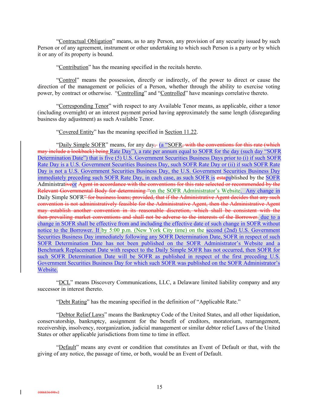 “Contractual Obligation” means, as to any Person, any provision of any security issued by such Person or of any agreement, instrument or other undertaking to which such Person is a party or by which it or any of its property is bound. “Contribution” has the meaning specified in the recitals hereto. “Control” means the possession, directly or indirectly, of the power to direct or cause the direction of the management or policies of a Person, whether through the ability to exercise voting power, by contract or otherwise. “Controlling” and “Controlled” have meanings correlative thereto. “Corresponding Tenor” with respect to any Available Tenor means, as applicable, either a tenor (including overnight) or an interest payment period having approximately the same length (disregarding business day adjustment) as such Available Tenor. “Covered Entity” has the meaning specified in Section 11.22. “Daily Simple SOFR” means, for any day, (a “SOFR, with the conventions for this rate (which may include a lookback) being Rate Day”), a rate per annum equal to SOFR for the day (such day “SOFR Determination Date”) that is five (5) U.S. Government Securities Business Days prior to (i) if such SOFR Rate Day is a U.S. Government Securities Business Day, such SOFR Rate Day or (ii) if such SOFR Rate Day is not a U.S. Government Securities Business Day, the U.S. Government Securities Business Day immediately preceding such SOFR Rate Day, in each case, as such SOFR is estapublished by the SOFR Administrativeor Agent in accordance with the conventions for this rate selected or recommended by the Relevant Governmental Body for determining “on the SOFR Administrator’s Website. Any change in Daily Simple SOFR” for business loans; provided, that if the Administrative Agent decides that any such convention is not administratively feasible for the Administrative Agent, then the Administrative Agent may establish another convention in its reasonable discretion, which shall be consistent with the then-prevailing market conventions and shall not be adverse to the interests of the Borrower. due to a change in SOFR shall be effective from and including the effective date of such change in SOFR without notice to the Borrower. If by 5:00 p.m. (New York City time) on the second (2nd) U.S. Government Securities Business Day immediately following any SOFR Determination Date, SOFR in respect of such SOFR Determination Date has not been published on the SOFR Administrator’s Website and a Benchmark Replacement Date with respect to the Daily Simple SOFR has not occurred, then SOFR for such SOFR Determination Date will be SOFR as published in respect of the first preceding U.S. Government Securities Business Day for which such SOFR was published on the SOFR Administrator’s Website. “DCL” means Discovery Communications, LLC, a Delaware limited liability company and any successor in interest thereto. “Debt Rating” has the meaning specified in the definition of “Applicable Rate.” “Debtor Relief Laws” means the Bankruptcy Code of the United States, and all other liquidation, conservatorship, bankruptcy, assignment for the benefit of creditors, moratorium, rearrangement, receivership, insolvency, reorganization, judicial management or similar debtor relief Laws of the United States or other applicable jurisdictions from time to time in effect. “Default” means any event or condition that constitutes an Event of Default or that, with the giving of any notice, the passage of time, or both, would be an Event of Default. 15 1006836498v2