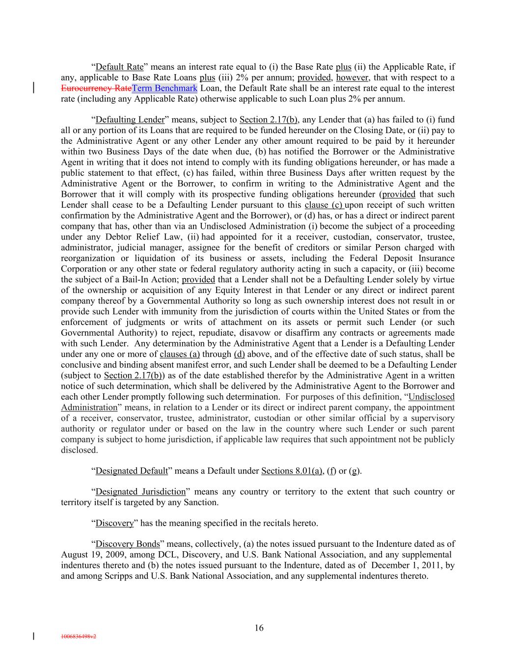 “Default Rate” means an interest rate equal to (i) the Base Rate plus (ii) the Applicable Rate, if any, applicable to Base Rate Loans plus (iii) 2% per annum; provided, however, that with respect to a Eurocurrency RateTerm Benchmark Loan, the Default Rate shall be an interest rate equal to the interest rate (including any Applicable Rate) otherwise applicable to such Loan plus 2% per annum. “Defaulting Lender” means, subject to Section 2.17(b), any Lender that (a) has failed to (i) fund all or any portion of its Loans that are required to be funded hereunder on the Closing Date, or (ii) pay to the Administrative Agent or any other Lender any other amount required to be paid by it hereunder within two Business Days of the date when due, (b) has notified the Borrower or the Administrative Agent in writing that it does not intend to comply with its funding obligations hereunder, or has made a public statement to that effect, (c) has failed, within three Business Days after written request by the Administrative Agent or the Borrower, to confirm in writing to the Administrative Agent and the Borrower that it will comply with its prospective funding obligations hereunder (provided that such Lender shall cease to be a Defaulting Lender pursuant to this clause (c) upon receipt of such written confirmation by the Administrative Agent and the Borrower), or (d) has, or has a direct or indirect parent company that has, other than via an Undisclosed Administration (i) become the subject of a proceeding under any Debtor Relief Law, (ii) had appointed for it a receiver, custodian, conservator, trustee, administrator, judicial manager, assignee for the benefit of creditors or similar Person charged with reorganization or liquidation of its business or assets, including the Federal Deposit Insurance Corporation or any other state or federal regulatory authority acting in such a capacity, or (iii) become the subject of a Bail-In Action; provided that a Lender shall not be a Defaulting Lender solely by virtue of the ownership or acquisition of any Equity Interest in that Lender or any direct or indirect parent company thereof by a Governmental Authority so long as such ownership interest does not result in or provide such Lender with immunity from the jurisdiction of courts within the United States or from the enforcement of judgments or writs of attachment on its assets or permit such Lender (or such Governmental Authority) to reject, repudiate, disavow or disaffirm any contracts or agreements made with such Lender. Any determination by the Administrative Agent that a Lender is a Defaulting Lender under any one or more of clauses (a) through (d) above, and of the effective date of such status, shall be conclusive and binding absent manifest error, and such Lender shall be deemed to be a Defaulting Lender (subject to Section 2.17(b)) as of the date established therefor by the Administrative Agent in a written notice of such determination, which shall be delivered by the Administrative Agent to the Borrower and each other Lender promptly following such determination. For purposes of this definition, “Undisclosed Administration” means, in relation to a Lender or its direct or indirect parent company, the appointment of a receiver, conservator, trustee, administrator, custodian or other similar official by a supervisory authority or regulator under or based on the law in the country where such Lender or such parent company is subject to home jurisdiction, if applicable law requires that such appointment not be publicly disclosed. “Designated Default” means a Default under Sections 8.01(a), (f) or (g). “Designated Jurisdiction” means any country or territory to the extent that such country or territory itself is targeted by any Sanction. “Discovery” has the meaning specified in the recitals hereto. “Discovery Bonds” means, collectively, (a) the notes issued pursuant to the Indenture dated as of August 19, 2009, among DCL, Discovery, and U.S. Bank National Association, and any supplemental indentures thereto and (b) the notes issued pursuant to the Indenture, dated as of December 1, 2011, by and among Scripps and U.S. Bank National Association, and any supplemental indentures thereto. 16 1006836498v2