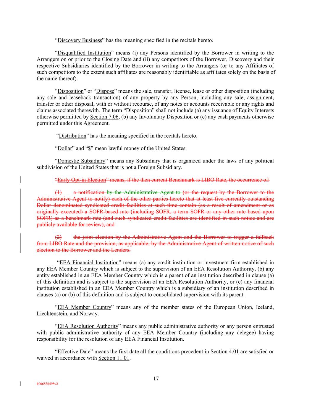 “Discovery Business” has the meaning specified in the recitals hereto. “Disqualified Institution” means (i) any Persons identified by the Borrower in writing to the Arrangers on or prior to the Closing Date and (ii) any competitors of the Borrower, Discovery and their respective Subsidiaries identified by the Borrower in writing to the Arrangers (or to any Affiliates of such competitors to the extent such affiliates are reasonably identifiable as affiliates solely on the basis of the name thereof). “Disposition” or “Dispose” means the sale, transfer, license, lease or other disposition (including any sale and leaseback transaction) of any property by any Person, including any sale, assignment, transfer or other disposal, with or without recourse, of any notes or accounts receivable or any rights and claims associated therewith. The term “Disposition” shall not include (a) any issuance of Equity Interests otherwise permitted by Section 7.06, (b) any Involuntary Disposition or (c) any cash payments otherwise permitted under this Agreement. “Distribution” has the meaning specified in the recitals hereto. “Dollar” and “$” mean lawful money of the United States. “Domestic Subsidiary” means any Subsidiary that is organized under the laws of any political subdivision of the United States that is not a Foreign Subsidiary. “Early Opt-in Election” means, if the then current Benchmark is LIBO Rate, the occurrence of: (1) a notification by the Administrative Agent to (or the request by the Borrower to the Administrative Agent to notify) each of the other parties hereto that at least five currently outstanding Dollar denominated syndicated credit facilities at such time contain (as a result of amendment or as originally executed) a SOFR-based rate (including SOFR, a term SOFR or any other rate based upon SOFR) as a benchmark rate (and such syndicated credit facilities are identified in such notice and are publicly available for review), and (2) the joint election by the Administrative Agent and the Borrower to trigger a fallback from LIBO Rate and the provision, as applicable, by the Administrative Agent of written notice of such election to the Borrower and the Lenders. “EEA Financial Institution” means (a) any credit institution or investment firm established in any EEA Member Country which is subject to the supervision of an EEA Resolution Authority, (b) any entity established in an EEA Member Country which is a parent of an institution described in clause (a) of this definition and is subject to the supervision of an EEA Resolution Authority, or (c) any financial institution established in an EEA Member Country which is a subsidiary of an institution described in clauses (a) or (b) of this definition and is subject to consolidated supervision with its parent. “EEA Member Country” means any of the member states of the European Union, Iceland, Liechtenstein, and Norway. “EEA Resolution Authority” means any public administrative authority or any person entrusted with public administrative authority of any EEA Member Country (including any delegee) having responsibility for the resolution of any EEA Financial Institution. “Effective Date” means the first date all the conditions precedent in Section 4.01 are satisfied or waived in accordance with Section 11.01. 17 1006836498v2