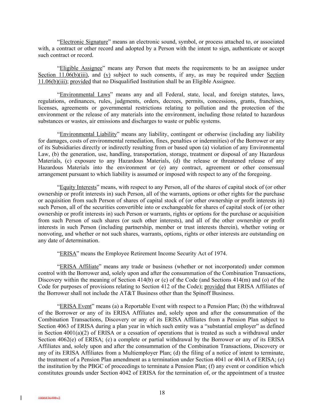 “Electronic Signature” means an electronic sound, symbol, or process attached to, or associated with, a contract or other record and adopted by a Person with the intent to sign, authenticate or accept such contract or record. “Eligible Assignee” means any Person that meets the requirements to be an assignee under Section 11.06(b)(iii), and (v) subject to such consents, if any, as may be required under Section 11.06(b)(iii); provided that no Disqualified Institution shall be an Eligible Assignee. “Environmental Laws” means any and all Federal, state, local, and foreign statutes, laws, regulations, ordinances, rules, judgments, orders, decrees, permits, concessions, grants, franchises, licenses, agreements or governmental restrictions relating to pollution and the protection of the environment or the release of any materials into the environment, including those related to hazardous substances or wastes, air emissions and discharges to waste or public systems. “Environmental Liability” means any liability, contingent or otherwise (including any liability for damages, costs of environmental remediation, fines, penalties or indemnities) of the Borrower or any of its Subsidiaries directly or indirectly resulting from or based upon (a) violation of any Environmental Law, (b) the generation, use, handling, transportation, storage, treatment or disposal of any Hazardous Materials, (c) exposure to any Hazardous Materials, (d) the release or threatened release of any Hazardous Materials into the environment or (e) any contract, agreement or other consensual arrangement pursuant to which liability is assumed or imposed with respect to any of the foregoing. “Equity Interests” means, with respect to any Person, all of the shares of capital stock of (or other ownership or profit interests in) such Person, all of the warrants, options or other rights for the purchase or acquisition from such Person of shares of capital stock of (or other ownership or profit interests in) such Person, all of the securities convertible into or exchangeable for shares of capital stock of (or other ownership or profit interests in) such Person or warrants, rights or options for the purchase or acquisition from such Person of such shares (or such other interests), and all of the other ownership or profit interests in such Person (including partnership, member or trust interests therein), whether voting or nonvoting, and whether or not such shares, warrants, options, rights or other interests are outstanding on any date of determination. “ERISA” means the Employee Retirement Income Security Act of 1974. “ERISA Affiliate” means any trade or business (whether or not incorporated) under common control with the Borrower and, solely upon and after the consummation of the Combination Transactions, Discovery within the meaning of Section 414(b) or (c) of the Code (and Sections 414(m) and (o) of the Code for purposes of provisions relating to Section 412 of the Code); provided that ERISA Affiliates of the Borrower shall not include the AT&T Business other than the Spinoff Business. “ERISA Event” means (a) a Reportable Event with respect to a Pension Plan; (b) the withdrawal of the Borrower or any of its ERISA Affiliates and, solely upon and after the consummation of the Combination Transactions, Discovery or any of its ERISA Affiliates from a Pension Plan subject to Section 4063 of ERISA during a plan year in which such entity was a “substantial employer” as defined in Section 4001(a)(2) of ERISA or a cessation of operations that is treated as such a withdrawal under Section 4062(e) of ERISA; (c) a complete or partial withdrawal by the Borrower or any of its ERISA Affiliates and, solely upon and after the consummation of the Combination Transactions, Discovery or any of its ERISA Affiliates from a Multiemployer Plan; (d) the filing of a notice of intent to terminate, the treatment of a Pension Plan amendment as a termination under Section 4041 or 4041A of ERISA; (e) the institution by the PBGC of proceedings to terminate a Pension Plan; (f) any event or condition which constitutes grounds under Section 4042 of ERISA for the termination of, or the appointment of a trustee 18 1006836498v2