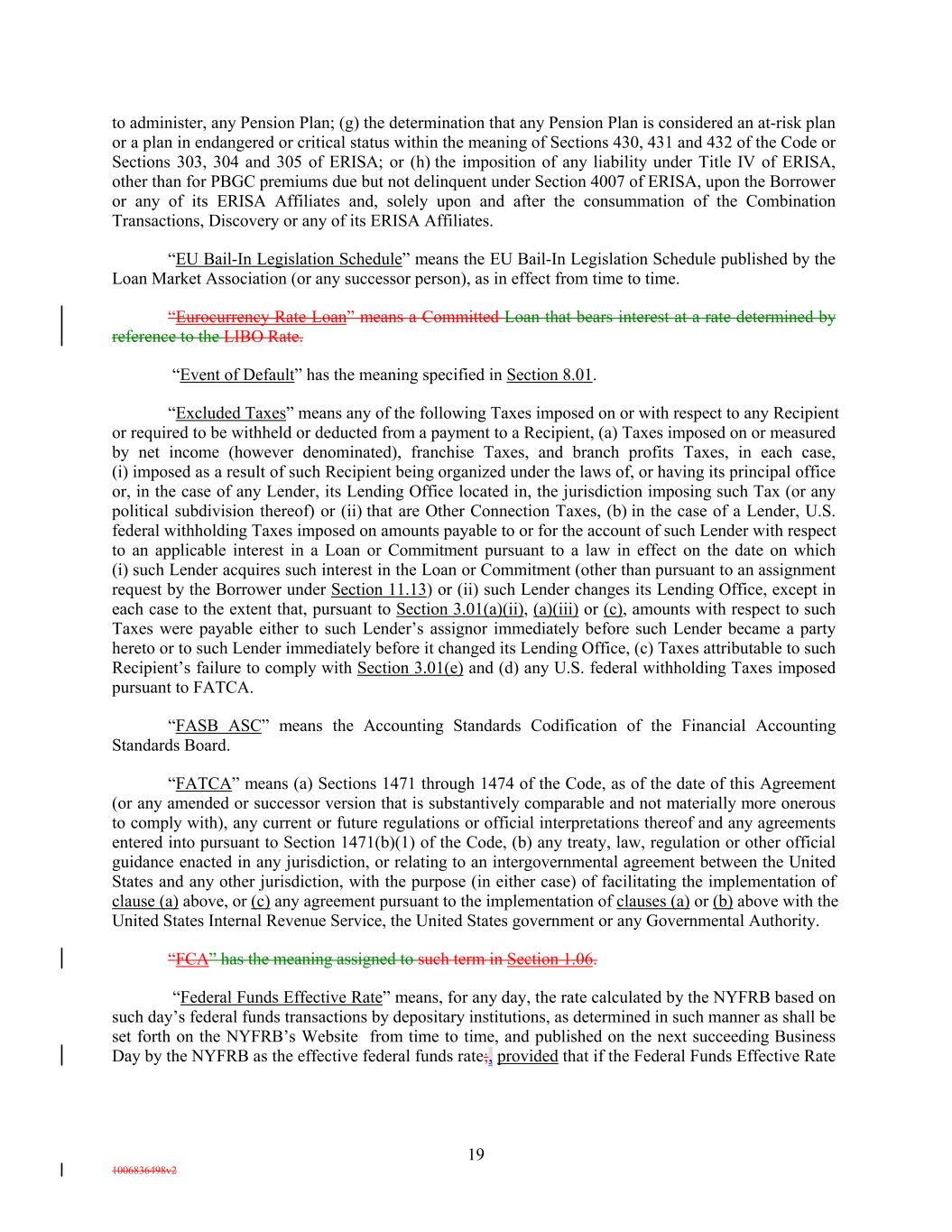 to administer, any Pension Plan; (g) the determination that any Pension Plan is considered an at-risk plan or a plan in endangered or critical status within the meaning of Sections 430, 431 and 432 of the Code or Sections 303, 304 and 305 of ERISA; or (h) the imposition of any liability under Title IV of ERISA, other than for PBGC premiums due but not delinquent under Section 4007 of ERISA, upon the Borrower or any of its ERISA Affiliates and, solely upon and after the consummation of the Combination Transactions, Discovery or any of its ERISA Affiliates. “EU Bail-In Legislation Schedule” means the EU Bail-In Legislation Schedule published by the Loan Market Association (or any successor person), as in effect from time to time. “Eurocurrency Rate Loan” means a Committed Loan that bears interest at a rate determined by reference to the LIBO Rate. “Event of Default” has the meaning specified in Section 8.01. “Excluded Taxes” means any of the following Taxes imposed on or with respect to any Recipient or required to be withheld or deducted from a payment to a Recipient, (a) Taxes imposed on or measured by net income (however denominated), franchise Taxes, and branch profits Taxes, in each case, (i) imposed as a result of such Recipient being organized under the laws of, or having its principal office or, in the case of any Lender, its Lending Office located in, the jurisdiction imposing such Tax (or any political subdivision thereof) or (ii) that are Other Connection Taxes, (b) in the case of a Lender, U.S. federal withholding Taxes imposed on amounts payable to or for the account of such Lender with respect to an applicable interest in a Loan or Commitment pursuant to a law in effect on the date on which (i) such Lender acquires such interest in the Loan or Commitment (other than pursuant to an assignment request by the Borrower under Section 11.13) or (ii) such Lender changes its Lending Office, except in each case to the extent that, pursuant to Section 3.01(a)(ii), (a)(iii) or (c), amounts with respect to such Taxes were payable either to such Lender’s assignor immediately before such Lender became a party hereto or to such Lender immediately before it changed its Lending Office, (c) Taxes attributable to such Recipient’s failure to comply with Section 3.01(e) and (d) any U.S. federal withholding Taxes imposed pursuant to FATCA. “FASB ASC” means the Accounting Standards Codification of the Financial Accounting Standards Board. “FATCA” means (a) Sections 1471 through 1474 of the Code, as of the date of this Agreement (or any amended or successor version that is substantively comparable and not materially more onerous to comply with), any current or future regulations or official interpretations thereof and any agreements entered into pursuant to Section 1471(b)(1) of the Code, (b) any treaty, law, regulation or other official guidance enacted in any jurisdiction, or relating to an intergovernmental agreement between the United States and any other jurisdiction, with the purpose (in either case) of facilitating the implementation of clause (a) above, or (c) any agreement pursuant to the implementation of clauses (a) or (b) above with the United States Internal Revenue Service, the United States government or any Governmental Authority. “FCA” has the meaning assigned to such term in Section 1.06. “Federal Funds Effective Rate” means, for any day, the rate calculated by the NYFRB based on such day’s federal funds transactions by depositary institutions, as determined in such manner as shall be set forth on the NYFRB’s Website from time to time, and published on the next succeeding Business Day by the NYFRB as the effective federal funds rate;, provided that if the Federal Funds Effective Rate 19 1006836498v2