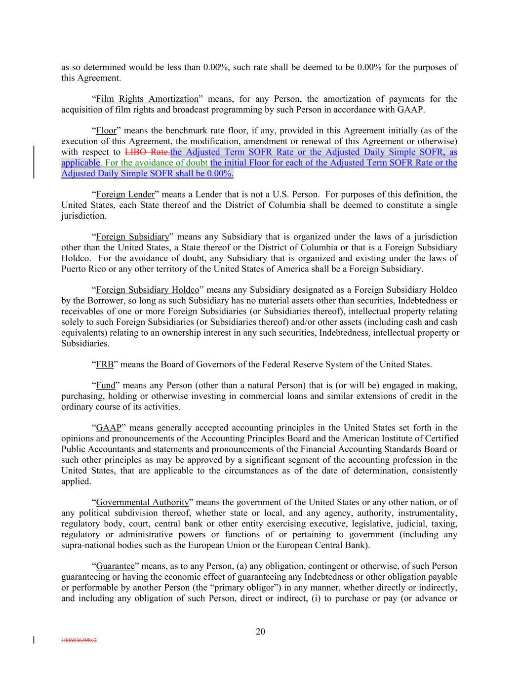 as so determined would be less than 0.00%, such rate shall be deemed to be 0.00% for the purposes of this Agreement. “Film Rights Amortization” means, for any Person, the amortization of payments for the acquisition of film rights and broadcast programming by such Person in accordance with GAAP. “Floor” means the benchmark rate floor, if any, provided in this Agreement initially (as of the execution of this Agreement, the modification, amendment or renewal of this Agreement or otherwise) with respect to LIBO Rate.the Adjusted Term SOFR Rate or the Adjusted Daily Simple SOFR, as applicable. For the avoidance of doubt the initial Floor for each of the Adjusted Term SOFR Rate or the Adjusted Daily Simple SOFR shall be 0.00%. “Foreign Lender” means a Lender that is not a U.S. Person. For purposes of this definition, the United States, each State thereof and the District of Columbia shall be deemed to constitute a single jurisdiction. “Foreign Subsidiary” means any Subsidiary that is organized under the laws of a jurisdiction other than the United States, a State thereof or the District of Columbia or that is a Foreign Subsidiary Holdco. For the avoidance of doubt, any Subsidiary that is organized and existing under the laws of Puerto Rico or any other territory of the United States of America shall be a Foreign Subsidiary. “Foreign Subsidiary Holdco” means any Subsidiary designated as a Foreign Subsidiary Holdco by the Borrower, so long as such Subsidiary has no material assets other than securities, Indebtedness or receivables of one or more Foreign Subsidiaries (or Subsidiaries thereof), intellectual property relating solely to such Foreign Subsidiaries (or Subsidiaries thereof) and/or other assets (including cash and cash equivalents) relating to an ownership interest in any such securities, Indebtedness, intellectual property or Subsidiaries. “FRB” means the Board of Governors of the Federal Reserve System of the United States. “Fund” means any Person (other than a natural Person) that is (or will be) engaged in making, purchasing, holding or otherwise investing in commercial loans and similar extensions of credit in the ordinary course of its activities. “GAAP” means generally accepted accounting principles in the United States set forth in the opinions and pronouncements of the Accounting Principles Board and the American Institute of Certified Public Accountants and statements and pronouncements of the Financial Accounting Standards Board or such other principles as may be approved by a significant segment of the accounting profession in the United States, that are applicable to the circumstances as of the date of determination, consistently applied. “Governmental Authority” means the government of the United States or any other nation, or of any political subdivision thereof, whether state or local, and any agency, authority, instrumentality, regulatory body, court, central bank or other entity exercising executive, legislative, judicial, taxing, regulatory or administrative powers or functions of or pertaining to government (including any supra-national bodies such as the European Union or the European Central Bank). “Guarantee” means, as to any Person, (a) any obligation, contingent or otherwise, of such Person guaranteeing or having the economic effect of guaranteeing any Indebtedness or other obligation payable or performable by another Person (the “primary obligor”) in any manner, whether directly or indirectly, and including any obligation of such Person, direct or indirect, (i) to purchase or pay (or advance or 20 1006836498v2