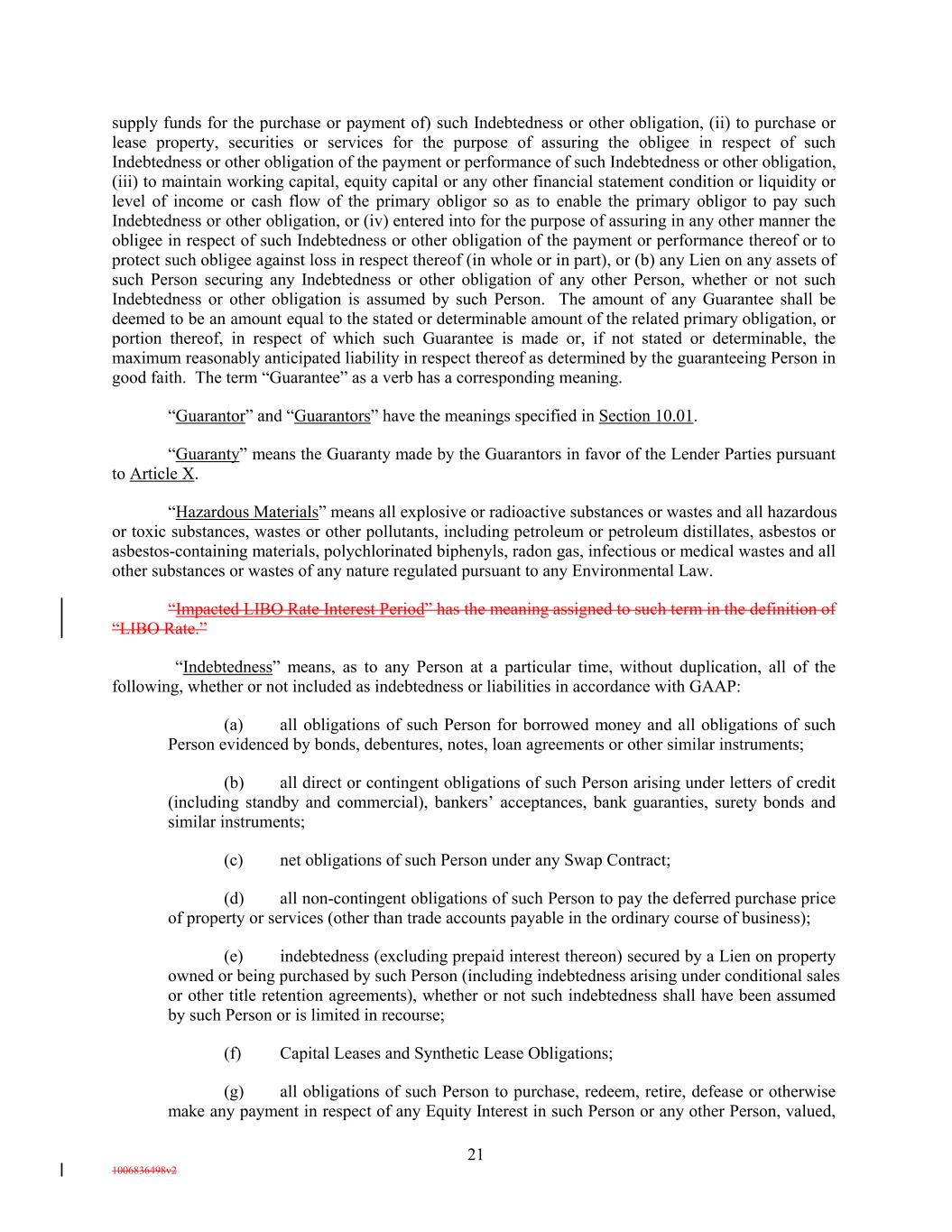 supply funds for the purchase or payment of) such Indebtedness or other obligation, (ii) to purchase or lease property, securities or services for the purpose of assuring the obligee in respect of such Indebtedness or other obligation of the payment or performance of such Indebtedness or other obligation, (iii) to maintain working capital, equity capital or any other financial statement condition or liquidity or level of income or cash flow of the primary obligor so as to enable the primary obligor to pay such Indebtedness or other obligation, or (iv) entered into for the purpose of assuring in any other manner the obligee in respect of such Indebtedness or other obligation of the payment or performance thereof or to protect such obligee against loss in respect thereof (in whole or in part), or (b) any Lien on any assets of such Person securing any Indebtedness or other obligation of any other Person, whether or not such Indebtedness or other obligation is assumed by such Person. The amount of any Guarantee shall be deemed to be an amount equal to the stated or determinable amount of the related primary obligation, or portion thereof, in respect of which such Guarantee is made or, if not stated or determinable, the maximum reasonably anticipated liability in respect thereof as determined by the guaranteeing Person in good faith. The term “Guarantee” as a verb has a corresponding meaning. “Guarantor” and “Guarantors” have the meanings specified in Section 10.01. “Guaranty” means the Guaranty made by the Guarantors in favor of the Lender Parties pursuant to Article X. “Hazardous Materials” means all explosive or radioactive substances or wastes and all hazardous or toxic substances, wastes or other pollutants, including petroleum or petroleum distillates, asbestos or asbestos-containing materials, polychlorinated biphenyls, radon gas, infectious or medical wastes and all other substances or wastes of any nature regulated pursuant to any Environmental Law. “Impacted LIBO Rate Interest Period” has the meaning assigned to such term in the definition of “LIBO Rate.” “Indebtedness” means, as to any Person at a particular time, without duplication, all of the following, whether or not included as indebtedness or liabilities in accordance with GAAP: (a) all obligations of such Person for borrowed money and all obligations of such Person evidenced by bonds, debentures, notes, loan agreements or other similar instruments; (b) all direct or contingent obligations of such Person arising under letters of credit (including standby and commercial), bankers’ acceptances, bank guaranties, surety bonds and similar instruments; (c) net obligations of such Person under any Swap Contract; (d) all non-contingent obligations of such Person to pay the deferred purchase price of property or services (other than trade accounts payable in the ordinary course of business); (e) indebtedness (excluding prepaid interest thereon) secured by a Lien on property owned or being purchased by such Person (including indebtedness arising under conditional sales or other title retention agreements), whether or not such indebtedness shall have been assumed by such Person or is limited in recourse; (f) Capital Leases and Synthetic Lease Obligations; (g) all obligations of such Person to purchase, redeem, retire, defease or otherwise make any payment in respect of any Equity Interest in such Person or any other Person, valued, 21 1006836498v2