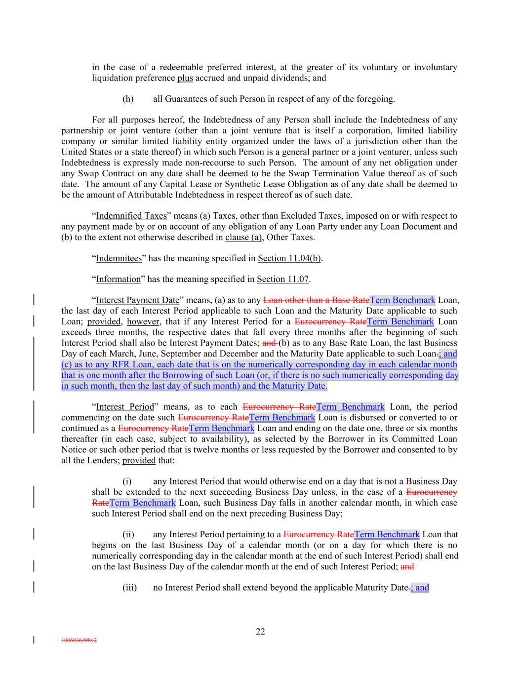in the case of a redeemable preferred interest, at the greater of its voluntary or involuntary liquidation preference plus accrued and unpaid dividends; and (h) all Guarantees of such Person in respect of any of the foregoing. For all purposes hereof, the Indebtedness of any Person shall include the Indebtedness of any partnership or joint venture (other than a joint venture that is itself a corporation, limited liability company or similar limited liability entity organized under the laws of a jurisdiction other than the United States or a state thereof) in which such Person is a general partner or a joint venturer, unless such Indebtedness is expressly made non-recourse to such Person. The amount of any net obligation under any Swap Contract on any date shall be deemed to be the Swap Termination Value thereof as of such date. The amount of any Capital Lease or Synthetic Lease Obligation as of any date shall be deemed to be the amount of Attributable Indebtedness in respect thereof as of such date. “Indemnified Taxes” means (a) Taxes, other than Excluded Taxes, imposed on or with respect to any payment made by or on account of any obligation of any Loan Party under any Loan Document and (b) to the extent not otherwise described in clause (a), Other Taxes. “Indemnitees” has the meaning specified in Section 11.04(b). “Information” has the meaning specified in Section 11.07. “Interest Payment Date” means, (a) as to any Loan other than a Base RateTerm Benchmark Loan, the last day of each Interest Period applicable to such Loan and the Maturity Date applicable to such Loan; provided, however, that if any Interest Period for a Eurocurrency RateTerm Benchmark Loan exceeds three months, the respective dates that fall every three months after the beginning of such Interest Period shall also be Interest Payment Dates; and (b) as to any Base Rate Loan, the last Business Day of each March, June, September and December and the Maturity Date applicable to such Loan.; and (c) as to any RFR Loan, each date that is on the numerically corresponding day in each calendar month that is one month after the Borrowing of such Loan (or, if there is no such numerically corresponding day in such month, then the last day of such month) and the Maturity Date. “Interest Period” means, as to each Eurocurrency RateTerm Benchmark Loan, the period commencing on the date such Eurocurrency RateTerm Benchmark Loan is disbursed or converted to or continued as a Eurocurrency RateTerm Benchmark Loan and ending on the date one, three or six months thereafter (in each case, subject to availability), as selected by the Borrower in its Committed Loan Notice or such other period that is twelve months or less requested by the Borrower and consented to by all the Lenders; provided that: (i) any Interest Period that would otherwise end on a day that is not a Business Day shall be extended to the next succeeding Business Day unless, in the case of a Eurocurrency RateTerm Benchmark Loan, such Business Day falls in another calendar month, in which case such Interest Period shall end on the next preceding Business Day; (ii) any Interest Period pertaining to a Eurocurrency RateTerm Benchmark Loan that begins on the last Business Day of a calendar month (or on a day for which there is no numerically corresponding day in the calendar month at the end of such Interest Period) shall end on the last Business Day of the calendar month at the end of such Interest Period; and (iii) no Interest Period shall extend beyond the applicable Maturity Date.; and 22 1006836498v2