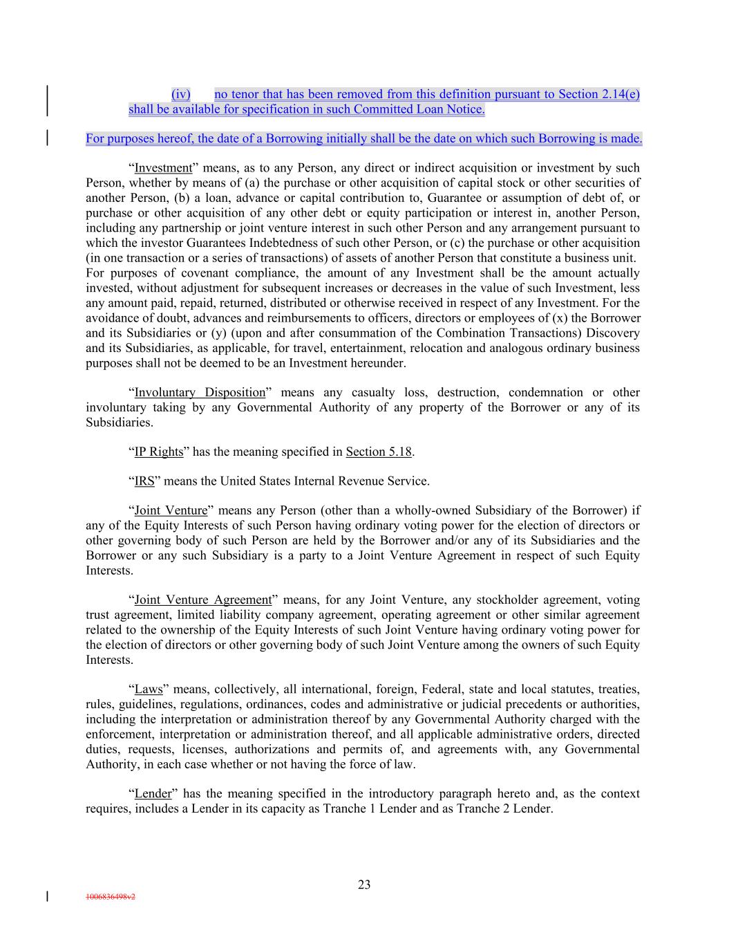 (iv) no tenor that has been removed from this definition pursuant to Section 2.14(e) shall be available for specification in such Committed Loan Notice. For purposes hereof, the date of a Borrowing initially shall be the date on which such Borrowing is made. “Investment” means, as to any Person, any direct or indirect acquisition or investment by such Person, whether by means of (a) the purchase or other acquisition of capital stock or other securities of another Person, (b) a loan, advance or capital contribution to, Guarantee or assumption of debt of, or purchase or other acquisition of any other debt or equity participation or interest in, another Person, including any partnership or joint venture interest in such other Person and any arrangement pursuant to which the investor Guarantees Indebtedness of such other Person, or (c) the purchase or other acquisition (in one transaction or a series of transactions) of assets of another Person that constitute a business unit. For purposes of covenant compliance, the amount of any Investment shall be the amount actually invested, without adjustment for subsequent increases or decreases in the value of such Investment, less any amount paid, repaid, returned, distributed or otherwise received in respect of any Investment. For the avoidance of doubt, advances and reimbursements to officers, directors or employees of (x) the Borrower and its Subsidiaries or (y) (upon and after consummation of the Combination Transactions) Discovery and its Subsidiaries, as applicable, for travel, entertainment, relocation and analogous ordinary business purposes shall not be deemed to be an Investment hereunder. “Involuntary Disposition” means any casualty loss, destruction, condemnation or other involuntary taking by any Governmental Authority of any property of the Borrower or any of its Subsidiaries. “IP Rights” has the meaning specified in Section 5.18. “IRS” means the United States Internal Revenue Service. “Joint Venture” means any Person (other than a wholly-owned Subsidiary of the Borrower) if any of the Equity Interests of such Person having ordinary voting power for the election of directors or other governing body of such Person are held by the Borrower and/or any of its Subsidiaries and the Borrower or any such Subsidiary is a party to a Joint Venture Agreement in respect of such Equity Interests. “Joint Venture Agreement” means, for any Joint Venture, any stockholder agreement, voting trust agreement, limited liability company agreement, operating agreement or other similar agreement related to the ownership of the Equity Interests of such Joint Venture having ordinary voting power for the election of directors or other governing body of such Joint Venture among the owners of such Equity Interests. “Laws” means, collectively, all international, foreign, Federal, state and local statutes, treaties, rules, guidelines, regulations, ordinances, codes and administrative or judicial precedents or authorities, including the interpretation or administration thereof by any Governmental Authority charged with the enforcement, interpretation or administration thereof, and all applicable administrative orders, directed duties, requests, licenses, authorizations and permits of, and agreements with, any Governmental Authority, in each case whether or not having the force of law. “Lender” has the meaning specified in the introductory paragraph hereto and, as the context requires, includes a Lender in its capacity as Tranche 1 Lender and as Tranche 2 Lender. 23 1006836498v2