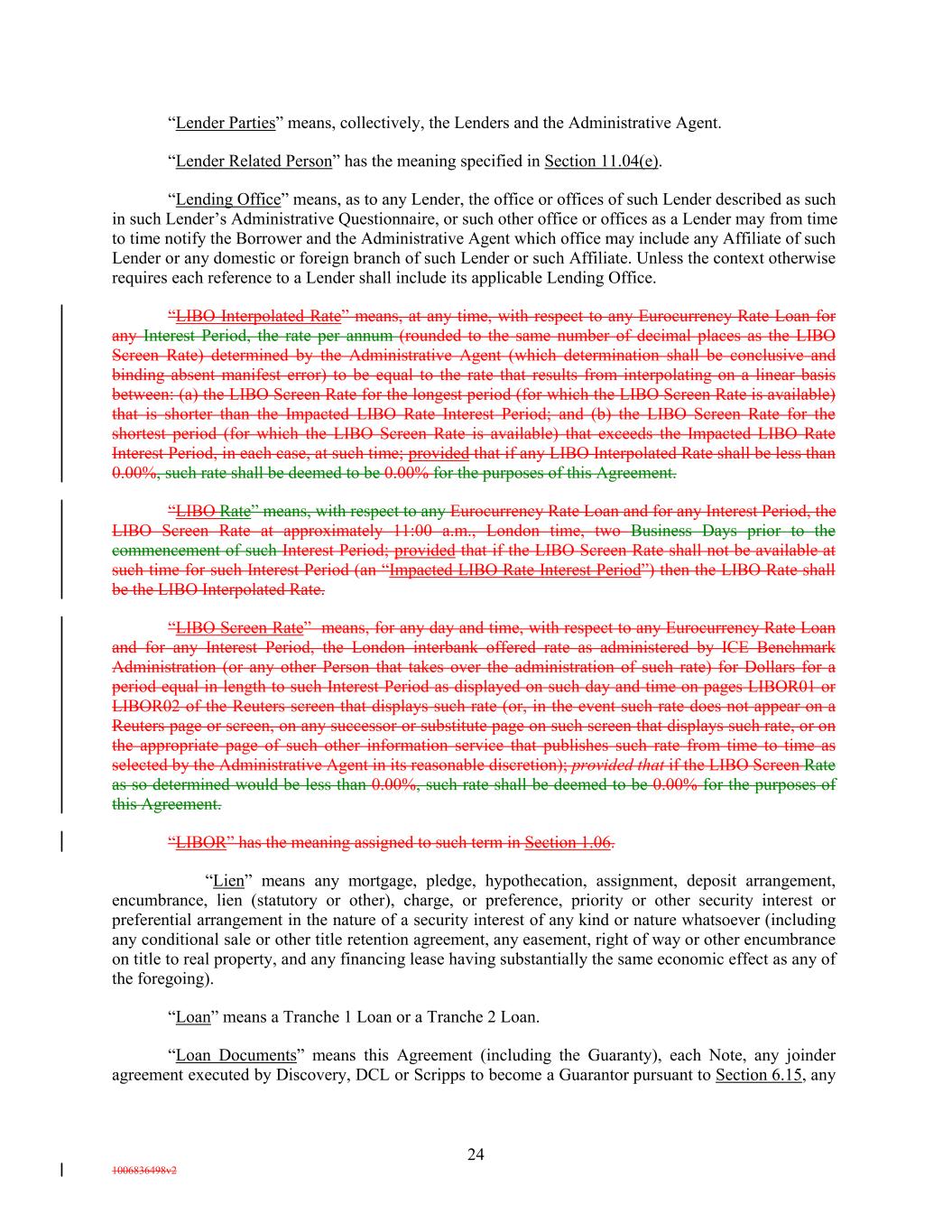 “Lender Parties” means, collectively, the Lenders and the Administrative Agent. “Lender Related Person” has the meaning specified in Section 11.04(e). “Lending Office” means, as to any Lender, the office or offices of such Lender described as such in such Lender’s Administrative Questionnaire, or such other office or offices as a Lender may from time to time notify the Borrower and the Administrative Agent which office may include any Affiliate of such Lender or any domestic or foreign branch of such Lender or such Affiliate. Unless the context otherwise requires each reference to a Lender shall include its applicable Lending Office. “LIBO Interpolated Rate” means, at any time, with respect to any Eurocurrency Rate Loan for any Interest Period, the rate per annum (rounded to the same number of decimal places as the LIBO Screen Rate) determined by the Administrative Agent (which determination shall be conclusive and binding absent manifest error) to be equal to the rate that results from interpolating on a linear basis between: (a) the LIBO Screen Rate for the longest period (for which the LIBO Screen Rate is available) that is shorter than the Impacted LIBO Rate Interest Period; and (b) the LIBO Screen Rate for the shortest period (for which the LIBO Screen Rate is available) that exceeds the Impacted LIBO Rate Interest Period, in each case, at such time; provided that if any LIBO Interpolated Rate shall be less than 0.00%, such rate shall be deemed to be 0.00% for the purposes of this Agreement. “LIBO Rate” means, with respect to any Eurocurrency Rate Loan and for any Interest Period, the LIBO Screen Rate at approximately 11:00 a.m., London time, two Business Days prior to the commencement of such Interest Period; provided that if the LIBO Screen Rate shall not be available at such time for such Interest Period (an “Impacted LIBO Rate Interest Period”) then the LIBO Rate shall be the LIBO Interpolated Rate. “LIBO Screen Rate” means, for any day and time, with respect to any Eurocurrency Rate Loan and for any Interest Period, the London interbank offered rate as administered by ICE Benchmark Administration (or any other Person that takes over the administration of such rate) for Dollars for a period equal in length to such Interest Period as displayed on such day and time on pages LIBOR01 or LIBOR02 of the Reuters screen that displays such rate (or, in the event such rate does not appear on a Reuters page or screen, on any successor or substitute page on such screen that displays such rate, or on the appropriate page of such other information service that publishes such rate from time to time as selected by the Administrative Agent in its reasonable discretion); provided that if the LIBO Screen Rate as so determined would be less than 0.00%, such rate shall be deemed to be 0.00% for the purposes of this Agreement. “LIBOR” has the meaning assigned to such term in Section 1.06. “Lien” means any mortgage, pledge, hypothecation, assignment, deposit arrangement, encumbrance, lien (statutory or other), charge, or preference, priority or other security interest or preferential arrangement in the nature of a security interest of any kind or nature whatsoever (including any conditional sale or other title retention agreement, any easement, right of way or other encumbrance on title to real property, and any financing lease having substantially the same economic effect as any of the foregoing). “Loan” means a Tranche 1 Loan or a Tranche 2 Loan. “Loan Documents” means this Agreement (including the Guaranty), each Note, any joinder agreement executed by Discovery, DCL or Scripps to become a Guarantor pursuant to Section 6.15, any 24 1006836498v2