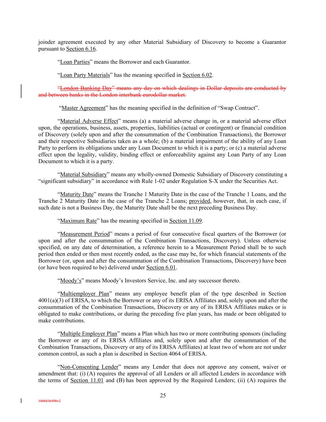 joinder agreement executed by any other Material Subsidiary of Discovery to become a Guarantor pursuant to Section 6.16. “Loan Parties” means the Borrower and each Guarantor. “Loan Party Materials” has the meaning specified in Section 6.02. “London Banking Day” means any day on which dealings in Dollar deposits are conducted by and between banks in the London interbank eurodollar market. “Master Agreement” has the meaning specified in the definition of “Swap Contract”. “Material Adverse Effect” means (a) a material adverse change in, or a material adverse effect upon, the operations, business, assets, properties, liabilities (actual or contingent) or financial condition of Discovery (solely upon and after the consummation of the Combination Transactions), the Borrower and their respective Subsidiaries taken as a whole; (b) a material impairment of the ability of any Loan Party to perform its obligations under any Loan Document to which it is a party; or (c) a material adverse effect upon the legality, validity, binding effect or enforceability against any Loan Party of any Loan Document to which it is a party. “Material Subsidiary” means any wholly-owned Domestic Subsidiary of Discovery constituting a “significant subsidiary” in accordance with Rule 1-02 under Regulation S-X under the Securities Act. “Maturity Date” means the Tranche 1 Maturity Date in the case of the Tranche 1 Loans, and the Tranche 2 Maturity Date in the case of the Tranche 2 Loans; provided, however, that, in each case, if such date is not a Business Day, the Maturity Date shall be the next preceding Business Day. “Maximum Rate” has the meaning specified in Section 11.09. “Measurement Period” means a period of four consecutive fiscal quarters of the Borrower (or upon and after the consummation of the Combination Transactions, Discovery). Unless otherwise specified, on any date of determination, a reference herein to a Measurement Period shall be to such period then ended or then most recently ended, as the case may be, for which financial statements of the Borrower (or, upon and after the consummation of the Combination Transactions, Discovery) have been (or have been required to be) delivered under Section 6.01. “Moody’s” means Moody’s Investors Service, Inc. and any successor thereto. “Multiemployer Plan” means any employee benefit plan of the type described in Section 4001(a)(3) of ERISA, to which the Borrower or any of its ERISA Affiliates and, solely upon and after the consummation of the Combination Transactions, Discovery or any of its ERISA Affiliates makes or is obligated to make contributions, or during the preceding five plan years, has made or been obligated to make contributions. “Multiple Employer Plan” means a Plan which has two or more contributing sponsors (including the Borrower or any of its ERISA Affiliates and, solely upon and after the consummation of the Combination Transactions, Discovery or any of its ERISA Affiliates) at least two of whom are not under common control, as such a plan is described in Section 4064 of ERISA. “Non-Consenting Lender” means any Lender that does not approve any consent, waiver or amendment that: (i) (A) requires the approval of all Lenders or all affected Lenders in accordance with the terms of Section 11.01 and (B) has been approved by the Required Lenders; (ii) (A) requires the 25 1006836498v2