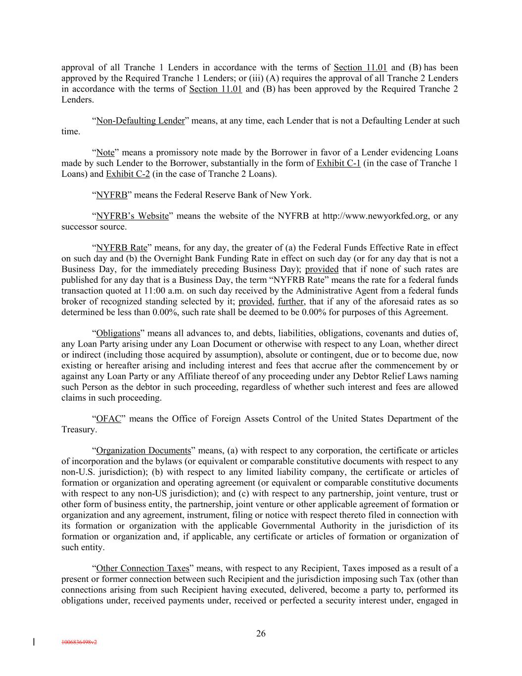 approval of all Tranche 1 Lenders in accordance with the terms of Section 11.01 and (B) has been approved by the Required Tranche 1 Lenders; or (iii) (A) requires the approval of all Tranche 2 Lenders in accordance with the terms of Section 11.01 and (B) has been approved by the Required Tranche 2 Lenders. “Non-Defaulting Lender” means, at any time, each Lender that is not a Defaulting Lender at such time. “Note” means a promissory note made by the Borrower in favor of a Lender evidencing Loans made by such Lender to the Borrower, substantially in the form of Exhibit C-1 (in the case of Tranche 1 Loans) and Exhibit C-2 (in the case of Tranche 2 Loans). “NYFRB” means the Federal Reserve Bank of New York. “NYFRB’s Website” means the website of the NYFRB at http://www.newyorkfed.org, or any successor source. “NYFRB Rate” means, for any day, the greater of (a) the Federal Funds Effective Rate in effect on such day and (b) the Overnight Bank Funding Rate in effect on such day (or for any day that is not a Business Day, for the immediately preceding Business Day); provided that if none of such rates are published for any day that is a Business Day, the term “NYFRB Rate” means the rate for a federal funds transaction quoted at 11:00 a.m. on such day received by the Administrative Agent from a federal funds broker of recognized standing selected by it; provided, further, that if any of the aforesaid rates as so determined be less than 0.00%, such rate shall be deemed to be 0.00% for purposes of this Agreement. “Obligations” means all advances to, and debts, liabilities, obligations, covenants and duties of, any Loan Party arising under any Loan Document or otherwise with respect to any Loan, whether direct or indirect (including those acquired by assumption), absolute or contingent, due or to become due, now existing or hereafter arising and including interest and fees that accrue after the commencement by or against any Loan Party or any Affiliate thereof of any proceeding under any Debtor Relief Laws naming such Person as the debtor in such proceeding, regardless of whether such interest and fees are allowed claims in such proceeding. “OFAC” means the Office of Foreign Assets Control of the United States Department of the Treasury. “Organization Documents” means, (a) with respect to any corporation, the certificate or articles of incorporation and the bylaws (or equivalent or comparable constitutive documents with respect to any non-U.S. jurisdiction); (b) with respect to any limited liability company, the certificate or articles of formation or organization and operating agreement (or equivalent or comparable constitutive documents with respect to any non-US jurisdiction); and (c) with respect to any partnership, joint venture, trust or other form of business entity, the partnership, joint venture or other applicable agreement of formation or organization and any agreement, instrument, filing or notice with respect thereto filed in connection with its formation or organization with the applicable Governmental Authority in the jurisdiction of its formation or organization and, if applicable, any certificate or articles of formation or organization of such entity. “Other Connection Taxes” means, with respect to any Recipient, Taxes imposed as a result of a present or former connection between such Recipient and the jurisdiction imposing such Tax (other than connections arising from such Recipient having executed, delivered, become a party to, performed its obligations under, received payments under, received or perfected a security interest under, engaged in 26 1006836498v2