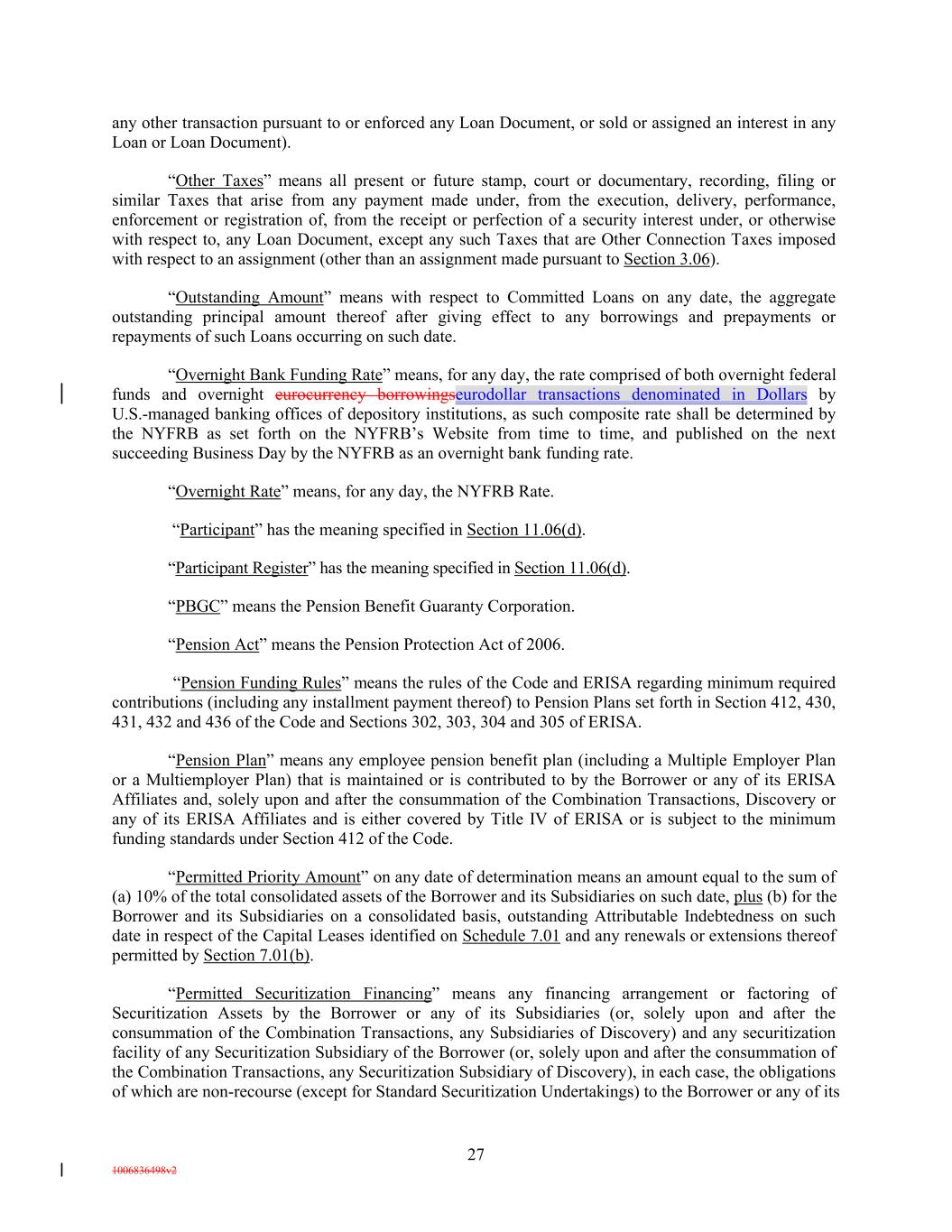 any other transaction pursuant to or enforced any Loan Document, or sold or assigned an interest in any Loan or Loan Document). “Other Taxes” means all present or future stamp, court or documentary, recording, filing or similar Taxes that arise from any payment made under, from the execution, delivery, performance, enforcement or registration of, from the receipt or perfection of a security interest under, or otherwise with respect to, any Loan Document, except any such Taxes that are Other Connection Taxes imposed with respect to an assignment (other than an assignment made pursuant to Section 3.06). “Outstanding Amount” means with respect to Committed Loans on any date, the aggregate outstanding principal amount thereof after giving effect to any borrowings and prepayments or repayments of such Loans occurring on such date. “Overnight Bank Funding Rate” means, for any day, the rate comprised of both overnight federal funds and overnight eurocurrency borrowingseurodollar transactions denominated in Dollars by U.S.-managed banking offices of depository institutions, as such composite rate shall be determined by the NYFRB as set forth on the NYFRB’s Website from time to time, and published on the next succeeding Business Day by the NYFRB as an overnight bank funding rate. “Overnight Rate” means, for any day, the NYFRB Rate. “Participant” has the meaning specified in Section 11.06(d). “Participant Register” has the meaning specified in Section 11.06(d). “PBGC” means the Pension Benefit Guaranty Corporation. “Pension Act” means the Pension Protection Act of 2006. “Pension Funding Rules” means the rules of the Code and ERISA regarding minimum required contributions (including any installment payment thereof) to Pension Plans set forth in Section 412, 430, 431, 432 and 436 of the Code and Sections 302, 303, 304 and 305 of ERISA. “Pension Plan” means any employee pension benefit plan (including a Multiple Employer Plan or a Multiemployer Plan) that is maintained or is contributed to by the Borrower or any of its ERISA Affiliates and, solely upon and after the consummation of the Combination Transactions, Discovery or any of its ERISA Affiliates and is either covered by Title IV of ERISA or is subject to the minimum funding standards under Section 412 of the Code. “Permitted Priority Amount” on any date of determination means an amount equal to the sum of (a) 10% of the total consolidated assets of the Borrower and its Subsidiaries on such date, plus (b) for the Borrower and its Subsidiaries on a consolidated basis, outstanding Attributable Indebtedness on such date in respect of the Capital Leases identified on Schedule 7.01 and any renewals or extensions thereof permitted by Section 7.01(b). “Permitted Securitization Financing” means any financing arrangement or factoring of Securitization Assets by the Borrower or any of its Subsidiaries (or, solely upon and after the consummation of the Combination Transactions, any Subsidiaries of Discovery) and any securitization facility of any Securitization Subsidiary of the Borrower (or, solely upon and after the consummation of the Combination Transactions, any Securitization Subsidiary of Discovery), in each case, the obligations of which are non-recourse (except for Standard Securitization Undertakings) to the Borrower or any of its 27 1006836498v2