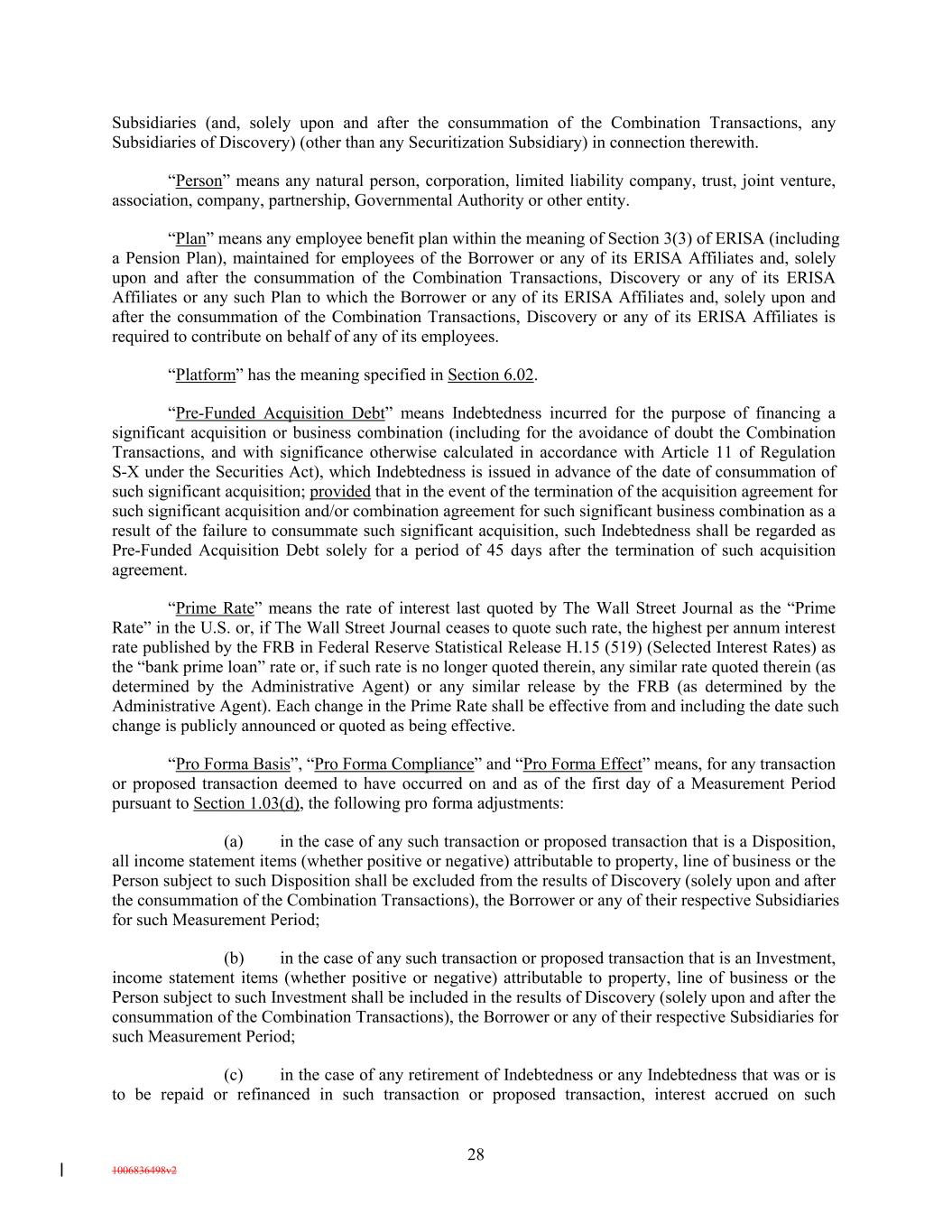 Subsidiaries (and, solely upon and after the consummation of the Combination Transactions, any Subsidiaries of Discovery) (other than any Securitization Subsidiary) in connection therewith. “Person” means any natural person, corporation, limited liability company, trust, joint venture, association, company, partnership, Governmental Authority or other entity. “Plan” means any employee benefit plan within the meaning of Section 3(3) of ERISA (including a Pension Plan), maintained for employees of the Borrower or any of its ERISA Affiliates and, solely upon and after the consummation of the Combination Transactions, Discovery or any of its ERISA Affiliates or any such Plan to which the Borrower or any of its ERISA Affiliates and, solely upon and after the consummation of the Combination Transactions, Discovery or any of its ERISA Affiliates is required to contribute on behalf of any of its employees. “Platform” has the meaning specified in Section 6.02. “Pre-Funded Acquisition Debt” means Indebtedness incurred for the purpose of financing a significant acquisition or business combination (including for the avoidance of doubt the Combination Transactions, and with significance otherwise calculated in accordance with Article 11 of Regulation S-X under the Securities Act), which Indebtedness is issued in advance of the date of consummation of such significant acquisition; provided that in the event of the termination of the acquisition agreement for such significant acquisition and/or combination agreement for such significant business combination as a result of the failure to consummate such significant acquisition, such Indebtedness shall be regarded as Pre-Funded Acquisition Debt solely for a period of 45 days after the termination of such acquisition agreement. “Prime Rate” means the rate of interest last quoted by The Wall Street Journal as the “Prime Rate” in the U.S. or, if The Wall Street Journal ceases to quote such rate, the highest per annum interest rate published by the FRB in Federal Reserve Statistical Release H.15 (519) (Selected Interest Rates) as the “bank prime loan” rate or, if such rate is no longer quoted therein, any similar rate quoted therein (as determined by the Administrative Agent) or any similar release by the FRB (as determined by the Administrative Agent). Each change in the Prime Rate shall be effective from and including the date such change is publicly announced or quoted as being effective. “Pro Forma Basis”, “Pro Forma Compliance” and “Pro Forma Effect” means, for any transaction or proposed transaction deemed to have occurred on and as of the first day of a Measurement Period pursuant to Section 1.03(d), the following pro forma adjustments: (a) in the case of any such transaction or proposed transaction that is a Disposition, all income statement items (whether positive or negative) attributable to property, line of business or the Person subject to such Disposition shall be excluded from the results of Discovery (solely upon and after the consummation of the Combination Transactions), the Borrower or any of their respective Subsidiaries for such Measurement Period; (b) in the case of any such transaction or proposed transaction that is an Investment, income statement items (whether positive or negative) attributable to property, line of business or the Person subject to such Investment shall be included in the results of Discovery (solely upon and after the consummation of the Combination Transactions), the Borrower or any of their respective Subsidiaries for such Measurement Period; (c) in the case of any retirement of Indebtedness or any Indebtedness that was or is to be repaid or refinanced in such transaction or proposed transaction, interest accrued on such 28 1006836498v2
