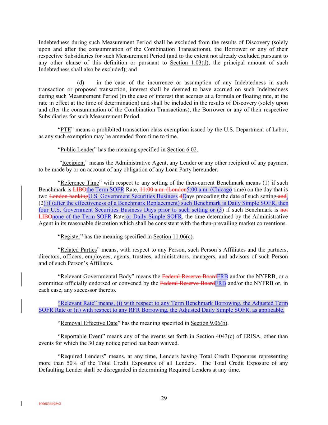 Indebtedness during such Measurement Period shall be excluded from the results of Discovery (solely upon and after the consummation of the Combination Transactions), the Borrower or any of their respective Subsidiaries for such Measurement Period (and to the extent not already excluded pursuant to any other clause of this definition or pursuant to Section 1.03(d), the principal amount of such Indebtedness shall also be excluded); and (d) in the case of the incurrence or assumption of any Indebtedness in such transaction or proposed transaction, interest shall be deemed to have accrued on such Indebtedness during such Measurement Period (in the case of interest that accrues at a formula or floating rate, at the rate in effect at the time of determination) and shall be included in the results of Discovery (solely upon and after the consummation of the Combination Transactions), the Borrower or any of their respective Subsidiaries for such Measurement Period. “PTE” means a prohibited transaction class exemption issued by the U.S. Department of Labor, as any such exemption may be amended from time to time. “Public Lender” has the meaning specified in Section 6.02. “Recipient” means the Administrative Agent, any Lender or any other recipient of any payment to be made by or on account of any obligation of any Loan Party hereunder. “Reference Time” with respect to any setting of the then-current Benchmark means (1) if such Benchmark is LIBOthe Term SOFR Rate, 11:00 a.m. (London5:00 a.m. (Chicago time) on the day that is two London bankingU.S. Government Securities Business dDays preceding the date of such setting and, (2) if (after the effectiveness of a Benchmark Replacement) such Benchmark is Daily Simple SOFR, then four U.S. Government Securities Business Days prior to such setting or (3) if such Benchmark is not LIBOnone of the Term SOFR Rate or Daily Simple SOFR, the time determined by the Administrative Agent in its reasonable discretion which shall be consistent with the then-prevailing market conventions. “Register” has the meaning specified in Section 11.06(c). “Related Parties” means, with respect to any Person, such Person’s Affiliates and the partners, directors, officers, employees, agents, trustees, administrators, managers, and advisors of such Person and of such Person’s Affiliates. “Relevant Governmental Body” means the Federal Reserve BoardFRB and/or the NYFRB, or a committee officially endorsed or convened by the Federal Reserve BoardFRB and/or the NYFRB or, in each case, any successor thereto. “Relevant Rate” means, (i) with respect to any Term Benchmark Borrowing, the Adjusted Term SOFR Rate or (ii) with respect to any RFR Borrowing, the Adjusted Daily Simple SOFR, as applicable. “Removal Effective Date” has the meaning specified in Section 9.06(b). “Reportable Event” means any of the events set forth in Section 4043(c) of ERISA, other than events for which the 30 day notice period has been waived. “Required Lenders” means, at any time, Lenders having Total Credit Exposures representing more than 50% of the Total Credit Exposures of all Lenders. The Total Credit Exposure of any Defaulting Lender shall be disregarded in determining Required Lenders at any time. 29 1006836498v2