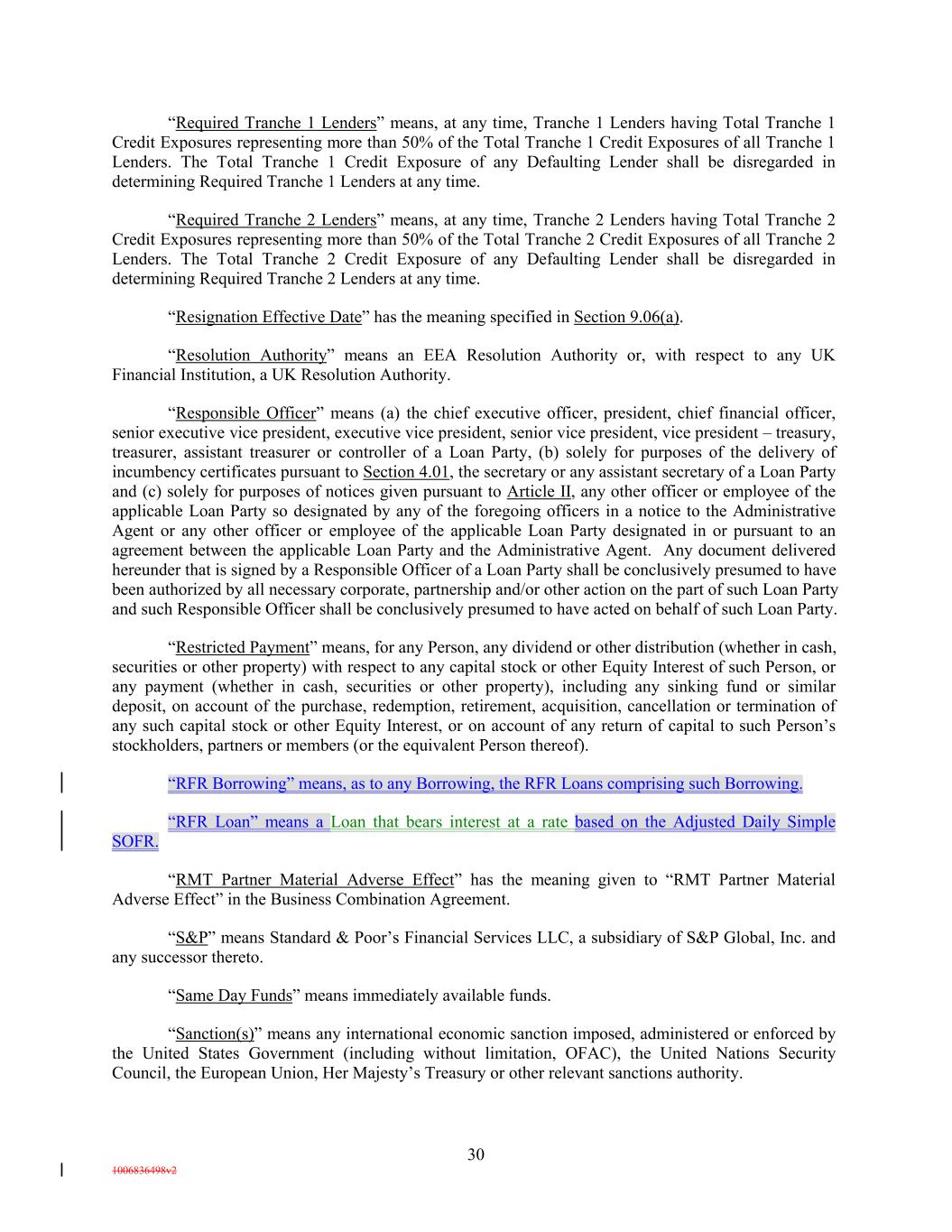 “Required Tranche 1 Lenders” means, at any time, Tranche 1 Lenders having Total Tranche 1 Credit Exposures representing more than 50% of the Total Tranche 1 Credit Exposures of all Tranche 1 Lenders. The Total Tranche 1 Credit Exposure of any Defaulting Lender shall be disregarded in determining Required Tranche 1 Lenders at any time. “Required Tranche 2 Lenders” means, at any time, Tranche 2 Lenders having Total Tranche 2 Credit Exposures representing more than 50% of the Total Tranche 2 Credit Exposures of all Tranche 2 Lenders. The Total Tranche 2 Credit Exposure of any Defaulting Lender shall be disregarded in determining Required Tranche 2 Lenders at any time. “Resignation Effective Date” has the meaning specified in Section 9.06(a). “Resolution Authority” means an EEA Resolution Authority or, with respect to any UK Financial Institution, a UK Resolution Authority. “Responsible Officer” means (a) the chief executive officer, president, chief financial officer, senior executive vice president, executive vice president, senior vice president, vice president – treasury, treasurer, assistant treasurer or controller of a Loan Party, (b) solely for purposes of the delivery of incumbency certificates pursuant to Section 4.01, the secretary or any assistant secretary of a Loan Party and (c) solely for purposes of notices given pursuant to Article II, any other officer or employee of the applicable Loan Party so designated by any of the foregoing officers in a notice to the Administrative Agent or any other officer or employee of the applicable Loan Party designated in or pursuant to an agreement between the applicable Loan Party and the Administrative Agent. Any document delivered hereunder that is signed by a Responsible Officer of a Loan Party shall be conclusively presumed to have been authorized by all necessary corporate, partnership and/or other action on the part of such Loan Party and such Responsible Officer shall be conclusively presumed to have acted on behalf of such Loan Party. “Restricted Payment” means, for any Person, any dividend or other distribution (whether in cash, securities or other property) with respect to any capital stock or other Equity Interest of such Person, or any payment (whether in cash, securities or other property), including any sinking fund or similar deposit, on account of the purchase, redemption, retirement, acquisition, cancellation or termination of any such capital stock or other Equity Interest, or on account of any return of capital to such Person’s stockholders, partners or members (or the equivalent Person thereof). “RFR Borrowing” means, as to any Borrowing, the RFR Loans comprising such Borrowing. “RFR Loan” means a Loan that bears interest at a rate based on the Adjusted Daily Simple SOFR. “RMT Partner Material Adverse Effect” has the meaning given to “RMT Partner Material Adverse Effect” in the Business Combination Agreement. “S&P” means Standard & Poor’s Financial Services LLC, a subsidiary of S&P Global, Inc. and any successor thereto. “Same Day Funds” means immediately available funds. “Sanction(s)” means any international economic sanction imposed, administered or enforced by the United States Government (including without limitation, OFAC), the United Nations Security Council, the European Union, Her Majesty’s Treasury or other relevant sanctions authority. 30 1006836498v2