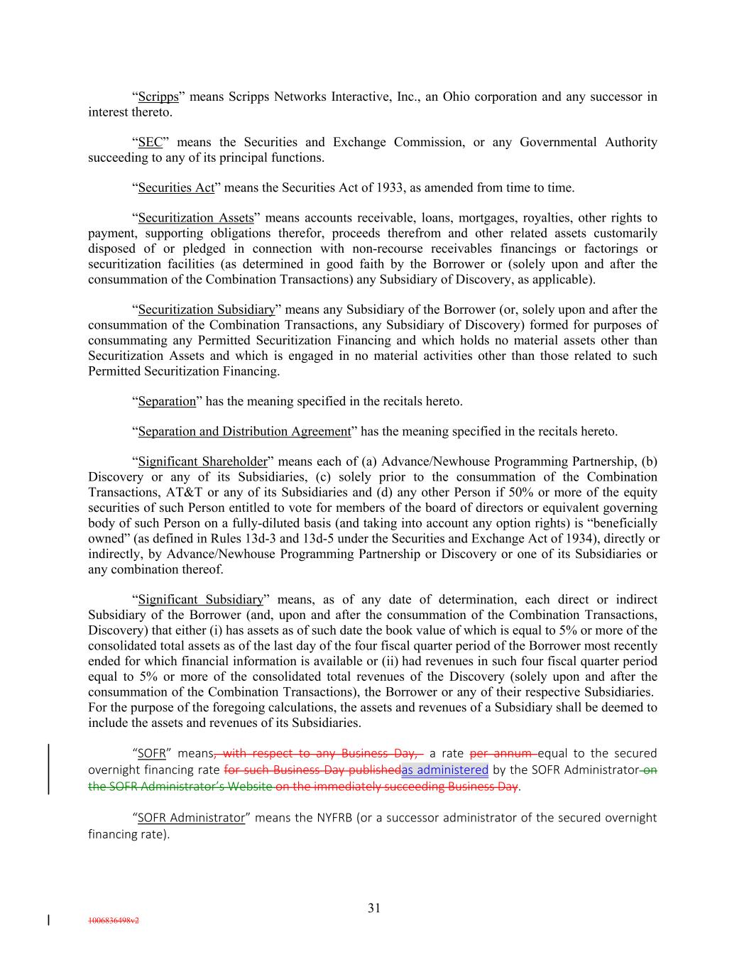 “Scripps” means Scripps Networks Interactive, Inc., an Ohio corporation and any successor in interest thereto. “SEC” means the Securities and Exchange Commission, or any Governmental Authority succeeding to any of its principal functions. “Securities Act” means the Securities Act of 1933, as amended from time to time. “Securitization Assets” means accounts receivable, loans, mortgages, royalties, other rights to payment, supporting obligations therefor, proceeds therefrom and other related assets customarily disposed of or pledged in connection with non-recourse receivables financings or factorings or securitization facilities (as determined in good faith by the Borrower or (solely upon and after the consummation of the Combination Transactions) any Subsidiary of Discovery, as applicable). “Securitization Subsidiary” means any Subsidiary of the Borrower (or, solely upon and after the consummation of the Combination Transactions, any Subsidiary of Discovery) formed for purposes of consummating any Permitted Securitization Financing and which holds no material assets other than Securitization Assets and which is engaged in no material activities other than those related to such Permitted Securitization Financing. “Separation” has the meaning specified in the recitals hereto. “Separation and Distribution Agreement” has the meaning specified in the recitals hereto. “Significant Shareholder” means each of (a) Advance/Newhouse Programming Partnership, (b) Discovery or any of its Subsidiaries, (c) solely prior to the consummation of the Combination Transactions, AT&T or any of its Subsidiaries and (d) any other Person if 50% or more of the equity securities of such Person entitled to vote for members of the board of directors or equivalent governing body of such Person on a fully-diluted basis (and taking into account any option rights) is “beneficially owned” (as defined in Rules 13d-3 and 13d-5 under the Securities and Exchange Act of 1934), directly or indirectly, by Advance/Newhouse Programming Partnership or Discovery or one of its Subsidiaries or any combination thereof. “Significant Subsidiary” means, as of any date of determination, each direct or indirect Subsidiary of the Borrower (and, upon and after the consummation of the Combination Transactions, Discovery) that either (i) has assets as of such date the book value of which is equal to 5% or more of the consolidated total assets as of the last day of the four fiscal quarter period of the Borrower most recently ended for which financial information is available or (ii) had revenues in such four fiscal quarter period equal to 5% or more of the consolidated total revenues of the Discovery (solely upon and after the consummation of the Combination Transactions), the Borrower or any of their respective Subsidiaries. For the purpose of the foregoing calculations, the assets and revenues of a Subsidiary shall be deemed to include the assets and revenues of its Subsidiaries. “SOFR” means, with respect to any Business Day, a rate per annum equal to the secured overnight financing rate for such Business Day publishedas administered by the SOFR Administrator on the SOFR Administrator’s Website on the immediately succeeding Business Day. “SOFR Administrator” means the NYFRB (or a successor administrator of the secured overnight financing rate). 31 1006836498v2