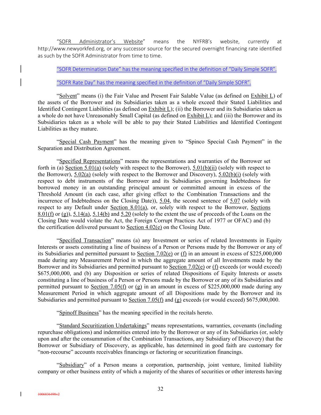 “SOFR Administrator’s Website” means the NYFRB’s website, currently at http://www.newyorkfed.org, or any successor source for the secured overnight financing rate identified as such by the SOFR Administrator from time to time. “SOFR Determination Date” has the meaning specified in the definition of “Daily Simple SOFR”. “SOFR Rate Day” has the meaning specified in the definition of “Daily Simple SOFR”. “Solvent” means (i) the Fair Value and Present Fair Salable Value (as defined on Exhibit L) of the assets of the Borrower and its Subsidiaries taken as a whole exceed their Stated Liabilities and Identified Contingent Liabilities (as defined on Exhibit L); (ii) the Borrower and its Subsidiaries taken as a whole do not have Unreasonably Small Capital (as defined on Exhibit L); and (iii) the Borrower and its Subsidiaries taken as a whole will be able to pay their Stated Liabilities and Identified Contingent Liabilities as they mature. “Special Cash Payment” has the meaning given to “Spinco Special Cash Payment” in the Separation and Distribution Agreement. “Specified Representations” means the representations and warranties of the Borrower set forth in (a) Section 5.01(a) (solely with respect to the Borrower), 5.01(b)(ii) (solely with respect to the Borrower), 5.02(a) (solely with respect to the Borrower and Discovery), 5.02(b)(i) (solely with respect to debt instruments of the Borrower and its Subsidiaries governing Indebtedness for borrowed money in an outstanding principal amount or committed amount in excess of the Threshold Amount (in each case, after giving effect to the Combination Transactions and the incurrence of Indebtedness on the Closing Date)), 5.04, the second sentence of 5.07 (solely with respect to any Default under Section 8.01(a), or, solely with respect to the Borrower, Sections 8.01(f) or (g)), 5.14(a), 5.14(b) and 5.20 (solely to the extent the use of proceeds of the Loans on the Closing Date would violate the Act, the Foreign Corrupt Practices Act of 1977 or OFAC) and (b) the certification delivered pursuant to Section 4.02(e) on the Closing Date. “Specified Transaction” means (a) any Investment or series of related Investments in Equity Interests or assets constituting a line of business of a Person or Persons made by the Borrower or any of its Subsidiaries and permitted pursuant to Section 7.02(e) or (f) in an amount in excess of $225,000,000 made during any Measurement Period in which the aggregate amount of all Investments made by the Borrower and its Subsidiaries and permitted pursuant to Section 7.02(e) or (f) exceeds (or would exceed) $675,000,000, and (b) any Disposition or series of related Dispositions of Equity Interests or assets constituting a line of business of a Person or Persons made by the Borrower or any of its Subsidiaries and permitted pursuant to Section 7.05(f) or (g) in an amount in excess of $225,000,000 made during any Measurement Period in which aggregate amount of all Dispositions made by the Borrower and its Subsidiaries and permitted pursuant to Section 7.05(f) and (g) exceeds (or would exceed) $675,000,000. “Spinoff Business” has the meaning specified in the recitals hereto. “Standard Securitization Undertakings” means representations, warranties, covenants (including repurchase obligations) and indemnities entered into by the Borrower or any of its Subsidiaries (or, solely upon and after the consummation of the Combination Transactions, any Subsidiary of Discovery) that the Borrower or Subsidiary of Discovery, as applicable, has determined in good faith are customary for “non-recourse” accounts receivables financings or factoring or securitization financings. “Subsidiary” of a Person means a corporation, partnership, joint venture, limited liability company or other business entity of which a majority of the shares of securities or other interests having 32 1006836498v2