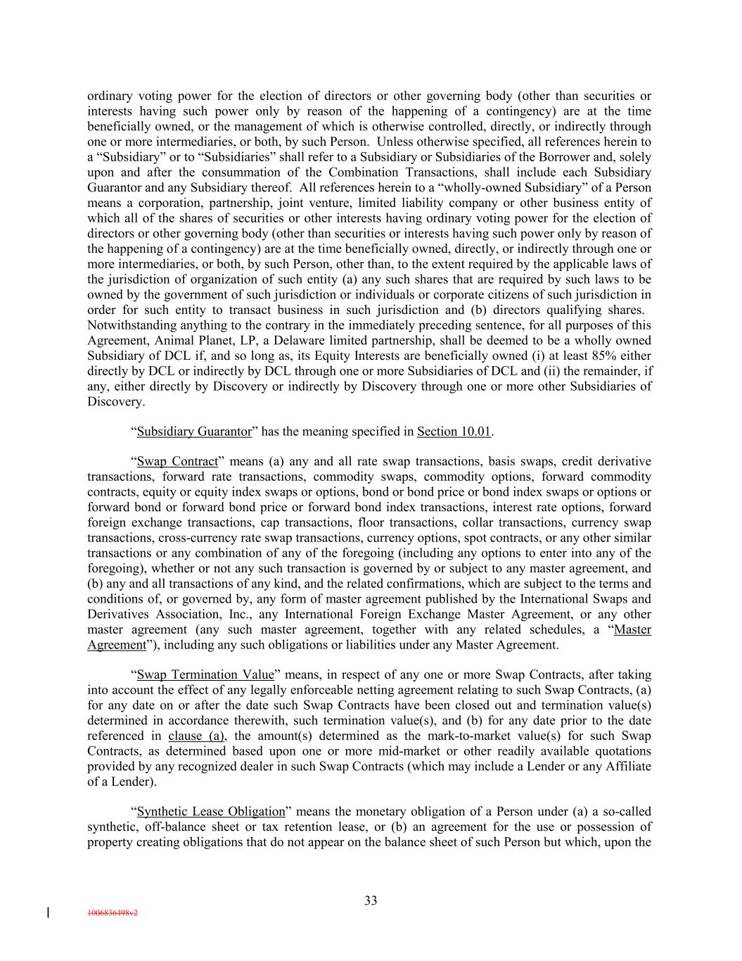 ordinary voting power for the election of directors or other governing body (other than securities or interests having such power only by reason of the happening of a contingency) are at the time beneficially owned, or the management of which is otherwise controlled, directly, or indirectly through one or more intermediaries, or both, by such Person. Unless otherwise specified, all references herein to a “Subsidiary” or to “Subsidiaries” shall refer to a Subsidiary or Subsidiaries of the Borrower and, solely upon and after the consummation of the Combination Transactions, shall include each Subsidiary Guarantor and any Subsidiary thereof. All references herein to a “wholly-owned Subsidiary” of a Person means a corporation, partnership, joint venture, limited liability company or other business entity of which all of the shares of securities or other interests having ordinary voting power for the election of directors or other governing body (other than securities or interests having such power only by reason of the happening of a contingency) are at the time beneficially owned, directly, or indirectly through one or more intermediaries, or both, by such Person, other than, to the extent required by the applicable laws of the jurisdiction of organization of such entity (a) any such shares that are required by such laws to be owned by the government of such jurisdiction or individuals or corporate citizens of such jurisdiction in order for such entity to transact business in such jurisdiction and (b) directors qualifying shares. Notwithstanding anything to the contrary in the immediately preceding sentence, for all purposes of this Agreement, Animal Planet, LP, a Delaware limited partnership, shall be deemed to be a wholly owned Subsidiary of DCL if, and so long as, its Equity Interests are beneficially owned (i) at least 85% either directly by DCL or indirectly by DCL through one or more Subsidiaries of DCL and (ii) the remainder, if any, either directly by Discovery or indirectly by Discovery through one or more other Subsidiaries of Discovery. “Subsidiary Guarantor” has the meaning specified in Section 10.01. “Swap Contract” means (a) any and all rate swap transactions, basis swaps, credit derivative transactions, forward rate transactions, commodity swaps, commodity options, forward commodity contracts, equity or equity index swaps or options, bond or bond price or bond index swaps or options or forward bond or forward bond price or forward bond index transactions, interest rate options, forward foreign exchange transactions, cap transactions, floor transactions, collar transactions, currency swap transactions, cross-currency rate swap transactions, currency options, spot contracts, or any other similar transactions or any combination of any of the foregoing (including any options to enter into any of the foregoing), whether or not any such transaction is governed by or subject to any master agreement, and (b) any and all transactions of any kind, and the related confirmations, which are subject to the terms and conditions of, or governed by, any form of master agreement published by the International Swaps and Derivatives Association, Inc., any International Foreign Exchange Master Agreement, or any other master agreement (any such master agreement, together with any related schedules, a “Master Agreement”), including any such obligations or liabilities under any Master Agreement. “Swap Termination Value” means, in respect of any one or more Swap Contracts, after taking into account the effect of any legally enforceable netting agreement relating to such Swap Contracts, (a) for any date on or after the date such Swap Contracts have been closed out and termination value(s) determined in accordance therewith, such termination value(s), and (b) for any date prior to the date referenced in clause (a), the amount(s) determined as the mark-to-market value(s) for such Swap Contracts, as determined based upon one or more mid-market or other readily available quotations provided by any recognized dealer in such Swap Contracts (which may include a Lender or any Affiliate of a Lender). “Synthetic Lease Obligation” means the monetary obligation of a Person under (a) a so-called synthetic, off-balance sheet or tax retention lease, or (b) an agreement for the use or possession of property creating obligations that do not appear on the balance sheet of such Person but which, upon the 33 1006836498v2