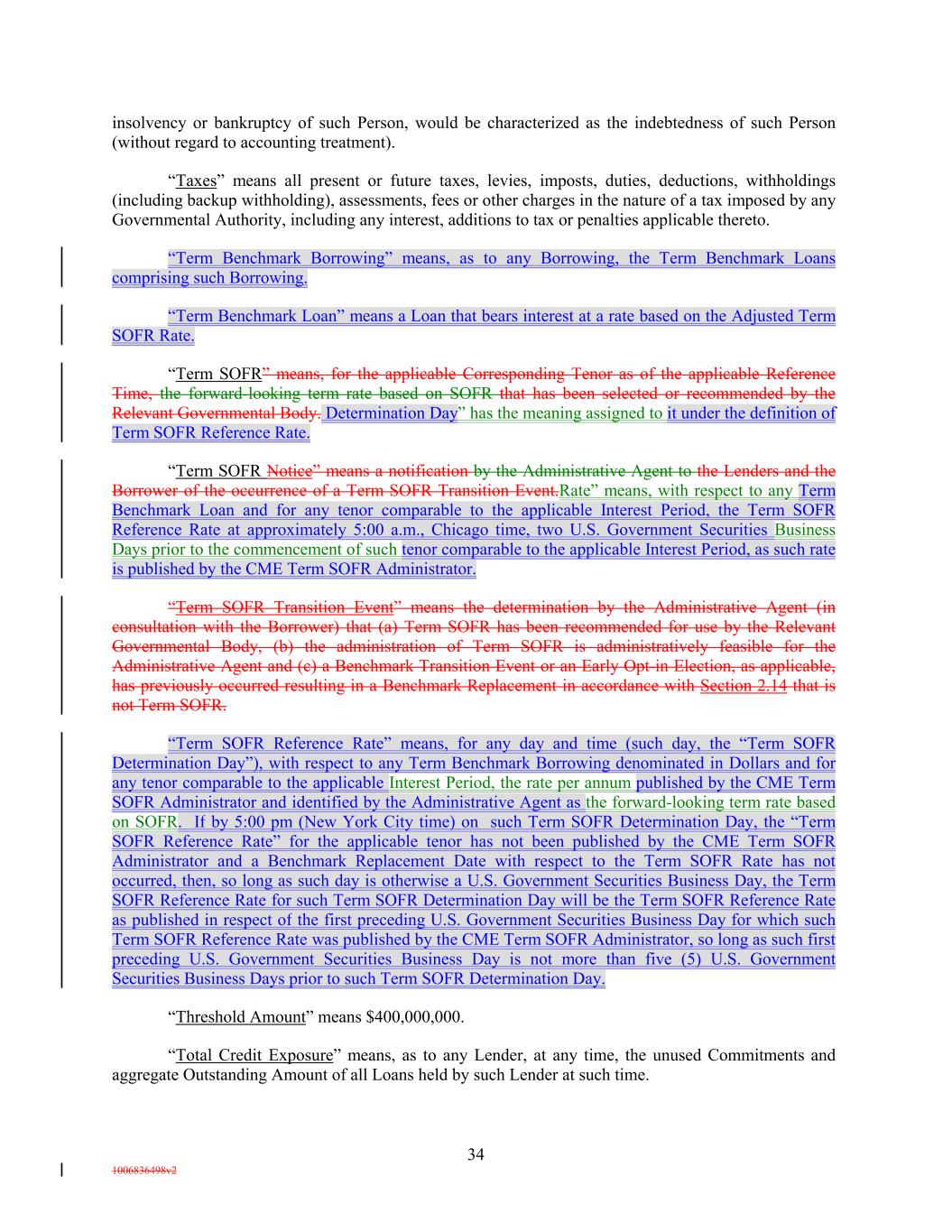 insolvency or bankruptcy of such Person, would be characterized as the indebtedness of such Person (without regard to accounting treatment). “Taxes” means all present or future taxes, levies, imposts, duties, deductions, withholdings (including backup withholding), assessments, fees or other charges in the nature of a tax imposed by any Governmental Authority, including any interest, additions to tax or penalties applicable thereto. “Term Benchmark Borrowing” means, as to any Borrowing, the Term Benchmark Loans comprising such Borrowing. “Term Benchmark Loan” means a Loan that bears interest at a rate based on the Adjusted Term SOFR Rate. “Term SOFR” means, for the applicable Corresponding Tenor as of the applicable Reference Time, the forward-looking term rate based on SOFR that has been selected or recommended by the Relevant Governmental Body. Determination Day” has the meaning assigned to it under the definition of Term SOFR Reference Rate. “Term SOFR Notice” means a notification by the Administrative Agent to the Lenders and the Borrower of the occurrence of a Term SOFR Transition Event.Rate” means, with respect to any Term Benchmark Loan and for any tenor comparable to the applicable Interest Period, the Term SOFR Reference Rate at approximately 5:00 a.m., Chicago time, two U.S. Government Securities Business Days prior to the commencement of such tenor comparable to the applicable Interest Period, as such rate is published by the CME Term SOFR Administrator. “Term SOFR Transition Event” means the determination by the Administrative Agent (in consultation with the Borrower) that (a) Term SOFR has been recommended for use by the Relevant Governmental Body, (b) the administration of Term SOFR is administratively feasible for the Administrative Agent and (c) a Benchmark Transition Event or an Early Opt-in Election, as applicable, has previously occurred resulting in a Benchmark Replacement in accordance with Section 2.14 that is not Term SOFR. “Term SOFR Reference Rate” means, for any day and time (such day, the “Term SOFR Determination Day”), with respect to any Term Benchmark Borrowing denominated in Dollars and for any tenor comparable to the applicable Interest Period, the rate per annum published by the CME Term SOFR Administrator and identified by the Administrative Agent as the forward-looking term rate based on SOFR. If by 5:00 pm (New York City time) on such Term SOFR Determination Day, the “Term SOFR Reference Rate” for the applicable tenor has not been published by the CME Term SOFR Administrator and a Benchmark Replacement Date with respect to the Term SOFR Rate has not occurred, then, so long as such day is otherwise a U.S. Government Securities Business Day, the Term SOFR Reference Rate for such Term SOFR Determination Day will be the Term SOFR Reference Rate as published in respect of the first preceding U.S. Government Securities Business Day for which such Term SOFR Reference Rate was published by the CME Term SOFR Administrator, so long as such first preceding U.S. Government Securities Business Day is not more than five (5) U.S. Government Securities Business Days prior to such Term SOFR Determination Day. “Threshold Amount” means $400,000,000. “Total Credit Exposure” means, as to any Lender, at any time, the unused Commitments and aggregate Outstanding Amount of all Loans held by such Lender at such time. 34 1006836498v2
