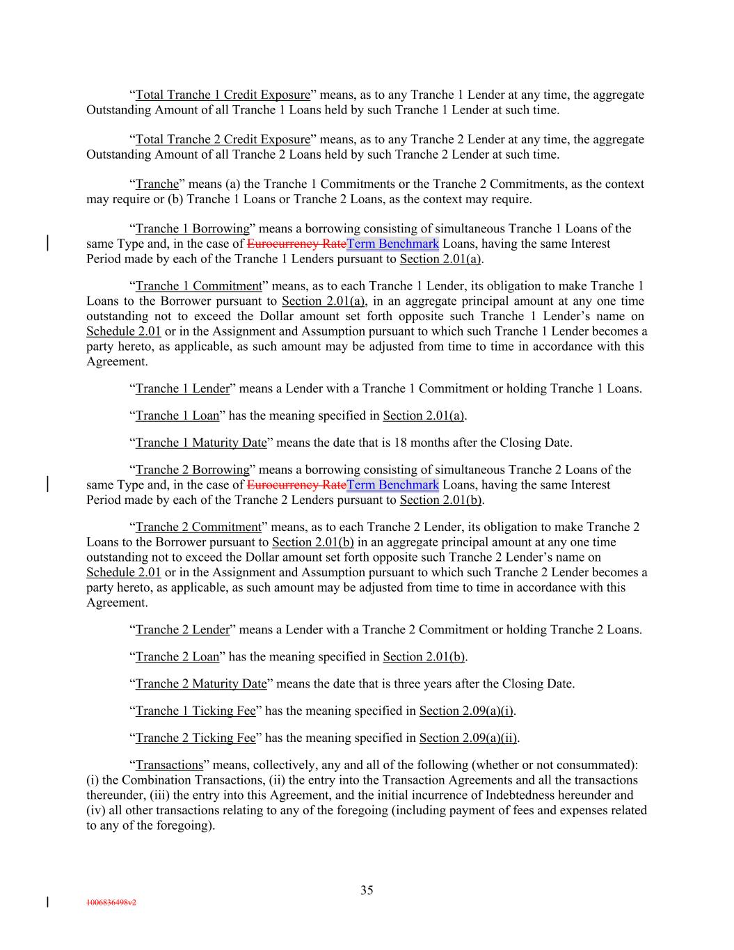 “Total Tranche 1 Credit Exposure” means, as to any Tranche 1 Lender at any time, the aggregate Outstanding Amount of all Tranche 1 Loans held by such Tranche 1 Lender at such time. “Total Tranche 2 Credit Exposure” means, as to any Tranche 2 Lender at any time, the aggregate Outstanding Amount of all Tranche 2 Loans held by such Tranche 2 Lender at such time. “Tranche” means (a) the Tranche 1 Commitments or the Tranche 2 Commitments, as the context may require or (b) Tranche 1 Loans or Tranche 2 Loans, as the context may require. “Tranche 1 Borrowing” means a borrowing consisting of simultaneous Tranche 1 Loans of the same Type and, in the case of Eurocurrency RateTerm Benchmark Loans, having the same Interest Period made by each of the Tranche 1 Lenders pursuant to Section 2.01(a). “Tranche 1 Commitment” means, as to each Tranche 1 Lender, its obligation to make Tranche 1 Loans to the Borrower pursuant to Section 2.01(a), in an aggregate principal amount at any one time outstanding not to exceed the Dollar amount set forth opposite such Tranche 1 Lender’s name on Schedule 2.01 or in the Assignment and Assumption pursuant to which such Tranche 1 Lender becomes a party hereto, as applicable, as such amount may be adjusted from time to time in accordance with this Agreement. “Tranche 1 Lender” means a Lender with a Tranche 1 Commitment or holding Tranche 1 Loans. “Tranche 1 Loan” has the meaning specified in Section 2.01(a). “Tranche 1 Maturity Date” means the date that is 18 months after the Closing Date. “Tranche 2 Borrowing” means a borrowing consisting of simultaneous Tranche 2 Loans of the same Type and, in the case of Eurocurrency RateTerm Benchmark Loans, having the same Interest Period made by each of the Tranche 2 Lenders pursuant to Section 2.01(b). “Tranche 2 Commitment” means, as to each Tranche 2 Lender, its obligation to make Tranche 2 Loans to the Borrower pursuant to Section 2.01(b) in an aggregate principal amount at any one time outstanding not to exceed the Dollar amount set forth opposite such Tranche 2 Lender’s name on Schedule 2.01 or in the Assignment and Assumption pursuant to which such Tranche 2 Lender becomes a party hereto, as applicable, as such amount may be adjusted from time to time in accordance with this Agreement. “Tranche 2 Lender” means a Lender with a Tranche 2 Commitment or holding Tranche 2 Loans. “Tranche 2 Loan” has the meaning specified in Section 2.01(b). “Tranche 2 Maturity Date” means the date that is three years after the Closing Date. “Tranche 1 Ticking Fee” has the meaning specified in Section 2.09(a)(i). “Tranche 2 Ticking Fee” has the meaning specified in Section 2.09(a)(ii). “Transactions” means, collectively, any and all of the following (whether or not consummated): (i) the Combination Transactions, (ii) the entry into the Transaction Agreements and all the transactions thereunder, (iii) the entry into this Agreement, and the initial incurrence of Indebtedness hereunder and (iv) all other transactions relating to any of the foregoing (including payment of fees and expenses related to any of the foregoing). 35 1006836498v2