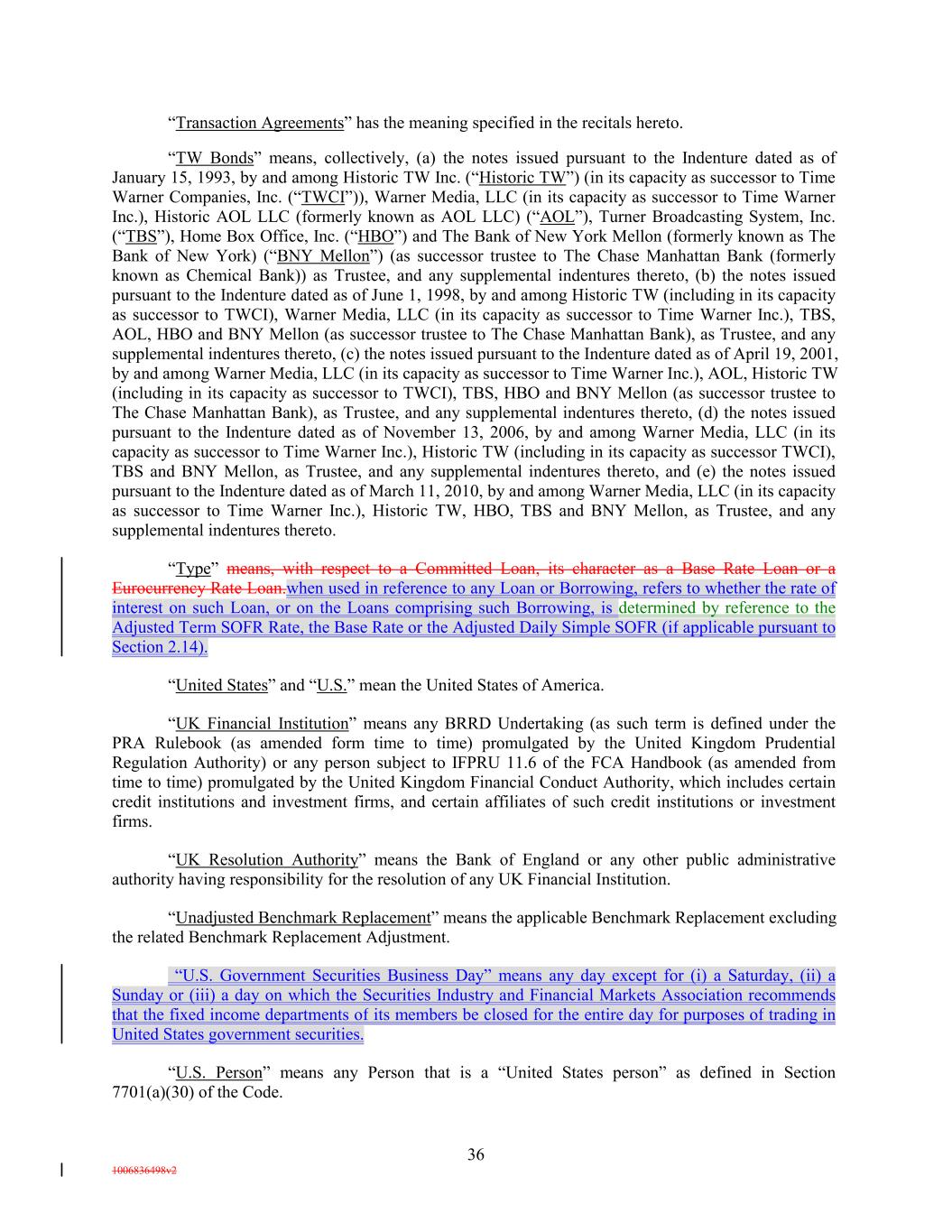 “Transaction Agreements” has the meaning specified in the recitals hereto. “TW Bonds” means, collectively, (a) the notes issued pursuant to the Indenture dated as of January 15, 1993, by and among Historic TW Inc. (“Historic TW”) (in its capacity as successor to Time Warner Companies, Inc. (“TWCI”)), Warner Media, LLC (in its capacity as successor to Time Warner Inc.), Historic AOL LLC (formerly known as AOL LLC) (“AOL”), Turner Broadcasting System, Inc. (“TBS”), Home Box Office, Inc. (“HBO”) and The Bank of New York Mellon (formerly known as The Bank of New York) (“BNY Mellon”) (as successor trustee to The Chase Manhattan Bank (formerly known as Chemical Bank)) as Trustee, and any supplemental indentures thereto, (b) the notes issued pursuant to the Indenture dated as of June 1, 1998, by and among Historic TW (including in its capacity as successor to TWCI), Warner Media, LLC (in its capacity as successor to Time Warner Inc.), TBS, AOL, HBO and BNY Mellon (as successor trustee to The Chase Manhattan Bank), as Trustee, and any supplemental indentures thereto, (c) the notes issued pursuant to the Indenture dated as of April 19, 2001, by and among Warner Media, LLC (in its capacity as successor to Time Warner Inc.), AOL, Historic TW (including in its capacity as successor to TWCI), TBS, HBO and BNY Mellon (as successor trustee to The Chase Manhattan Bank), as Trustee, and any supplemental indentures thereto, (d) the notes issued pursuant to the Indenture dated as of November 13, 2006, by and among Warner Media, LLC (in its capacity as successor to Time Warner Inc.), Historic TW (including in its capacity as successor TWCI), TBS and BNY Mellon, as Trustee, and any supplemental indentures thereto, and (e) the notes issued pursuant to the Indenture dated as of March 11, 2010, by and among Warner Media, LLC (in its capacity as successor to Time Warner Inc.), Historic TW, HBO, TBS and BNY Mellon, as Trustee, and any supplemental indentures thereto. “Type” means, with respect to a Committed Loan, its character as a Base Rate Loan or a Eurocurrency Rate Loan.when used in reference to any Loan or Borrowing, refers to whether the rate of interest on such Loan, or on the Loans comprising such Borrowing, is determined by reference to the Adjusted Term SOFR Rate, the Base Rate or the Adjusted Daily Simple SOFR (if applicable pursuant to Section 2.14). “United States” and “U.S.” mean the United States of America. “UK Financial Institution” means any BRRD Undertaking (as such term is defined under the PRA Rulebook (as amended form time to time) promulgated by the United Kingdom Prudential Regulation Authority) or any person subject to IFPRU 11.6 of the FCA Handbook (as amended from time to time) promulgated by the United Kingdom Financial Conduct Authority, which includes certain credit institutions and investment firms, and certain affiliates of such credit institutions or investment firms. “UK Resolution Authority” means the Bank of England or any other public administrative authority having responsibility for the resolution of any UK Financial Institution. “Unadjusted Benchmark Replacement” means the applicable Benchmark Replacement excluding the related Benchmark Replacement Adjustment. “U.S. Government Securities Business Day” means any day except for (i) a Saturday, (ii) a Sunday or (iii) a day on which the Securities Industry and Financial Markets Association recommends that the fixed income departments of its members be closed for the entire day for purposes of trading in United States government securities. “U.S. Person” means any Person that is a “United States person” as defined in Section 7701(a)(30) of the Code. 36 1006836498v2