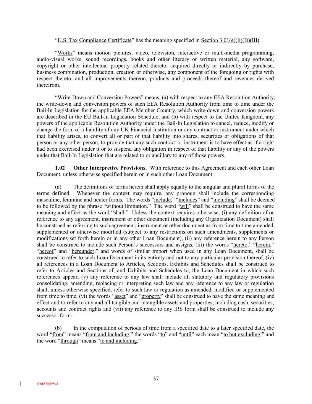 “U.S. Tax Compliance Certificate” has the meaning specified in Section 3.01(e)(ii)(B)(III). “Works” means motion pictures, video, television, interactive or multi-media programming, audio-visual works, sound recordings, books and other literary or written material, any software, copyright or other intellectual property related thereto, acquired directly or indirectly by purchase, business combination, production, creation or otherwise, any component of the foregoing or rights with respect thereto, and all improvements thereon, products and proceeds thereof and revenues derived therefrom. “Write-Down and Conversion Powers” means, (a) with respect to any EEA Resolution Authority, the write-down and conversion powers of such EEA Resolution Authority from time to time under the Bail-In Legislation for the applicable EEA Member Country, which write-down and conversion powers are described in the EU Bail-In Legislation Schedule, and (b) with respect to the United Kingdom, any powers of the applicable Resolution Authority under the Bail-In Legislation to cancel, reduce, modify or change the form of a liability of any UK Financial Institution or any contract or instrument under which that liability arises, to convert all or part of that liability into shares, securities or obligations of that person or any other person, to provide that any such contract or instrument is to have effect as if a right had been exercised under it or to suspend any obligation in respect of that liability or any of the powers under that Bail-In Legislation that are related to or ancillary to any of those powers. 1.02 Other Interpretive Provisions. With reference to this Agreement and each other Loan Document, unless otherwise specified herein or in such other Loan Document. (a) The definitions of terms herein shall apply equally to the singular and plural forms of the terms defined. Whenever the context may require, any pronoun shall include the corresponding masculine, feminine and neuter forms. The words “include,” “includes” and “including” shall be deemed to be followed by the phrase “without limitation.” The word “will” shall be construed to have the same meaning and effect as the word “shall.” Unless the context requires otherwise, (i) any definition of or reference to any agreement, instrument or other document (including any Organization Document) shall be construed as referring to such agreement, instrument or other document as from time to time amended, supplemented or otherwise modified (subject to any restrictions on such amendments, supplements or modifications set forth herein or in any other Loan Document), (ii) any reference herein to any Person shall be construed to include such Person’s successors and assigns, (iii) the words “hereto,” “herein,” “hereof” and “hereunder,” and words of similar import when used in any Loan Document, shall be construed to refer to such Loan Document in its entirety and not to any particular provision thereof, (iv) all references in a Loan Document to Articles, Sections, Exhibits and Schedules shall be construed to refer to Articles and Sections of, and Exhibits and Schedules to, the Loan Document in which such references appear, (v) any reference to any law shall include all statutory and regulatory provisions consolidating, amending, replacing or interpreting such law and any reference to any law or regulation shall, unless otherwise specified, refer to such law or regulation as amended, modified or supplemented from time to time, (vi) the words “asset” and “property” shall be construed to have the same meaning and effect and to refer to any and all tangible and intangible assets and properties, including cash, securities, accounts and contract rights and (vii) any reference to any IRS form shall be construed to include any successor form. (b) In the computation of periods of time from a specified date to a later specified date, the word “from” means “from and including;” the words “to” and “until” each mean “to but excluding;” and the word “through” means “to and including.” 37 1006836498v2
