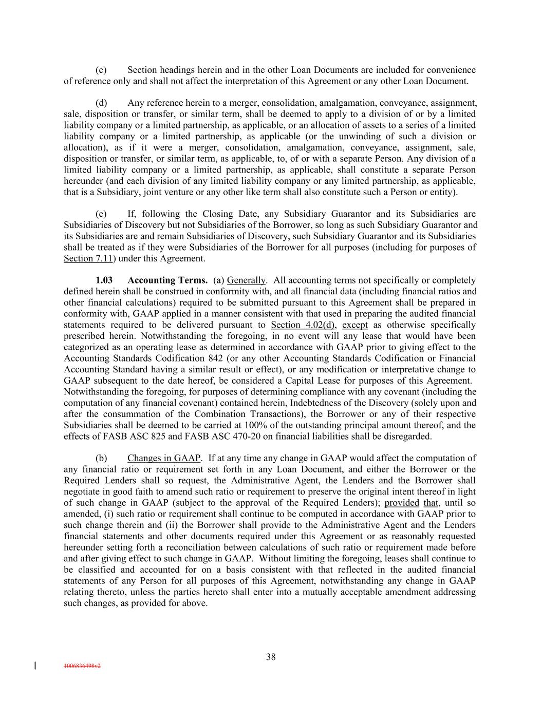 (c) Section headings herein and in the other Loan Documents are included for convenience of reference only and shall not affect the interpretation of this Agreement or any other Loan Document. (d) Any reference herein to a merger, consolidation, amalgamation, conveyance, assignment, sale, disposition or transfer, or similar term, shall be deemed to apply to a division of or by a limited liability company or a limited partnership, as applicable, or an allocation of assets to a series of a limited liability company or a limited partnership, as applicable (or the unwinding of such a division or allocation), as if it were a merger, consolidation, amalgamation, conveyance, assignment, sale, disposition or transfer, or similar term, as applicable, to, of or with a separate Person. Any division of a limited liability company or a limited partnership, as applicable, shall constitute a separate Person hereunder (and each division of any limited liability company or any limited partnership, as applicable, that is a Subsidiary, joint venture or any other like term shall also constitute such a Person or entity). (e) If, following the Closing Date, any Subsidiary Guarantor and its Subsidiaries are Subsidiaries of Discovery but not Subsidiaries of the Borrower, so long as such Subsidiary Guarantor and its Subsidiaries are and remain Subsidiaries of Discovery, such Subsidiary Guarantor and its Subsidiaries shall be treated as if they were Subsidiaries of the Borrower for all purposes (including for purposes of Section 7.11) under this Agreement. 1.03 Accounting Terms. (a) Generally. All accounting terms not specifically or completely defined herein shall be construed in conformity with, and all financial data (including financial ratios and other financial calculations) required to be submitted pursuant to this Agreement shall be prepared in conformity with, GAAP applied in a manner consistent with that used in preparing the audited financial statements required to be delivered pursuant to Section 4.02(d), except as otherwise specifically prescribed herein. Notwithstanding the foregoing, in no event will any lease that would have been categorized as an operating lease as determined in accordance with GAAP prior to giving effect to the Accounting Standards Codification 842 (or any other Accounting Standards Codification or Financial Accounting Standard having a similar result or effect), or any modification or interpretative change to GAAP subsequent to the date hereof, be considered a Capital Lease for purposes of this Agreement. Notwithstanding the foregoing, for purposes of determining compliance with any covenant (including the computation of any financial covenant) contained herein, Indebtedness of the Discovery (solely upon and after the consummation of the Combination Transactions), the Borrower or any of their respective Subsidiaries shall be deemed to be carried at 100% of the outstanding principal amount thereof, and the effects of FASB ASC 825 and FASB ASC 470-20 on financial liabilities shall be disregarded. (b) Changes in GAAP. If at any time any change in GAAP would affect the computation of any financial ratio or requirement set forth in any Loan Document, and either the Borrower or the Required Lenders shall so request, the Administrative Agent, the Lenders and the Borrower shall negotiate in good faith to amend such ratio or requirement to preserve the original intent thereof in light of such change in GAAP (subject to the approval of the Required Lenders); provided that, until so amended, (i) such ratio or requirement shall continue to be computed in accordance with GAAP prior to such change therein and (ii) the Borrower shall provide to the Administrative Agent and the Lenders financial statements and other documents required under this Agreement or as reasonably requested hereunder setting forth a reconciliation between calculations of such ratio or requirement made before and after giving effect to such change in GAAP. Without limiting the foregoing, leases shall continue to be classified and accounted for on a basis consistent with that reflected in the audited financial statements of any Person for all purposes of this Agreement, notwithstanding any change in GAAP relating thereto, unless the parties hereto shall enter into a mutually acceptable amendment addressing such changes, as provided for above. 38 1006836498v2