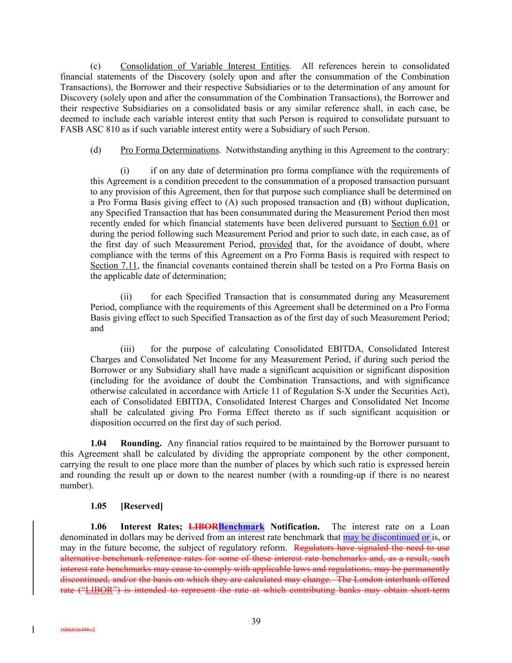 (c) Consolidation of Variable Interest Entities. All references herein to consolidated financial statements of the Discovery (solely upon and after the consummation of the Combination Transactions), the Borrower and their respective Subsidiaries or to the determination of any amount for Discovery (solely upon and after the consummation of the Combination Transactions), the Borrower and their respective Subsidiaries on a consolidated basis or any similar reference shall, in each case, be deemed to include each variable interest entity that such Person is required to consolidate pursuant to FASB ASC 810 as if such variable interest entity were a Subsidiary of such Person. (d) Pro Forma Determinations. Notwithstanding anything in this Agreement to the contrary: (i) if on any date of determination pro forma compliance with the requirements of this Agreement is a condition precedent to the consummation of a proposed transaction pursuant to any provision of this Agreement, then for that purpose such compliance shall be determined on a Pro Forma Basis giving effect to (A) such proposed transaction and (B) without duplication, any Specified Transaction that has been consummated during the Measurement Period then most recently ended for which financial statements have been delivered pursuant to Section 6.01 or during the period following such Measurement Period and prior to such date, in each case, as of the first day of such Measurement Period, provided that, for the avoidance of doubt, where compliance with the terms of this Agreement on a Pro Forma Basis is required with respect to Section 7.11, the financial covenants contained therein shall be tested on a Pro Forma Basis on the applicable date of determination; (ii) for each Specified Transaction that is consummated during any Measurement Period, compliance with the requirements of this Agreement shall be determined on a Pro Forma Basis giving effect to such Specified Transaction as of the first day of such Measurement Period; and (iii) for the purpose of calculating Consolidated EBITDA, Consolidated Interest Charges and Consolidated Net Income for any Measurement Period, if during such period the Borrower or any Subsidiary shall have made a significant acquisition or significant disposition (including for the avoidance of doubt the Combination Transactions, and with significance otherwise calculated in accordance with Article 11 of Regulation S-X under the Securities Act), each of Consolidated EBITDA, Consolidated Interest Charges and Consolidated Net Income shall be calculated giving Pro Forma Effect thereto as if such significant acquisition or disposition occurred on the first day of such period. 1.04 Rounding. Any financial ratios required to be maintained by the Borrower pursuant to this Agreement shall be calculated by dividing the appropriate component by the other component, carrying the result to one place more than the number of places by which such ratio is expressed herein and rounding the result up or down to the nearest number (with a rounding-up if there is no nearest number). 1.05 [Reserved] 1.06 Interest Rates; LIBORBenchmark Notification. The interest rate on a Loan denominated in dollars may be derived from an interest rate benchmark that may be discontinued or is, or may in the future become, the subject of regulatory reform. Regulators have signaled the need to use alternative benchmark reference rates for some of these interest rate benchmarks and, as a result, such interest rate benchmarks may cease to comply with applicable laws and regulations, may be permanently discontinued, and/or the basis on which they are calculated may change. The London interbank offered rate (“LIBOR”) is intended to represent the rate at which contributing banks may obtain short-term 39 1006836498v2