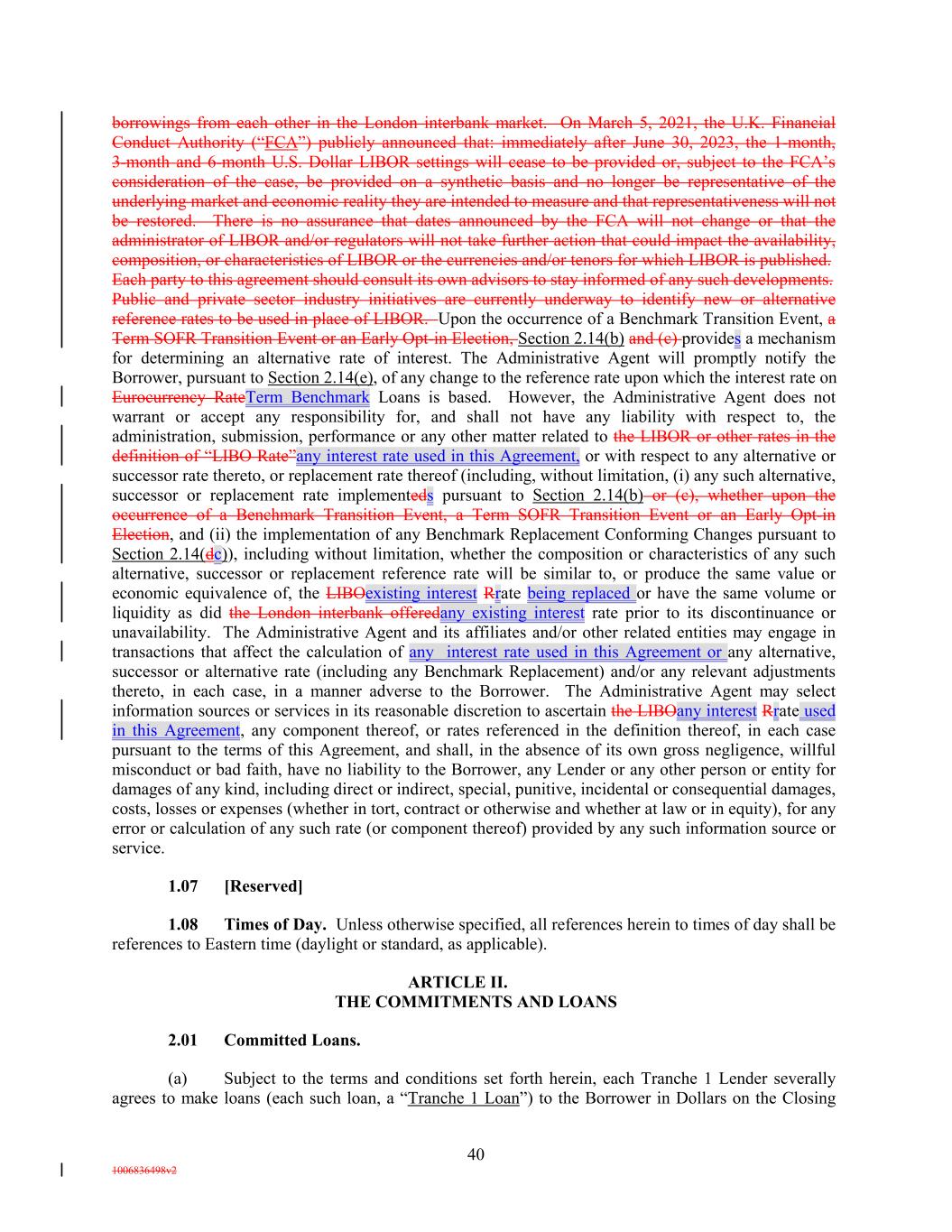 borrowings from each other in the London interbank market. On March 5, 2021, the U.K. Financial Conduct Authority (“FCA”) publicly announced that: immediately after June 30, 2023, the 1-month, 3-month and 6-month U.S. Dollar LIBOR settings will cease to be provided or, subject to the FCA’s consideration of the case, be provided on a synthetic basis and no longer be representative of the underlying market and economic reality they are intended to measure and that representativeness will not be restored. There is no assurance that dates announced by the FCA will not change or that the administrator of LIBOR and/or regulators will not take further action that could impact the availability, composition, or characteristics of LIBOR or the currencies and/or tenors for which LIBOR is published. Each party to this agreement should consult its own advisors to stay informed of any such developments. Public and private sector industry initiatives are currently underway to identify new or alternative reference rates to be used in place of LIBOR. Upon the occurrence of a Benchmark Transition Event, a Term SOFR Transition Event or an Early Opt-in Election, Section 2.14(b) and (c) provides a mechanism for determining an alternative rate of interest. The Administrative Agent will promptly notify the Borrower, pursuant to Section 2.14(e), of any change to the reference rate upon which the interest rate on Eurocurrency RateTerm Benchmark Loans is based. However, the Administrative Agent does not warrant or accept any responsibility for, and shall not have any liability with respect to, the administration, submission, performance or any other matter related to the LIBOR or other rates in the definition of “LIBO Rate”any interest rate used in this Agreement, or with respect to any alternative or successor rate thereto, or replacement rate thereof (including, without limitation, (i) any such alternative, successor or replacement rate implementeds pursuant to Section 2.14(b) or (c), whether upon the occurrence of a Benchmark Transition Event, a Term SOFR Transition Event or an Early Opt-in Election, and (ii) the implementation of any Benchmark Replacement Conforming Changes pursuant to Section 2.14(dc)), including without limitation, whether the composition or characteristics of any such alternative, successor or replacement reference rate will be similar to, or produce the same value or economic equivalence of, the LIBOexisting interest Rrate being replaced or have the same volume or liquidity as did the London interbank offeredany existing interest rate prior to its discontinuance or unavailability. The Administrative Agent and its affiliates and/or other related entities may engage in transactions that affect the calculation of any interest rate used in this Agreement or any alternative, successor or alternative rate (including any Benchmark Replacement) and/or any relevant adjustments thereto, in each case, in a manner adverse to the Borrower. The Administrative Agent may select information sources or services in its reasonable discretion to ascertain the LIBOany interest Rrate used in this Agreement, any component thereof, or rates referenced in the definition thereof, in each case pursuant to the terms of this Agreement, and shall, in the absence of its own gross negligence, willful misconduct or bad faith, have no liability to the Borrower, any Lender or any other person or entity for damages of any kind, including direct or indirect, special, punitive, incidental or consequential damages, costs, losses or expenses (whether in tort, contract or otherwise and whether at law or in equity), for any error or calculation of any such rate (or component thereof) provided by any such information source or service. 1.07 [Reserved] 1.08 Times of Day. Unless otherwise specified, all references herein to times of day shall be references to Eastern time (daylight or standard, as applicable). ARTICLE II. THE COMMITMENTS AND LOANS 2.01 Committed Loans. (a) Subject to the terms and conditions set forth herein, each Tranche 1 Lender severally agrees to make loans (each such loan, a “Tranche 1 Loan”) to the Borrower in Dollars on the Closing 40 1006836498v2