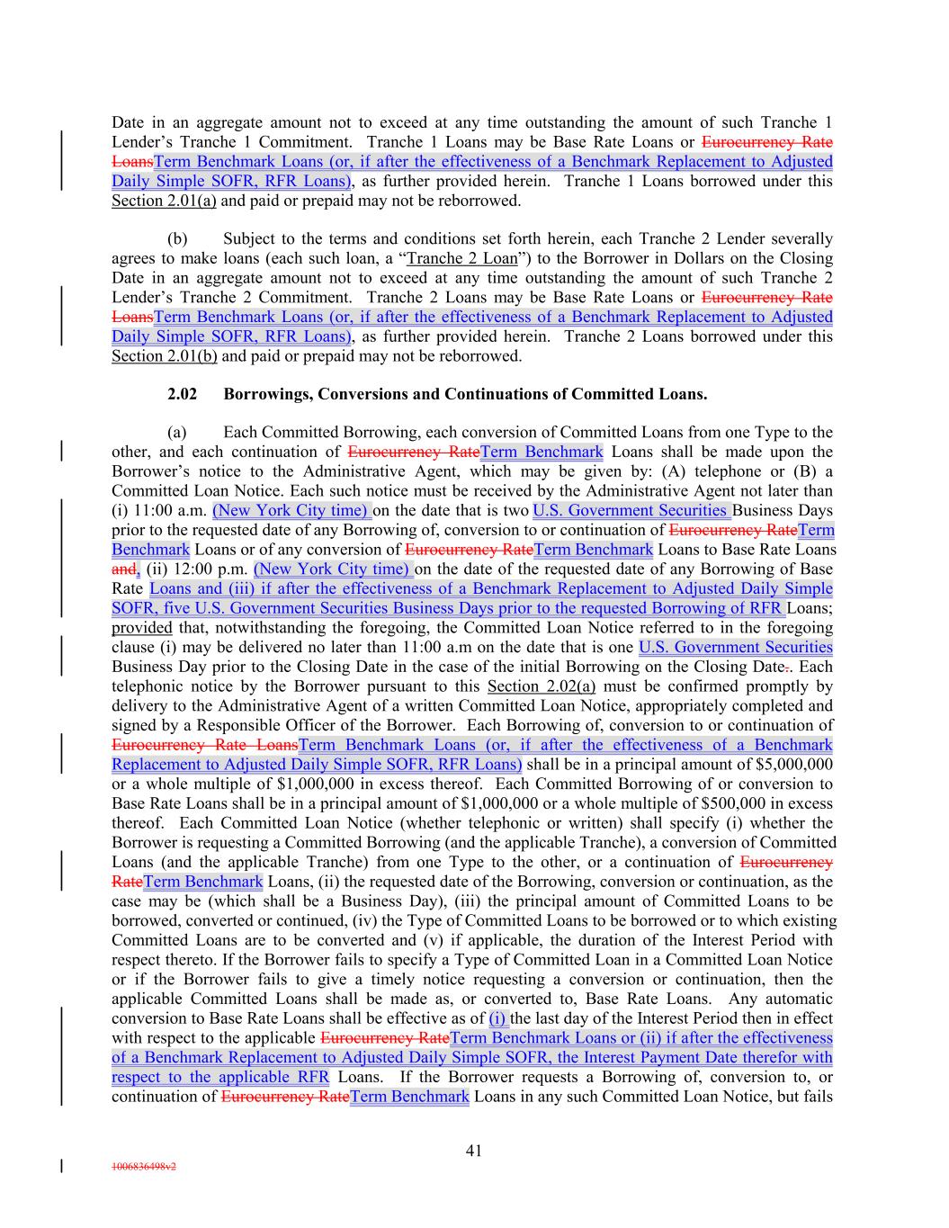 Date in an aggregate amount not to exceed at any time outstanding the amount of such Tranche 1 Lender’s Tranche 1 Commitment. Tranche 1 Loans may be Base Rate Loans or Eurocurrency Rate LoansTerm Benchmark Loans (or, if after the effectiveness of a Benchmark Replacement to Adjusted Daily Simple SOFR, RFR Loans), as further provided herein. Tranche 1 Loans borrowed under this Section 2.01(a) and paid or prepaid may not be reborrowed. (b) Subject to the terms and conditions set forth herein, each Tranche 2 Lender severally agrees to make loans (each such loan, a “Tranche 2 Loan”) to the Borrower in Dollars on the Closing Date in an aggregate amount not to exceed at any time outstanding the amount of such Tranche 2 Lender’s Tranche 2 Commitment. Tranche 2 Loans may be Base Rate Loans or Eurocurrency Rate LoansTerm Benchmark Loans (or, if after the effectiveness of a Benchmark Replacement to Adjusted Daily Simple SOFR, RFR Loans), as further provided herein. Tranche 2 Loans borrowed under this Section 2.01(b) and paid or prepaid may not be reborrowed. 2.02 Borrowings, Conversions and Continuations of Committed Loans. (a) Each Committed Borrowing, each conversion of Committed Loans from one Type to the other, and each continuation of Eurocurrency RateTerm Benchmark Loans shall be made upon the Borrower’s notice to the Administrative Agent, which may be given by: (A) telephone or (B) a Committed Loan Notice. Each such notice must be received by the Administrative Agent not later than (i) 11:00 a.m. (New York City time) on the date that is two U.S. Government Securities Business Days prior to the requested date of any Borrowing of, conversion to or continuation of Eurocurrency RateTerm Benchmark Loans or of any conversion of Eurocurrency RateTerm Benchmark Loans to Base Rate Loans and, (ii) 12:00 p.m. (New York City time) on the date of the requested date of any Borrowing of Base Rate Loans and (iii) if after the effectiveness of a Benchmark Replacement to Adjusted Daily Simple SOFR, five U.S. Government Securities Business Days prior to the requested Borrowing of RFR Loans; provided that, notwithstanding the foregoing, the Committed Loan Notice referred to in the foregoing clause (i) may be delivered no later than 11:00 a.m on the date that is one U.S. Government Securities Business Day prior to the Closing Date in the case of the initial Borrowing on the Closing Date.. Each telephonic notice by the Borrower pursuant to this Section 2.02(a) must be confirmed promptly by delivery to the Administrative Agent of a written Committed Loan Notice, appropriately completed and signed by a Responsible Officer of the Borrower. Each Borrowing of, conversion to or continuation of Eurocurrency Rate LoansTerm Benchmark Loans (or, if after the effectiveness of a Benchmark Replacement to Adjusted Daily Simple SOFR, RFR Loans) shall be in a principal amount of $5,000,000 or a whole multiple of $1,000,000 in excess thereof. Each Committed Borrowing of or conversion to Base Rate Loans shall be in a principal amount of $1,000,000 or a whole multiple of $500,000 in excess thereof. Each Committed Loan Notice (whether telephonic or written) shall specify (i) whether the Borrower is requesting a Committed Borrowing (and the applicable Tranche), a conversion of Committed Loans (and the applicable Tranche) from one Type to the other, or a continuation of Eurocurrency RateTerm Benchmark Loans, (ii) the requested date of the Borrowing, conversion or continuation, as the case may be (which shall be a Business Day), (iii) the principal amount of Committed Loans to be borrowed, converted or continued, (iv) the Type of Committed Loans to be borrowed or to which existing Committed Loans are to be converted and (v) if applicable, the duration of the Interest Period with respect thereto. If the Borrower fails to specify a Type of Committed Loan in a Committed Loan Notice or if the Borrower fails to give a timely notice requesting a conversion or continuation, then the applicable Committed Loans shall be made as, or converted to, Base Rate Loans. Any automatic conversion to Base Rate Loans shall be effective as of (i) the last day of the Interest Period then in effect with respect to the applicable Eurocurrency RateTerm Benchmark Loans or (ii) if after the effectiveness of a Benchmark Replacement to Adjusted Daily Simple SOFR, the Interest Payment Date therefor with respect to the applicable RFR Loans. If the Borrower requests a Borrowing of, conversion to, or continuation of Eurocurrency RateTerm Benchmark Loans in any such Committed Loan Notice, but fails 41 1006836498v2