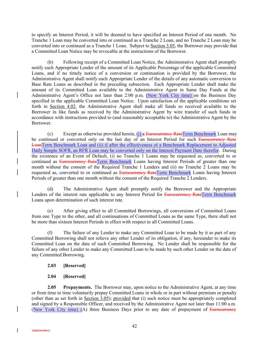 to specify an Interest Period, it will be deemed to have specified an Interest Period of one month. No Tranche 1 Loan may be converted into or continued as a Tranche 2 Loan, and no Tranche 2 Loan may be converted into or continued as a Tranche 1 Loan. Subject to Section 3.05, the Borrower may provide that a Committed Loan Notice may be revocable at the instructions of the Borrower. (b) Following receipt of a Committed Loan Notice, the Administrative Agent shall promptly notify each Appropriate Lender of the amount of its Applicable Percentage of the applicable Committed Loans, and if no timely notice of a conversion or continuation is provided by the Borrower, the Administrative Agent shall notify each Appropriate Lender of the details of any automatic conversion to Base Rate Loans as described in the preceding subsection. Each Appropriate Lender shall make the amount of its Committed Loan available to the Administrative Agent in Same Day Funds at the Administrative Agent’s Office not later than 2:00 p.m. (New York City time) on the Business Day specified in the applicable Committed Loan Notice. Upon satisfaction of the applicable conditions set forth in Section 4.02, the Administrative Agent shall make all funds so received available to the Borrower in like funds as received by the Administrative Agent by wire transfer of such funds in accordance with instructions provided to (and reasonably acceptable to) the Administrative Agent by the Borrower. (c) Except as otherwise provided herein, (i) a Eurocurrency RateTerm Benchmark Loan may be continued or converted only on the last day of an Interest Period for such Eurocurrency Rate LoanTerm Benchmark Loan and (ii) if after the effectiveness of a Benchmark Replacement to Adjusted Daily Simple SOFR, an RFR Loan may be converted only on the Interest Payment Date therefor. During the existence of an Event of Default, (i) no Tranche 1 Loans may be requested as, converted to or continued as Eurocurrency RateTerm Benchmark Loans having Interest Periods of greater than one month without the consent of the Required Tranche 1 Lenders and (ii) no Tranche 2 Loans may be requested as, converted to or continued as Eurocurrency RateTerm Benchmark Loans having Interest Periods of greater than one month without the consent of the Required Tranche 2 Lenders. (d) The Administrative Agent shall promptly notify the Borrower and the Appropriate Lenders of the interest rate applicable to any Interest Period for Eurocurrency RateTerm Benchmark Loans upon determination of such interest rate. (e) After giving effect to all Committed Borrowings, all conversions of Committed Loans from one Type to the other, and all continuations of Committed Loans as the same Type, there shall not be more than sixteen Interest Periods in effect with respect to all Committed Loans. (f) The failure of any Lender to make any Committed Loan to be made by it as part of any Committed Borrowing shall not relieve any other Lender of its obligation, if any, hereunder to make its Committed Loan on the date of such Committed Borrowing. No Lender shall be responsible for the failure of any other Lender to make any Committed Loan to be made by such other Lender on the date of any Committed Borrowing. 2.03 [Reserved] 2.04 [Reserved] 2.05 Prepayments. The Borrower may, upon notice to the Administrative Agent, at any time or from time to time voluntarily prepay Committed Loans in whole or in part without premium or penalty (other than as set forth in Section 3.05); provided that (i) such notice must be appropriately completed and signed by a Responsible Officer, and received by the Administrative Agent not later than 11:00 a.m. (New York City time) (A) three Business Days prior to any date of prepayment of Eurocurrency 42 1006836498v2