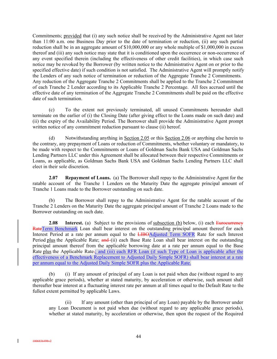 Commitments; provided that (i) any such notice shall be received by the Administrative Agent not later than 11:00 a.m. one Business Day prior to the date of termination or reduction, (ii) any such partial reduction shall be in an aggregate amount of $10,000,000 or any whole multiple of $1,000,000 in excess thereof and (iii) any such notice may state that it is conditioned upon the occurrence or non-occurrence of any event specified therein (including the effectiveness of other credit facilities), in which case such notice may be revoked by the Borrower (by written notice to the Administrative Agent on or prior to the specified effective date) if such condition is not satisfied. The Administrative Agent will promptly notify the Lenders of any such notice of termination or reduction of the Aggregate Tranche 2 Commitments. Any reduction of the Aggregate Tranche 2 Commitments shall be applied to the Tranche 2 Commitment of each Tranche 2 Lender according to its Applicable Tranche 2 Percentage. All fees accrued until the effective date of any termination of the Aggregate Tranche 2 Commitments shall be paid on the effective date of such termination. (c) To the extent not previously terminated, all unused Commitments hereunder shall terminate on the earlier of (i) the Closing Date (after giving effect to the Loans made on such date) and (ii) the expiry of the Availability Period. The Borrower shall provide the Administrative Agent prompt written notice of any commitment reduction pursuant to clause (ii) hereof. (d) Notwithstanding anything in Section 2.05 or this Section 2.06 or anything else herein to the contrary, any prepayment of Loans or reduction of Commitments, whether voluntary or mandatory, to be made with respect to the Commitments or Loans of Goldman Sachs Bank USA and Goldman Sachs Lending Partners LLC under this Agreement shall be allocated between their respective Commitments or Loans, as applicable, as Goldman Sachs Bank USA and Goldman Sachs Lending Partners LLC shall elect in their sole discretion. 2.07 Repayment of Loans. (a) The Borrower shall repay to the Administrative Agent for the ratable account of the Tranche 1 Lenders on the Maturity Date the aggregate principal amount of Tranche 1 Loans made to the Borrower outstanding on such date. (b) The Borrower shall repay to the Administrative Agent for the ratable account of the Tranche 2 Lenders on the Maturity Date the aggregate principal amount of Tranche 2 Loans made to the Borrower outstanding on such date. 2.08 Interest. (a) Subject to the provisions of subsection (b) below, (i) each Eurocurrency RateTerm Benchmark Loan shall bear interest on the outstanding principal amount thereof for each Interest Period at a rate per annum equal to the LIBOAdjusted Term SOFR Rate for such Interest Period plus the Applicable Rate; and (ii) each Base Rate Loan shall bear interest on the outstanding principal amount thereof from the applicable borrowing date at a rate per annum equal to the Base Rate plus the Applicable Rate.; and (iii) each RFR Loan (if such Type of Loan is applicable after the effectiveness of a Benchmark Replacement to Adjusted Daily Simple SOFR) shall bear interest at a rate per annum equal to the Adjusted Daily Simple SOFR plus the Applicable Rate. (b) (i) If any amount of principal of any Loan is not paid when due (without regard to any applicable grace periods), whether at stated maturity, by acceleration or otherwise, such amount shall thereafter bear interest at a fluctuating interest rate per annum at all times equal to the Default Rate to the fullest extent permitted by applicable Laws. (ii) If any amount (other than principal of any Loan) payable by the Borrower under any Loan Document is not paid when due (without regard to any applicable grace periods), whether at stated maturity, by acceleration or otherwise, then upon the request of the Required 44 1006836498v2