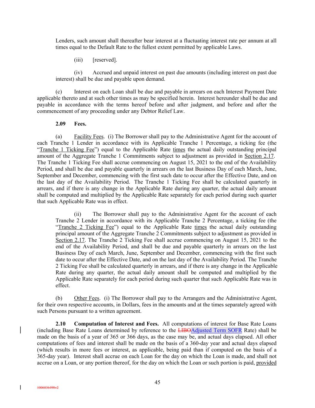 Lenders, such amount shall thereafter bear interest at a fluctuating interest rate per annum at all times equal to the Default Rate to the fullest extent permitted by applicable Laws. (iii) [reserved]. (iv) Accrued and unpaid interest on past due amounts (including interest on past due interest) shall be due and payable upon demand. (c) Interest on each Loan shall be due and payable in arrears on each Interest Payment Date applicable thereto and at such other times as may be specified herein. Interest hereunder shall be due and payable in accordance with the terms hereof before and after judgment, and before and after the commencement of any proceeding under any Debtor Relief Law. 2.09 Fees. (a) Facility Fees. (i) The Borrower shall pay to the Administrative Agent for the account of each Tranche 1 Lender in accordance with its Applicable Tranche 1 Percentage, a ticking fee (the “Tranche 1 Ticking Fee”) equal to the Applicable Rate times the actual daily outstanding principal amount of the Aggregate Tranche 1 Commitments subject to adjustment as provided in Section 2.17. The Tranche 1 Ticking Fee shall accrue commencing on August 15, 2021 to the end of the Availability Period, and shall be due and payable quarterly in arrears on the last Business Day of each March, June, September and December, commencing with the first such date to occur after the Effective Date, and on the last day of the Availability Period. The Tranche 1 Ticking Fee shall be calculated quarterly in arrears, and if there is any change in the Applicable Rate during any quarter, the actual daily amount shall be computed and multiplied by the Applicable Rate separately for each period during such quarter that such Applicable Rate was in effect. (ii) The Borrower shall pay to the Administrative Agent for the account of each Tranche 2 Lender in accordance with its Applicable Tranche 2 Percentage, a ticking fee (the “Tranche 2 Ticking Fee”) equal to the Applicable Rate times the actual daily outstanding principal amount of the Aggregate Tranche 2 Commitments subject to adjustment as provided in Section 2.17. The Tranche 2 Ticking Fee shall accrue commencing on August 15, 2021 to the end of the Availability Period, and shall be due and payable quarterly in arrears on the last Business Day of each March, June, September and December, commencing with the first such date to occur after the Effective Date, and on the last day of the Availability Period. The Tranche 2 Ticking Fee shall be calculated quarterly in arrears, and if there is any change in the Applicable Rate during any quarter, the actual daily amount shall be computed and multiplied by the Applicable Rate separately for each period during such quarter that such Applicable Rate was in effect. (b) Other Fees. (i) The Borrower shall pay to the Arrangers and the Administrative Agent, for their own respective accounts, in Dollars, fees in the amounts and at the times separately agreed with such Persons pursuant to a written agreement. 2.10 Computation of Interest and Fees. All computations of interest for Base Rate Loans (including Base Rate Loans determined by reference to the LIBOAdjusted Term SOFR Rate) shall be made on the basis of a year of 365 or 366 days, as the case may be, and actual days elapsed. All other computations of fees and interest shall be made on the basis of a 360-day year and actual days elapsed (which results in more fees or interest, as applicable, being paid than if computed on the basis of a 365-day year). Interest shall accrue on each Loan for the day on which the Loan is made, and shall not accrue on a Loan, or any portion thereof, for the day on which the Loan or such portion is paid, provided 45 1006836498v2