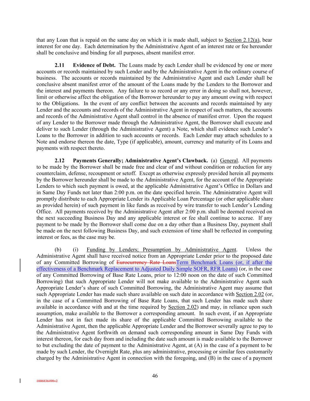 that any Loan that is repaid on the same day on which it is made shall, subject to Section 2.12(a), bear interest for one day. Each determination by the Administrative Agent of an interest rate or fee hereunder shall be conclusive and binding for all purposes, absent manifest error. 2.11 Evidence of Debt. The Loans made by each Lender shall be evidenced by one or more accounts or records maintained by such Lender and by the Administrative Agent in the ordinary course of business. The accounts or records maintained by the Administrative Agent and each Lender shall be conclusive absent manifest error of the amount of the Loans made by the Lenders to the Borrower and the interest and payments thereon. Any failure to so record or any error in doing so shall not, however, limit or otherwise affect the obligation of the Borrower hereunder to pay any amount owing with respect to the Obligations. In the event of any conflict between the accounts and records maintained by any Lender and the accounts and records of the Administrative Agent in respect of such matters, the accounts and records of the Administrative Agent shall control in the absence of manifest error. Upon the request of any Lender to the Borrower made through the Administrative Agent, the Borrower shall execute and deliver to such Lender (through the Administrative Agent) a Note, which shall evidence such Lender’s Loans to the Borrower in addition to such accounts or records. Each Lender may attach schedules to a Note and endorse thereon the date, Type (if applicable), amount, currency and maturity of its Loans and payments with respect thereto. 2.12 Payments Generally; Administrative Agent’s Clawback. (a) General. All payments to be made by the Borrower shall be made free and clear of and without condition or reduction for any counterclaim, defense, recoupment or setoff. Except as otherwise expressly provided herein all payments by the Borrower hereunder shall be made to the Administrative Agent, for the account of the Appropriate Lenders to which such payment is owed, at the applicable Administrative Agent’s Office in Dollars and in Same Day Funds not later than 2:00 p.m. on the date specified herein. The Administrative Agent will promptly distribute to each Appropriate Lender its Applicable Loan Percentage (or other applicable share as provided herein) of such payment in like funds as received by wire transfer to such Lender’s Lending Office. All payments received by the Administrative Agent after 2:00 p.m. shall be deemed received on the next succeeding Business Day and any applicable interest or fee shall continue to accrue. If any payment to be made by the Borrower shall come due on a day other than a Business Day, payment shall be made on the next following Business Day, and such extension of time shall be reflected in computing interest or fees, as the case may be. (b) (i) Funding by Lenders; Presumption by Administrative Agent. Unless the Administrative Agent shall have received notice from an Appropriate Lender prior to the proposed date of any Committed Borrowing of Eurocurrency Rate LoansTerm Benchmark Loans (or, if after the effectiveness of a Benchmark Replacement to Adjusted Daily Simple SOFR, RFR Loans) (or, in the case of any Committed Borrowing of Base Rate Loans, prior to 12:00 noon on the date of such Committed Borrowing) that such Appropriate Lender will not make available to the Administrative Agent such Appropriate Lender’s share of such Committed Borrowing, the Administrative Agent may assume that such Appropriate Lender has made such share available on such date in accordance with Section 2.02 (or, in the case of a Committed Borrowing of Base Rate Loans, that such Lender has made such share available in accordance with and at the time required by Section 2.02) and may, in reliance upon such assumption, make available to the Borrower a corresponding amount. In such event, if an Appropriate Lender has not in fact made its share of the applicable Committed Borrowing available to the Administrative Agent, then the applicable Appropriate Lender and the Borrower severally agree to pay to the Administrative Agent forthwith on demand such corresponding amount in Same Day Funds with interest thereon, for each day from and including the date such amount is made available to the Borrower to but excluding the date of payment to the Administrative Agent, at (A) in the case of a payment to be made by such Lender, the Overnight Rate, plus any administrative, processing or similar fees customarily charged by the Administrative Agent in connection with the foregoing, and (B) in the case of a payment 46 1006836498v2