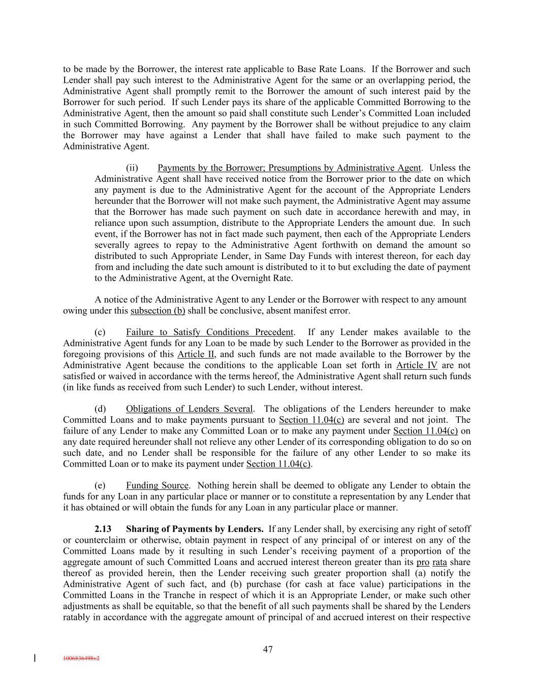 to be made by the Borrower, the interest rate applicable to Base Rate Loans. If the Borrower and such Lender shall pay such interest to the Administrative Agent for the same or an overlapping period, the Administrative Agent shall promptly remit to the Borrower the amount of such interest paid by the Borrower for such period. If such Lender pays its share of the applicable Committed Borrowing to the Administrative Agent, then the amount so paid shall constitute such Lender’s Committed Loan included in such Committed Borrowing. Any payment by the Borrower shall be without prejudice to any claim the Borrower may have against a Lender that shall have failed to make such payment to the Administrative Agent. (ii) Payments by the Borrower; Presumptions by Administrative Agent. Unless the Administrative Agent shall have received notice from the Borrower prior to the date on which any payment is due to the Administrative Agent for the account of the Appropriate Lenders hereunder that the Borrower will not make such payment, the Administrative Agent may assume that the Borrower has made such payment on such date in accordance herewith and may, in reliance upon such assumption, distribute to the Appropriate Lenders the amount due. In such event, if the Borrower has not in fact made such payment, then each of the Appropriate Lenders severally agrees to repay to the Administrative Agent forthwith on demand the amount so distributed to such Appropriate Lender, in Same Day Funds with interest thereon, for each day from and including the date such amount is distributed to it to but excluding the date of payment to the Administrative Agent, at the Overnight Rate. A notice of the Administrative Agent to any Lender or the Borrower with respect to any amount owing under this subsection (b) shall be conclusive, absent manifest error. (c) Failure to Satisfy Conditions Precedent. If any Lender makes available to the Administrative Agent funds for any Loan to be made by such Lender to the Borrower as provided in the foregoing provisions of this Article II, and such funds are not made available to the Borrower by the Administrative Agent because the conditions to the applicable Loan set forth in Article IV are not satisfied or waived in accordance with the terms hereof, the Administrative Agent shall return such funds (in like funds as received from such Lender) to such Lender, without interest. (d) Obligations of Lenders Several. The obligations of the Lenders hereunder to make Committed Loans and to make payments pursuant to Section 11.04(c) are several and not joint. The failure of any Lender to make any Committed Loan or to make any payment under Section 11.04(c) on any date required hereunder shall not relieve any other Lender of its corresponding obligation to do so on such date, and no Lender shall be responsible for the failure of any other Lender to so make its Committed Loan or to make its payment under Section 11.04(c). (e) Funding Source. Nothing herein shall be deemed to obligate any Lender to obtain the funds for any Loan in any particular place or manner or to constitute a representation by any Lender that it has obtained or will obtain the funds for any Loan in any particular place or manner. 2.13 Sharing of Payments by Lenders. If any Lender shall, by exercising any right of setoff or counterclaim or otherwise, obtain payment in respect of any principal of or interest on any of the Committed Loans made by it resulting in such Lender’s receiving payment of a proportion of the aggregate amount of such Committed Loans and accrued interest thereon greater than its pro rata share thereof as provided herein, then the Lender receiving such greater proportion shall (a) notify the Administrative Agent of such fact, and (b) purchase (for cash at face value) participations in the Committed Loans in the Tranche in respect of which it is an Appropriate Lender, or make such other adjustments as shall be equitable, so that the benefit of all such payments shall be shared by the Lenders ratably in accordance with the aggregate amount of principal of and accrued interest on their respective 47 1006836498v2