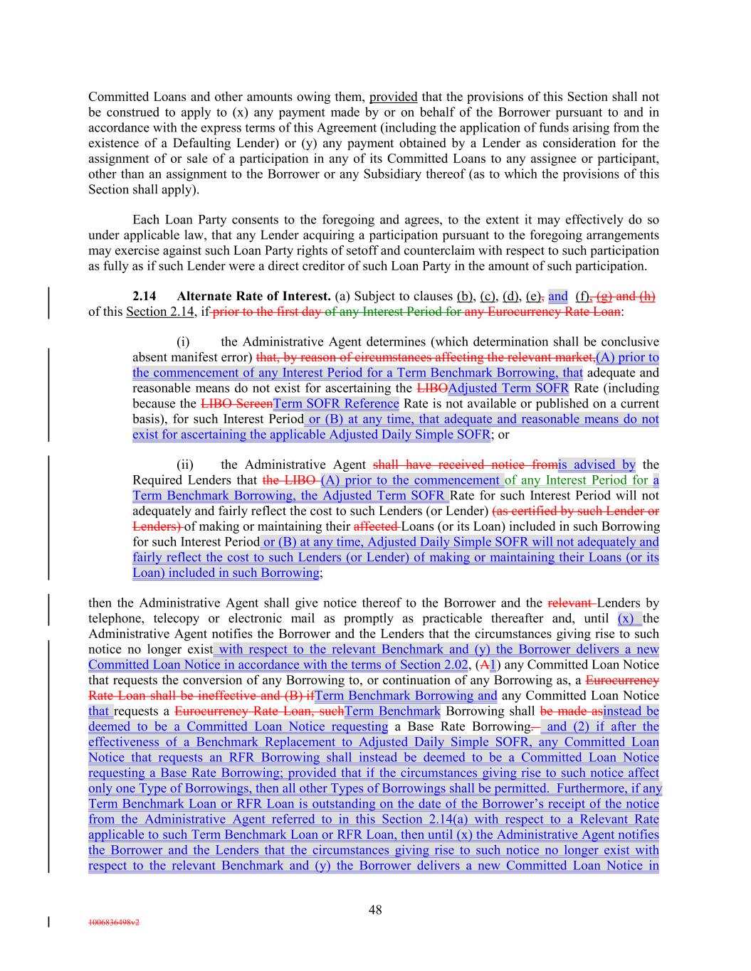 Committed Loans and other amounts owing them, provided that the provisions of this Section shall not be construed to apply to (x) any payment made by or on behalf of the Borrower pursuant to and in accordance with the express terms of this Agreement (including the application of funds arising from the existence of a Defaulting Lender) or (y) any payment obtained by a Lender as consideration for the assignment of or sale of a participation in any of its Committed Loans to any assignee or participant, other than an assignment to the Borrower or any Subsidiary thereof (as to which the provisions of this Section shall apply). Each Loan Party consents to the foregoing and agrees, to the extent it may effectively do so under applicable law, that any Lender acquiring a participation pursuant to the foregoing arrangements may exercise against such Loan Party rights of setoff and counterclaim with respect to such participation as fully as if such Lender were a direct creditor of such Loan Party in the amount of such participation. 2.14 Alternate Rate of Interest. (a) Subject to clauses (b), (c), (d), (e), and (f), (g) and (h) of this Section 2.14, if prior to the first day of any Interest Period for any Eurocurrency Rate Loan: (i) the Administrative Agent determines (which determination shall be conclusive absent manifest error) that, by reason of circumstances affecting the relevant market,(A) prior to the commencement of any Interest Period for a Term Benchmark Borrowing, that adequate and reasonable means do not exist for ascertaining the LIBOAdjusted Term SOFR Rate (including because the LIBO ScreenTerm SOFR Reference Rate is not available or published on a current basis), for such Interest Period or (B) at any time, that adequate and reasonable means do not exist for ascertaining the applicable Adjusted Daily Simple SOFR; or (ii) the Administrative Agent shall have received notice fromis advised by the Required Lenders that the LIBO (A) prior to the commencement of any Interest Period for a Term Benchmark Borrowing, the Adjusted Term SOFR Rate for such Interest Period will not adequately and fairly reflect the cost to such Lenders (or Lender) (as certified by such Lender or Lenders) of making or maintaining their affected Loans (or its Loan) included in such Borrowing for such Interest Period or (B) at any time, Adjusted Daily Simple SOFR will not adequately and fairly reflect the cost to such Lenders (or Lender) of making or maintaining their Loans (or its Loan) included in such Borrowing; then the Administrative Agent shall give notice thereof to the Borrower and the relevant Lenders by telephone, telecopy or electronic mail as promptly as practicable thereafter and, until (x) the Administrative Agent notifies the Borrower and the Lenders that the circumstances giving rise to such notice no longer exist with respect to the relevant Benchmark and (y) the Borrower delivers a new Committed Loan Notice in accordance with the terms of Section 2.02, (A1) any Committed Loan Notice that requests the conversion of any Borrowing to, or continuation of any Borrowing as, a Eurocurrency Rate Loan shall be ineffective and (B) ifTerm Benchmark Borrowing and any Committed Loan Notice that requests a Eurocurrency Rate Loan, suchTerm Benchmark Borrowing shall be made asinstead be deemed to be a Committed Loan Notice requesting a Base Rate Borrowing. and (2) if after the effectiveness of a Benchmark Replacement to Adjusted Daily Simple SOFR, any Committed Loan Notice that requests an RFR Borrowing shall instead be deemed to be a Committed Loan Notice requesting a Base Rate Borrowing; provided that if the circumstances giving rise to such notice affect only one Type of Borrowings, then all other Types of Borrowings shall be permitted. Furthermore, if any Term Benchmark Loan or RFR Loan is outstanding on the date of the Borrower’s receipt of the notice from the Administrative Agent referred to in this Section 2.14(a) with respect to a Relevant Rate applicable to such Term Benchmark Loan or RFR Loan, then until (x) the Administrative Agent notifies the Borrower and the Lenders that the circumstances giving rise to such notice no longer exist with respect to the relevant Benchmark and (y) the Borrower delivers a new Committed Loan Notice in 48 1006836498v2
