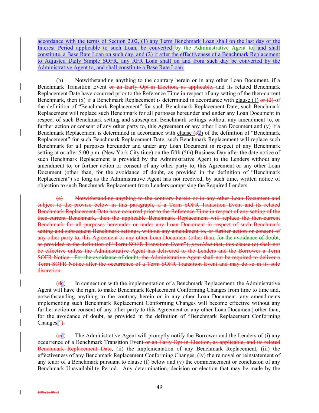 accordance with the terms of Section 2.02, (1) any Term Benchmark Loan shall on the last day of the Interest Period applicable to such Loan, be converted by the Administrative Agent to, and shall constitute, a Base Rate Loan on such day, and (2) if after the effectiveness of a Benchmark Replacement to Adjusted Daily Simple SOFR, any RFR Loan shall on and from such day be converted by the Administrative Agent to, and shall constitute a Base Rate Loan. (b) Notwithstanding anything to the contrary herein or in any other Loan Document, if a Benchmark Transition Event or an Early Opt-in Election, as applicable, and its related Benchmark Replacement Date have occurred prior to the Reference Time in respect of any setting of the then-current Benchmark, then (x) if a Benchmark Replacement is determined in accordance with clause (1) or (2) of the definition of “Benchmark Replacement” for such Benchmark Replacement Date, such Benchmark Replacement will replace such Benchmark for all purposes hereunder and under any Loan Document in respect of such Benchmark setting and subsequent Benchmark settings without any amendment to, or further action or consent of any other party to, this Agreement or any other Loan Document and (y) if a Benchmark Replacement is determined in accordance with clause (32) of the definition of “Benchmark Replacement” for such Benchmark Replacement Date, such Benchmark Replacement will replace such Benchmark for all purposes hereunder and under any Loan Document in respect of any Benchmark setting at or after 5:00 p.m. (New York City time) on the fifth (5th) Business Day after the date notice of such Benchmark Replacement is provided by the Administrative Agent to the Lenders without any amendment to, or further action or consent of any other party to, this Agreement or any other Loan Document (other than, for the avoidance of doubt, as provided in the definition of “Benchmark Replacement”) so long as the Administrative Agent has not received, by such time, written notice of objection to such Benchmark Replacement from Lenders comprising the Required Lenders. (c) Notwithstanding anything to the contrary herein or in any other Loan Document and subject to the proviso below in this paragraph, if a Term SOFR Transition Event and its related Benchmark Replacement Date have occurred prior to the Reference Time in respect of any setting of the then-current Benchmark, then the applicable Benchmark Replacement will replace the then-current Benchmark for all purposes hereunder or under any Loan Document in respect of such Benchmark setting and subsequent Benchmark settings, without any amendment to, or further action or consent of any other party to, this Agreement or any other Loan Document (other than, for the avoidance of doubt, as provided in the definition of “Term SOFR Transition Event”); provided that, this clause (c) shall not be effective unless the Administrative Agent has delivered to the Lenders and the Borrower a Term SOFR Notice. For the avoidance of doubt, the Administrative Agent shall not be required to deliver a Term SOFR Notice after the occurrence of a Term SOFR Transition Event and may do so in its sole discretion. (dc) In connection with the implementation of a Benchmark Replacement, the Administrative Agent will have the right to make Benchmark Replacement Conforming Changes from time to time and, notwithstanding anything to the contrary herein or in any other Loan Document, any amendments implementing such Benchmark Replacement Conforming Changes will become effective without any further action or consent of any other party to this Agreement or any other Loan Document, other than, for the avoidance of doubt, as provided in the definition of “Benchmark Replacement Conforming Changes.”). (ed) The Administrative Agent will promptly notify the Borrower and the Lenders of (i) any occurrence of a Benchmark Transition Event or an Early Opt-in Election, as applicable, and its related Benchmark Replacement Date, (ii) the implementation of any Benchmark Replacement, (iii) the effectiveness of any Benchmark Replacement Conforming Changes, (iv) the removal or reinstatement of any tenor of a Benchmark pursuant to clause (f) below and (v) the commencement or conclusion of any Benchmark Unavailability Period. Any determination, decision or election that may be made by the 49 1006836498v2