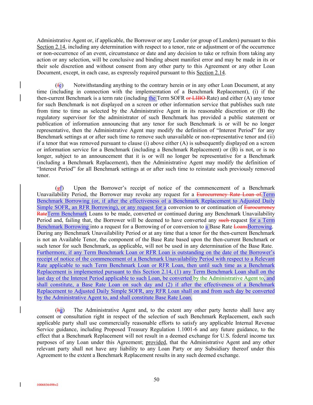 Administrative Agent or, if applicable, the Borrower or any Lender (or group of Lenders) pursuant to this Section 2.14, including any determination with respect to a tenor, rate or adjustment or of the occurrence or non-occurrence of an event, circumstance or date and any decision to take or refrain from taking any action or any selection, will be conclusive and binding absent manifest error and may be made in its or their sole discretion and without consent from any other party to this Agreement or any other Loan Document, except, in each case, as expressly required pursuant to this Section 2.14. (fe) Notwithstanding anything to the contrary herein or in any other Loan Document, at any time (including in connection with the implementation of a Benchmark Replacement), (i) if the then-current Benchmark is a term rate (including the Term SOFR or LIBO Rate) and either (A) any tenor for such Benchmark is not displayed on a screen or other information service that publishes such rate from time to time as selected by the Administrative Agent in its reasonable discretion or (B) the regulatory supervisor for the administrator of such Benchmark has provided a public statement or publication of information announcing that any tenor for such Benchmark is or will be no longer representative, then the Administrative Agent may modify the definition of “Interest Period” for any Benchmark settings at or after such time to remove such unavailable or non-representative tenor and (ii) if a tenor that was removed pursuant to clause (i) above either (A) is subsequently displayed on a screen or information service for a Benchmark (including a Benchmark Replacement) or (B) is not, or is no longer, subject to an announcement that it is or will no longer be representative for a Benchmark (including a Benchmark Replacement), then the Administrative Agent may modify the definition of “Interest Period” for all Benchmark settings at or after such time to reinstate such previously removed tenor. (gf) Upon the Borrower’s receipt of notice of the commencement of a Benchmark Unavailability Period, the Borrower may revoke any request for a Eurocurrency Rate Loan of,Term Benchmark Borrowing (or, if after the effectiveness of a Benchmark Replacement to Adjusted Daily Simple SOFR, an RFR Borrowing), or any request for a conversion to or continuation of Eurocurrency RateTerm Benchmark Loans to be made, converted or continued during any Benchmark Unavailability Period and, failing that, the Borrower will be deemed to have converted any such request for a Term Benchmark Borrowing into a request for a Borrowing of or conversion to a Base Rate LoansBorrowing. During any Benchmark Unavailability Period or at any time that a tenor for the then-current Benchmark is not an Available Tenor, the component of the Base Rate based upon the then-current Benchmark or such tenor for such Benchmark, as applicable, will not be used in any determination of the Base Rate. Furthermore, if any Term Benchmark Loan or RFR Loan is outstanding on the date of the Borrower’s receipt of notice of the commencement of a Benchmark Unavailability Period with respect to a Relevant Rate applicable to such Term Benchmark Loan or RFR Loan, then until such time as a Benchmark Replacement is implemented pursuant to this Section 2.14, (1) any Term Benchmark Loan shall on the last day of the Interest Period applicable to such Loan, be converted by the Administrative Agent to, and shall constitute, a Base Rate Loan on such day and (2) if after the effectiveness of a Benchmark Replacement to Adjusted Daily Simple SOFR, any RFR Loan shall on and from such day be converted by the Administrative Agent to, and shall constitute Base Rate Loan. (hg) The Administrative Agent and, to the extent any other party hereto shall have any consent or consultation right in respect of the selection of such Benchmark Replacement, each such applicable party shall use commercially reasonable efforts to satisfy any applicable Internal Revenue Service guidance, including Proposed Treasury Regulation 1.1001-6 and any future guidance, to the effect that a Benchmark Replacement will not result in a deemed exchange for U.S. federal income tax purposes of any Loan under this Agreement; provided, that the Administrative Agent and any other relevant party shall not have any liability to any Loan Party or any Subsidiary thereof under this Agreement to the extent a Benchmark Replacement results in any such deemed exchange. 50 1006836498v2