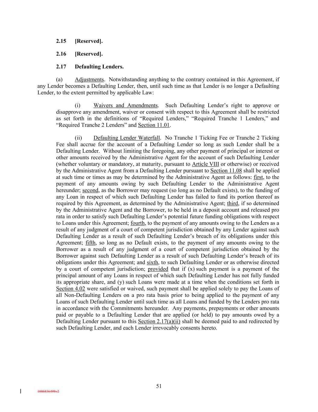 2.15 [Reserved]. 2.16 [Reserved]. 2.17 Defaulting Lenders. (a) Adjustments. Notwithstanding anything to the contrary contained in this Agreement, if any Lender becomes a Defaulting Lender, then, until such time as that Lender is no longer a Defaulting Lender, to the extent permitted by applicable Law: (i) Waivers and Amendments. Such Defaulting Lender’s right to approve or disapprove any amendment, waiver or consent with respect to this Agreement shall be restricted as set forth in the definitions of “Required Lenders,” “Required Tranche 1 Lenders,” and “Required Tranche 2 Lenders” and Section 11.01. (ii) Defaulting Lender Waterfall. No Tranche 1 Ticking Fee or Tranche 2 Ticking Fee shall accrue for the account of a Defaulting Lender so long as such Lender shall be a Defaulting Lender. Without limiting the foregoing, any other payment of principal or interest or other amounts received by the Administrative Agent for the account of such Defaulting Lender (whether voluntary or mandatory, at maturity, pursuant to Article VIII or otherwise) or received by the Administrative Agent from a Defaulting Lender pursuant to Section 11.08 shall be applied at such time or times as may be determined by the Administrative Agent as follows: first, to the payment of any amounts owing by such Defaulting Lender to the Administrative Agent hereunder; second, as the Borrower may request (so long as no Default exists), to the funding of any Loan in respect of which such Defaulting Lender has failed to fund its portion thereof as required by this Agreement, as determined by the Administrative Agent; third, if so determined by the Administrative Agent and the Borrower, to be held in a deposit account and released pro rata in order to satisfy such Defaulting Lender’s potential future funding obligations with respect to Loans under this Agreement; fourth, to the payment of any amounts owing to the Lenders as a result of any judgment of a court of competent jurisdiction obtained by any Lender against such Defaulting Lender as a result of such Defaulting Lender’s breach of its obligations under this Agreement; fifth, so long as no Default exists, to the payment of any amounts owing to the Borrower as a result of any judgment of a court of competent jurisdiction obtained by the Borrower against such Defaulting Lender as a result of such Defaulting Lender’s breach of its obligations under this Agreement; and sixth, to such Defaulting Lender or as otherwise directed by a court of competent jurisdiction; provided that if (x) such payment is a payment of the principal amount of any Loans in respect of which such Defaulting Lender has not fully funded its appropriate share, and (y) such Loans were made at a time when the conditions set forth in Section 4.02 were satisfied or waived, such payment shall be applied solely to pay the Loans of all Non-Defaulting Lenders on a pro rata basis prior to being applied to the payment of any Loans of such Defaulting Lender until such time as all Loans and funded by the Lenders pro rata in accordance with the Commitments hereunder. Any payments, prepayments or other amounts paid or payable to a Defaulting Lender that are applied (or held) to pay amounts owed by a Defaulting Lender pursuant to this Section 2.17(a)(ii) shall be deemed paid to and redirected by such Defaulting Lender, and each Lender irrevocably consents hereto. 51 1006836498v2