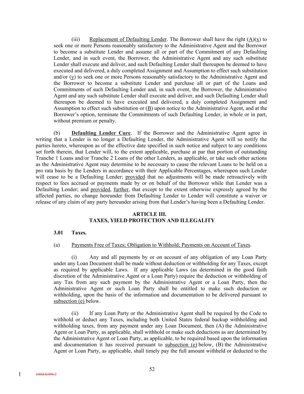 (iii) Replacement of Defaulting Lender. The Borrower shall have the right (A)(x) to seek one or more Persons reasonably satisfactory to the Administrative Agent and the Borrower to become a substitute Lender and assume all or part of the Commitment of any Defaulting Lender, and in such event, the Borrower, the Administrative Agent and any such substitute Lender shall execute and deliver, and such Defaulting Lender shall thereupon be deemed to have executed and delivered, a duly completed Assignment and Assumption to effect such substitution and/or (y) to seek one or more Persons reasonably satisfactory to the Administrative Agent and the Borrower to become a substitute Lender and purchase all or part of the Loans and Commitments of such Defaulting Lender and, in such event, the Borrower, the Administrative Agent and any such substitute Lender shall execute and deliver, and such Defaulting Lender shall thereupon be deemed to have executed and delivered, a duly completed Assignment and Assumption to effect such substitution or (B) upon notice to the Administrative Agent, and at the Borrower’s option, terminate the Commitments of such Defaulting Lender, in whole or in part, without premium or penalty. (b) Defaulting Lender Cure. If the Borrower and the Administrative Agent agree in writing that a Lender is no longer a Defaulting Lender, the Administrative Agent will so notify the parties hereto, whereupon as of the effective date specified in such notice and subject to any conditions set forth therein, that Lender will, to the extent applicable, purchase at par that portion of outstanding Tranche 1 Loans and/or Tranche 2 Loans of the other Lenders, as applicable, or take such other actions as the Administrative Agent may determine to be necessary to cause the relevant Loans to be held on a pro rata basis by the Lenders in accordance with their Applicable Percentages, whereupon such Lender will cease to be a Defaulting Lender; provided that no adjustments will be made retroactively with respect to fees accrued or payments made by or on behalf of the Borrower while that Lender was a Defaulting Lender; and provided, further, that except to the extent otherwise expressly agreed by the affected parties, no change hereunder from Defaulting Lender to Lender will constitute a waiver or release of any claim of any party hereunder arising from that Lender’s having been a Defaulting Lender. ARTICLE III. TAXES, YIELD PROTECTION AND ILLEGALITY 3.01 Taxes. (a) Payments Free of Taxes; Obligation to Withhold; Payments on Account of Taxes. (i) Any and all payments by or on account of any obligation of any Loan Party under any Loan Document shall be made without deduction or withholding for any Taxes, except as required by applicable Laws. If any applicable Laws (as determined in the good faith discretion of the Administrative Agent or a Loan Party) require the deduction or withholding of any Tax from any such payment by the Administrative Agent or a Loan Party, then the Administrative Agent or such Loan Party shall be entitled to make such deduction or withholding, upon the basis of the information and documentation to be delivered pursuant to subsection (e) below. (ii) If any Loan Party or the Administrative Agent shall be required by the Code to withhold or deduct any Taxes, including both United States federal backup withholding and withholding taxes, from any payment under any Loan Document, then (A) the Administrative Agent or Loan Party, as applicable, shall withhold or make such deductions as are determined by the Administrative Agent or Loan Party, as applicable, to be required based upon the information and documentation it has received pursuant to subsection (e) below, (B) the Administrative Agent or Loan Party, as applicable, shall timely pay the full amount withheld or deducted to the 52 1006836498v2
