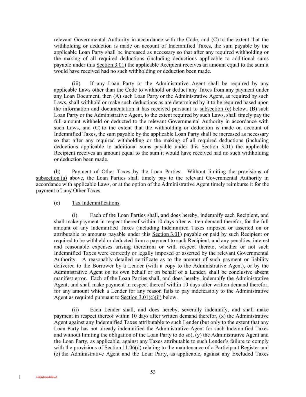 relevant Governmental Authority in accordance with the Code, and (C) to the extent that the withholding or deduction is made on account of Indemnified Taxes, the sum payable by the applicable Loan Party shall be increased as necessary so that after any required withholding or the making of all required deductions (including deductions applicable to additional sums payable under this Section 3.01) the applicable Recipient receives an amount equal to the sum it would have received had no such withholding or deduction been made. (iii) If any Loan Party or the Administrative Agent shall be required by any applicable Laws other than the Code to withhold or deduct any Taxes from any payment under any Loan Document, then (A) such Loan Party or the Administrative Agent, as required by such Laws, shall withhold or make such deductions as are determined by it to be required based upon the information and documentation it has received pursuant to subsection (e) below, (B) such Loan Party or the Administrative Agent, to the extent required by such Laws, shall timely pay the full amount withheld or deducted to the relevant Governmental Authority in accordance with such Laws, and (C) to the extent that the withholding or deduction is made on account of Indemnified Taxes, the sum payable by the applicable Loan Party shall be increased as necessary so that after any required withholding or the making of all required deductions (including deductions applicable to additional sums payable under this Section 3.01) the applicable Recipient receives an amount equal to the sum it would have received had no such withholding or deduction been made. (b) Payment of Other Taxes by the Loan Parties. Without limiting the provisions of subsection (a) above, the Loan Parties shall timely pay to the relevant Governmental Authority in accordance with applicable Laws, or at the option of the Administrative Agent timely reimburse it for the payment of, any Other Taxes. (c) Tax Indemnifications. (i) Each of the Loan Parties shall, and does hereby, indemnify each Recipient, and shall make payment in respect thereof within 10 days after written demand therefor, for the full amount of any Indemnified Taxes (including Indemnified Taxes imposed or asserted on or attributable to amounts payable under this Section 3.01) payable or paid by such Recipient or required to be withheld or deducted from a payment to such Recipient, and any penalties, interest and reasonable expenses arising therefrom or with respect thereto, whether or not such Indemnified Taxes were correctly or legally imposed or asserted by the relevant Governmental Authority. A reasonably detailed certificate as to the amount of such payment or liability delivered to the Borrower by a Lender (with a copy to the Administrative Agent), or by the Administrative Agent on its own behalf or on behalf of a Lender, shall be conclusive absent manifest error. Each of the Loan Parties shall, and does hereby, indemnify the Administrative Agent, and shall make payment in respect thereof within 10 days after written demand therefor, for any amount which a Lender for any reason fails to pay indefeasibly to the Administrative Agent as required pursuant to Section 3.01(c)(ii) below. (ii) Each Lender shall, and does hereby, severally indemnify, and shall make payment in respect thereof within 10 days after written demand therefor, (x) the Administrative Agent against any Indemnified Taxes attributable to such Lender (but only to the extent that any Loan Party has not already indemnified the Administrative Agent for such Indemnified Taxes and without limiting the obligation of the Loan Party to do so), (y) the Administrative Agent and the Loan Party, as applicable, against any Taxes attributable to such Lender’s failure to comply with the provisions of Section 11.06(d) relating to the maintenance of a Participant Register and (z) the Administrative Agent and the Loan Party, as applicable, against any Excluded Taxes 53 1006836498v2