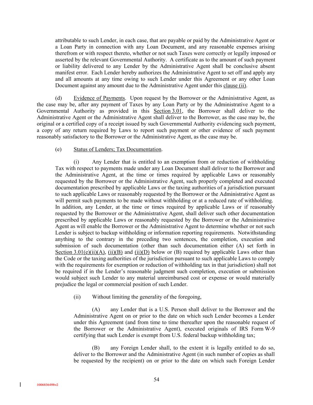 attributable to such Lender, in each case, that are payable or paid by the Administrative Agent or a Loan Party in connection with any Loan Document, and any reasonable expenses arising therefrom or with respect thereto, whether or not such Taxes were correctly or legally imposed or asserted by the relevant Governmental Authority. A certificate as to the amount of such payment or liability delivered to any Lender by the Administrative Agent shall be conclusive absent manifest error. Each Lender hereby authorizes the Administrative Agent to set off and apply any and all amounts at any time owing to such Lender under this Agreement or any other Loan Document against any amount due to the Administrative Agent under this clause (ii). (d) Evidence of Payments. Upon request by the Borrower or the Administrative Agent, as the case may be, after any payment of Taxes by any Loan Party or by the Administrative Agent to a Governmental Authority as provided in this Section 3.01, the Borrower shall deliver to the Administrative Agent or the Administrative Agent shall deliver to the Borrower, as the case may be, the original or a certified copy of a receipt issued by such Governmental Authority evidencing such payment, a copy of any return required by Laws to report such payment or other evidence of such payment reasonably satisfactory to the Borrower or the Administrative Agent, as the case may be. (e) Status of Lenders; Tax Documentation. (i) Any Lender that is entitled to an exemption from or reduction of withholding Tax with respect to payments made under any Loan Document shall deliver to the Borrower and the Administrative Agent, at the time or times required by applicable Laws or reasonably requested by the Borrower or the Administrative Agent, such properly completed and executed documentation prescribed by applicable Laws or the taxing authorities of a jurisdiction pursuant to such applicable Laws or reasonably requested by the Borrower or the Administrative Agent as will permit such payments to be made without withholding or at a reduced rate of withholding. In addition, any Lender, at the time or times required by applicable Laws or if reasonably requested by the Borrower or the Administrative Agent, shall deliver such other documentation prescribed by applicable Laws or reasonably requested by the Borrower or the Administrative Agent as will enable the Borrower or the Administrative Agent to determine whether or not such Lender is subject to backup withholding or information reporting requirements. Notwithstanding anything to the contrary in the preceding two sentences, the completion, execution and submission of such documentation (other than such documentation either (A) set forth in Section 3.01(e)(ii)(A), (ii)(B) and (ii)(D) below or (B) required by applicable Laws other than the Code or the taxing authorities of the jurisdiction pursuant to such applicable Laws to comply with the requirements for exemption or reduction of withholding tax in that jurisdiction) shall not be required if in the Lender’s reasonable judgment such completion, execution or submission would subject such Lender to any material unreimbursed cost or expense or would materially prejudice the legal or commercial position of such Lender. (ii) Without limiting the generality of the foregoing, (A) any Lender that is a U.S. Person shall deliver to the Borrower and the Administrative Agent on or prior to the date on which such Lender becomes a Lender under this Agreement (and from time to time thereafter upon the reasonable request of the Borrower or the Administrative Agent), executed originals of IRS Form W-9 certifying that such Lender is exempt from U.S. federal backup withholding tax; (B) any Foreign Lender shall, to the extent it is legally entitled to do so, deliver to the Borrower and the Administrative Agent (in such number of copies as shall be requested by the recipient) on or prior to the date on which such Foreign Lender 54 1006836498v2