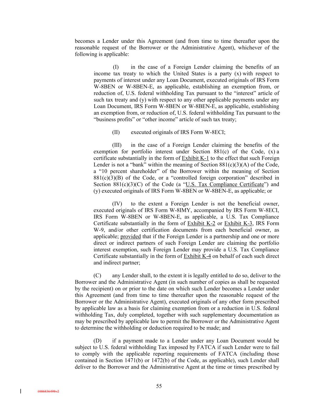 becomes a Lender under this Agreement (and from time to time thereafter upon the reasonable request of the Borrower or the Administrative Agent), whichever of the following is applicable: (I) in the case of a Foreign Lender claiming the benefits of an income tax treaty to which the United States is a party (x) with respect to payments of interest under any Loan Document, executed originals of IRS Form W-8BEN or W-8BEN-E, as applicable, establishing an exemption from, or reduction of, U.S. federal withholding Tax pursuant to the “interest” article of such tax treaty and (y) with respect to any other applicable payments under any Loan Document, IRS Form W-8BEN or W-8BEN-E, as applicable, establishing an exemption from, or reduction of, U.S. federal withholding Tax pursuant to the “business profits” or “other income” article of such tax treaty; (II) executed originals of IRS Form W-8ECI; (III) in the case of a Foreign Lender claiming the benefits of the exemption for portfolio interest under Section 881(c) of the Code, (x) a certificate substantially in the form of Exhibit K-1 to the effect that such Foreign Lender is not a “bank” within the meaning of Section 881(c)(3)(A) of the Code, a “10 percent shareholder” of the Borrower within the meaning of Section 881(c)(3)(B) of the Code, or a “controlled foreign corporation” described in Section 881(c)(3)(C) of the Code (a “U.S. Tax Compliance Certificate”) and (y) executed originals of IRS Form W-8BEN or W-8BEN-E, as applicable; or (IV) to the extent a Foreign Lender is not the beneficial owner, executed originals of IRS Form W-8IMY, accompanied by IRS Form W-8ECI, IRS Form W-8BEN or W-8BEN-E, as applicable, a U.S. Tax Compliance Certificate substantially in the form of Exhibit K-2 or Exhibit K-3, IRS Form W-9, and/or other certification documents from each beneficial owner, as applicable; provided that if the Foreign Lender is a partnership and one or more direct or indirect partners of such Foreign Lender are claiming the portfolio interest exemption, such Foreign Lender may provide a U.S. Tax Compliance Certificate substantially in the form of Exhibit K-4 on behalf of each such direct and indirect partner; (C) any Lender shall, to the extent it is legally entitled to do so, deliver to the Borrower and the Administrative Agent (in such number of copies as shall be requested by the recipient) on or prior to the date on which such Lender becomes a Lender under this Agreement (and from time to time thereafter upon the reasonable request of the Borrower or the Administrative Agent), executed originals of any other form prescribed by applicable law as a basis for claiming exemption from or a reduction in U.S. federal withholding Tax, duly completed, together with such supplementary documentation as may be prescribed by applicable law to permit the Borrower or the Administrative Agent to determine the withholding or deduction required to be made; and (D) if a payment made to a Lender under any Loan Document would be subject to U.S. federal withholding Tax imposed by FATCA if such Lender were to fail to comply with the applicable reporting requirements of FATCA (including those contained in Section 1471(b) or 1472(b) of the Code, as applicable), such Lender shall deliver to the Borrower and the Administrative Agent at the time or times prescribed by 55 1006836498v2