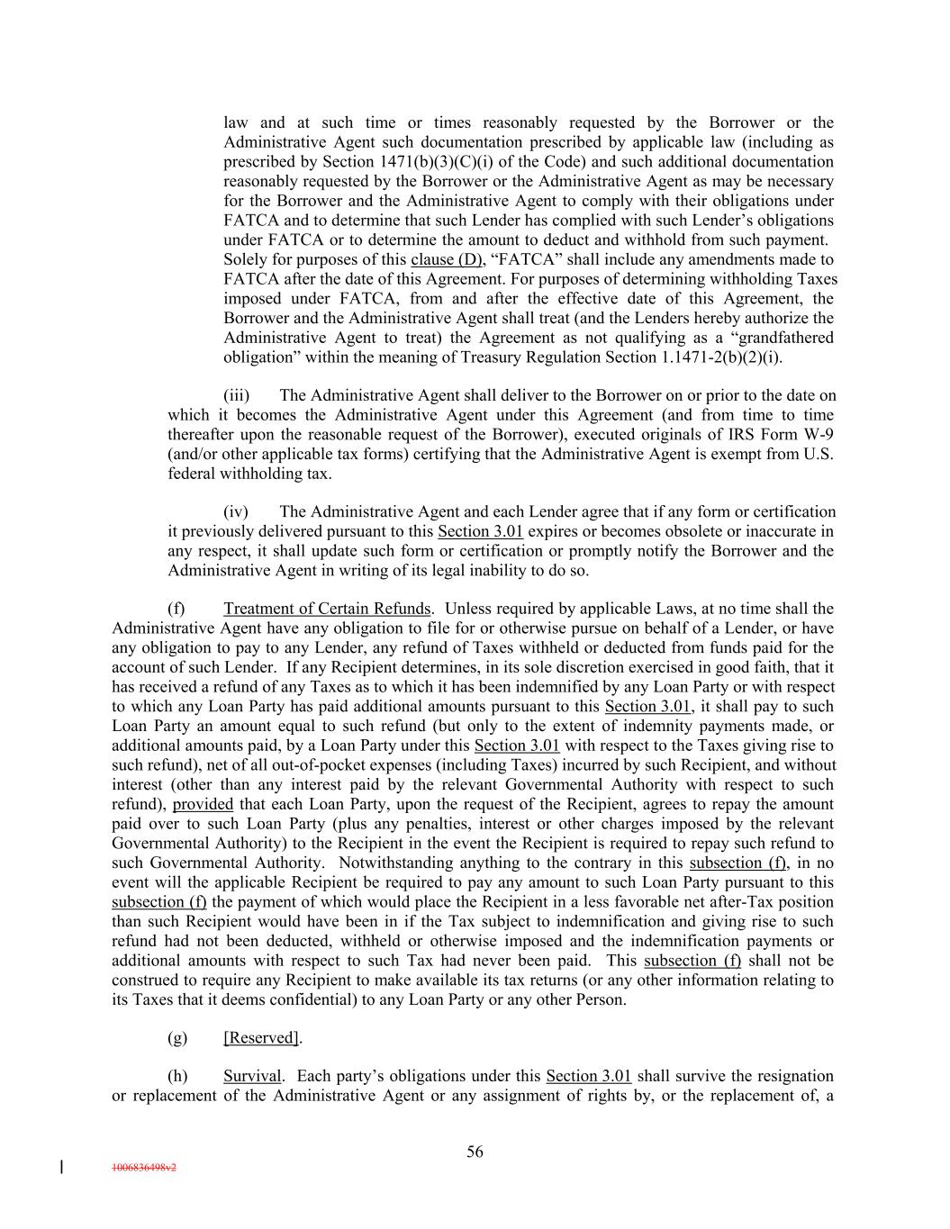 law and at such time or times reasonably requested by the Borrower or the Administrative Agent such documentation prescribed by applicable law (including as prescribed by Section 1471(b)(3)(C)(i) of the Code) and such additional documentation reasonably requested by the Borrower or the Administrative Agent as may be necessary for the Borrower and the Administrative Agent to comply with their obligations under FATCA and to determine that such Lender has complied with such Lender’s obligations under FATCA or to determine the amount to deduct and withhold from such payment. Solely for purposes of this clause (D), “FATCA” shall include any amendments made to FATCA after the date of this Agreement. For purposes of determining withholding Taxes imposed under FATCA, from and after the effective date of this Agreement, the Borrower and the Administrative Agent shall treat (and the Lenders hereby authorize the Administrative Agent to treat) the Agreement as not qualifying as a “grandfathered obligation” within the meaning of Treasury Regulation Section 1.1471-2(b)(2)(i). (iii) The Administrative Agent shall deliver to the Borrower on or prior to the date on which it becomes the Administrative Agent under this Agreement (and from time to time thereafter upon the reasonable request of the Borrower), executed originals of IRS Form W-9 (and/or other applicable tax forms) certifying that the Administrative Agent is exempt from U.S. federal withholding tax. (iv) The Administrative Agent and each Lender agree that if any form or certification it previously delivered pursuant to this Section 3.01 expires or becomes obsolete or inaccurate in any respect, it shall update such form or certification or promptly notify the Borrower and the Administrative Agent in writing of its legal inability to do so. (f) Treatment of Certain Refunds. Unless required by applicable Laws, at no time shall the Administrative Agent have any obligation to file for or otherwise pursue on behalf of a Lender, or have any obligation to pay to any Lender, any refund of Taxes withheld or deducted from funds paid for the account of such Lender. If any Recipient determines, in its sole discretion exercised in good faith, that it has received a refund of any Taxes as to which it has been indemnified by any Loan Party or with respect to which any Loan Party has paid additional amounts pursuant to this Section 3.01, it shall pay to such Loan Party an amount equal to such refund (but only to the extent of indemnity payments made, or additional amounts paid, by a Loan Party under this Section 3.01 with respect to the Taxes giving rise to such refund), net of all out-of-pocket expenses (including Taxes) incurred by such Recipient, and without interest (other than any interest paid by the relevant Governmental Authority with respect to such refund), provided that each Loan Party, upon the request of the Recipient, agrees to repay the amount paid over to such Loan Party (plus any penalties, interest or other charges imposed by the relevant Governmental Authority) to the Recipient in the event the Recipient is required to repay such refund to such Governmental Authority. Notwithstanding anything to the contrary in this subsection (f), in no event will the applicable Recipient be required to pay any amount to such Loan Party pursuant to this subsection (f) the payment of which would place the Recipient in a less favorable net after-Tax position than such Recipient would have been in if the Tax subject to indemnification and giving rise to such refund had not been deducted, withheld or otherwise imposed and the indemnification payments or additional amounts with respect to such Tax had never been paid. This subsection (f) shall not be construed to require any Recipient to make available its tax returns (or any other information relating to its Taxes that it deems confidential) to any Loan Party or any other Person. (g) [Reserved]. (h) Survival. Each party’s obligations under this Section 3.01 shall survive the resignation or replacement of the Administrative Agent or any assignment of rights by, or the replacement of, a 56 1006836498v2