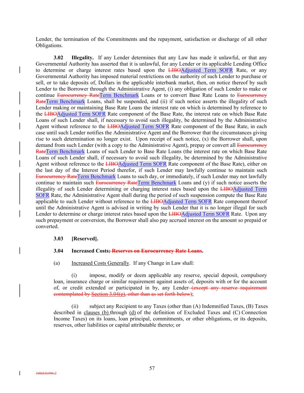Lender, the termination of the Commitments and the repayment, satisfaction or discharge of all other Obligations. 3.02 Illegality. If any Lender determines that any Law has made it unlawful, or that any Governmental Authority has asserted that it is unlawful, for any Lender or its applicable Lending Office to determine or charge interest rates based upon the LIBOAdjusted Term SOFR Rate, or any Governmental Authority has imposed material restrictions on the authority of such Lender to purchase or sell, or to take deposits of, Dollars in the applicable interbank market, then, on notice thereof by such Lender to the Borrower through the Administrative Agent, (i) any obligation of such Lender to make or continue Eurocurrency RateTerm Benchmark Loans or to convert Base Rate Loans to Eurocurrency RateTerm Benchmark Loans, shall be suspended, and (ii) if such notice asserts the illegality of such Lender making or maintaining Base Rate Loans the interest rate on which is determined by reference to the LIBOAdjusted Term SOFR Rate component of the Base Rate, the interest rate on which Base Rate Loans of such Lender shall, if necessary to avoid such illegality, be determined by the Administrative Agent without reference to the LIBOAdjusted Term SOFR Rate component of the Base Rate, in each case until such Lender notifies the Administrative Agent and the Borrower that the circumstances giving rise to such determination no longer exist. Upon receipt of such notice, (x) the Borrower shall, upon demand from such Lender (with a copy to the Administrative Agent), prepay or convert all Eurocurrency RateTerm Benchmark Loans of such Lender to Base Rate Loans (the interest rate on which Base Rate Loans of such Lender shall, if necessary to avoid such illegality, be determined by the Administrative Agent without reference to the LIBOAdjusted Term SOFR Rate component of the Base Rate), either on the last day of the Interest Period therefor, if such Lender may lawfully continue to maintain such Eurocurrency RateTerm Benchmark Loans to such day, or immediately, if such Lender may not lawfully continue to maintain such Eurocurrency RateTerm Benchmark Loans and (y) if such notice asserts the illegality of such Lender determining or charging interest rates based upon the LIBOAdjusted Term SOFR Rate, the Administrative Agent shall during the period of such suspension compute the Base Rate applicable to such Lender without reference to the LIBOAdjusted Term SOFR Rate component thereof until the Administrative Agent is advised in writing by such Lender that it is no longer illegal for such Lender to determine or charge interest rates based upon the LIBOAdjusted Term SOFR Rate. Upon any such prepayment or conversion, the Borrower shall also pay accrued interest on the amount so prepaid or converted. 3.03 [Reserved]. 3.04 Increased Costs; Reserves on Eurocurrency Rate Loans. (a) Increased Costs Generally. If any Change in Law shall: (i) impose, modify or deem applicable any reserve, special deposit, compulsory loan, insurance charge or similar requirement against assets of, deposits with or for the account of, or credit extended or participated in by, any Lender (except any reserve requirement contemplated by Section 3.04(e), other than as set forth below); (ii) subject any Recipient to any Taxes (other than (A) Indemnified Taxes, (B) Taxes described in clauses (b) through (d) of the definition of Excluded Taxes and (C) Connection Income Taxes) on its loans, loan principal, commitments, or other obligations, or its deposits, reserves, other liabilities or capital attributable thereto; or 57 1006836498v2